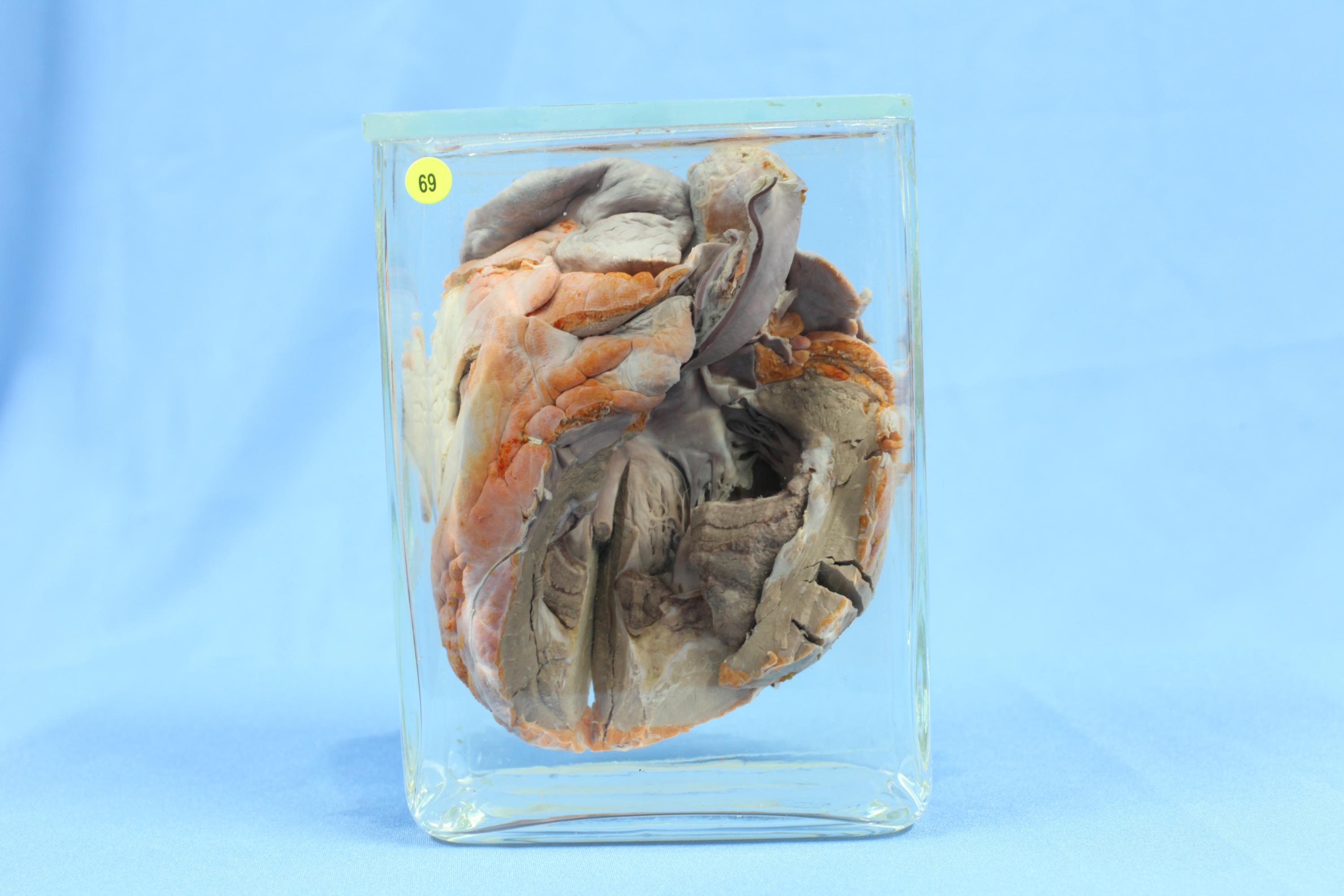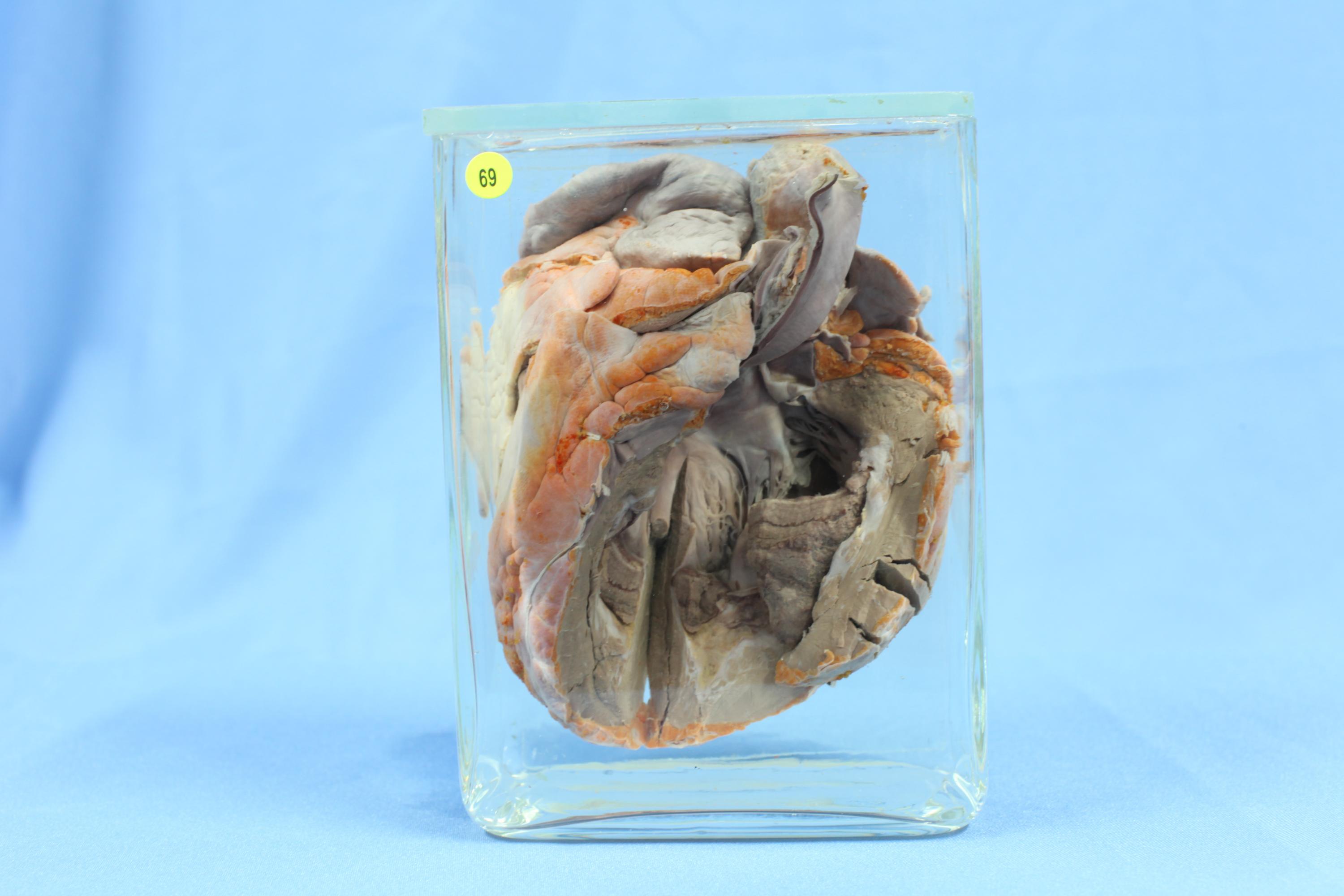 患者女性,39岁,心力衰竭. 心脏标本,左心已打开。见左心室肌显著肥厚,心室扩大,心尖圆钝,心脏如球状。心外膜脂肪因氧化而呈红色,心内膜表面因弹力纤维增生增厚。部分内膜呈乳白色。同时,心室内壁中央可见有一个灰褐色附壁血栓形成,向腔内略隆起。