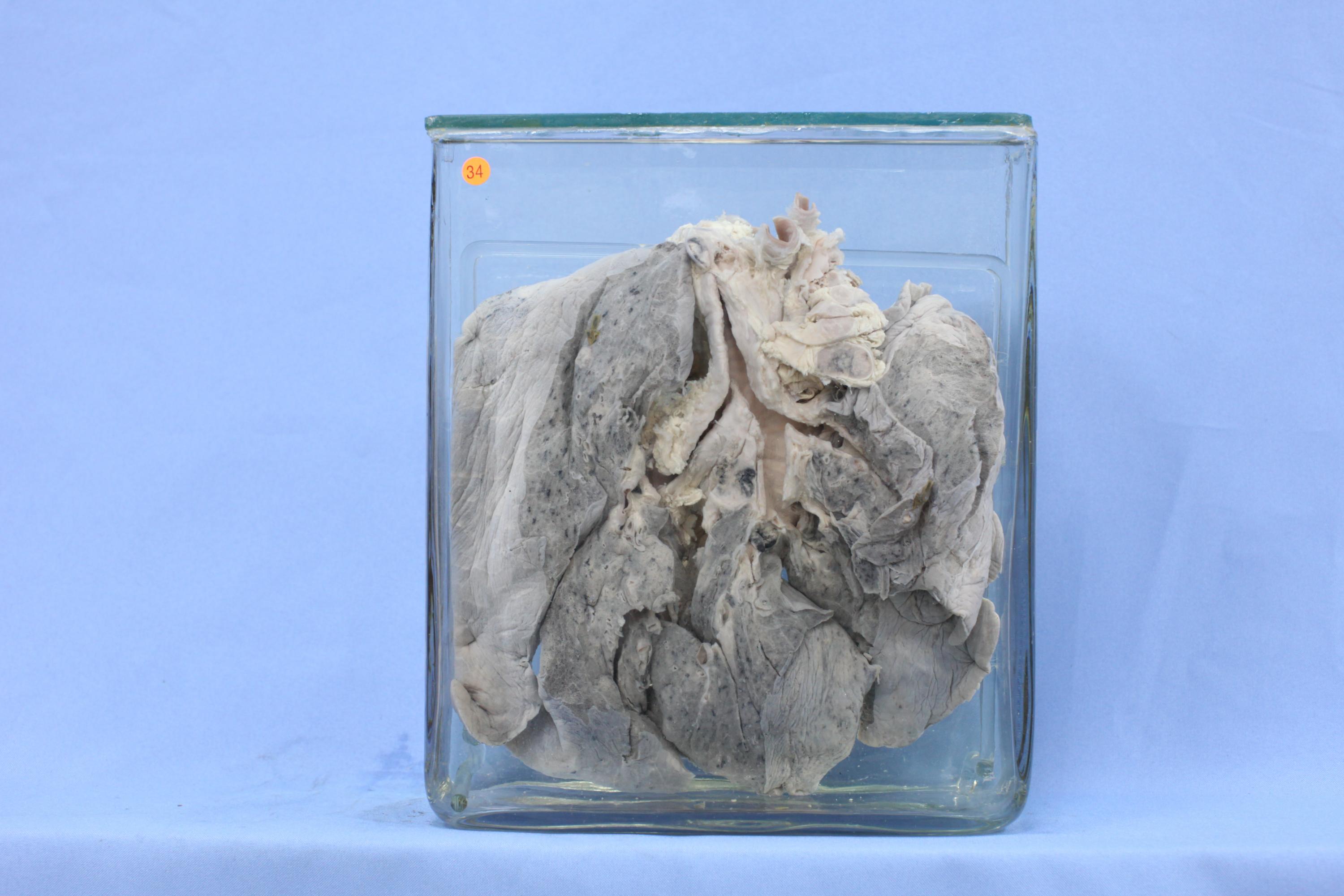 死者为老年男性,有“结核病史”,死亡原因“小叶性肺炎”。 肺组织上叶下部近胸膜处见一黄豆大小的干酪样坏死病灶,其色灰黄、质致密、干燥,边缘可有纤维包膜,相应的支气管周围淋巴结有多个明显肿大,切面见干酪样坏死改变(结核性淋巴管炎在标本中往往不易查见)。肺组织切面亦见散在分布的粟粒样、灰白略带黄色的小结节,分布弥漫均匀,大小一致,形态相似。