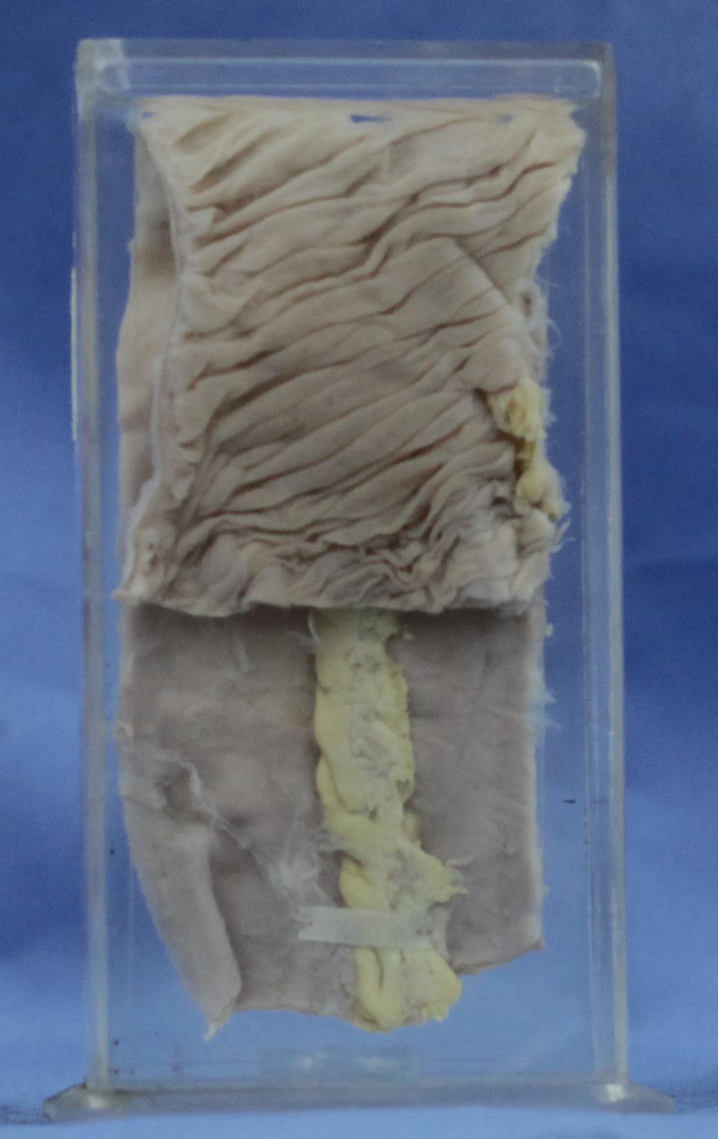 肠壁肿胀、增厚,浆膜面光滑,粘膜鼓起,其色苍白而光亮,切面见粘膜下层结构疏松,似海绵样。