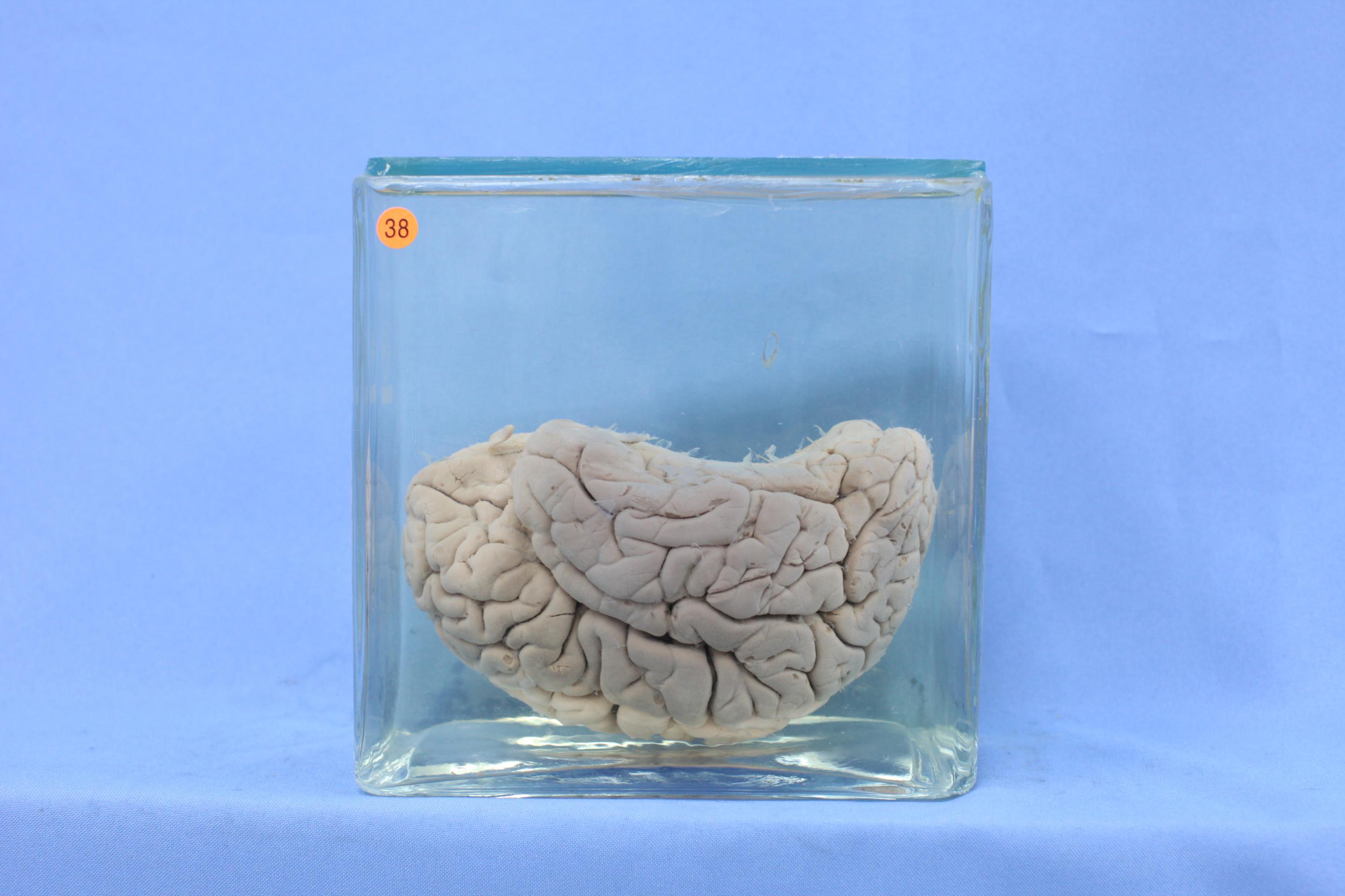 大脑标本(蛛网膜及软脑膜已被剥除),两半球对称,脑回变窄,脑沟变深、变宽,尤以额叶为明显。本例脑萎缩系脑动脉硬化所致。