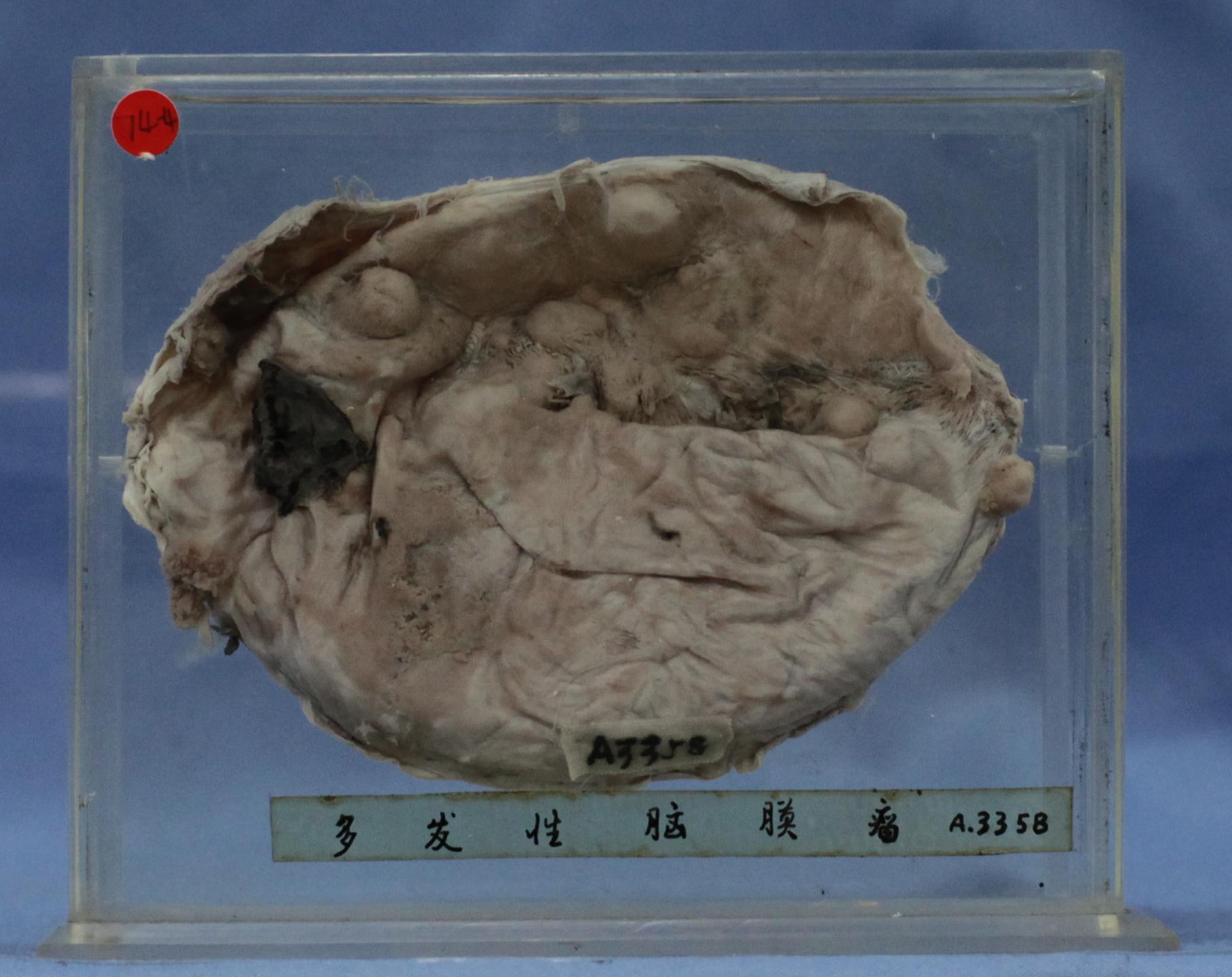 脑膜上可见直径0.5-1cm多个瘤体结节。