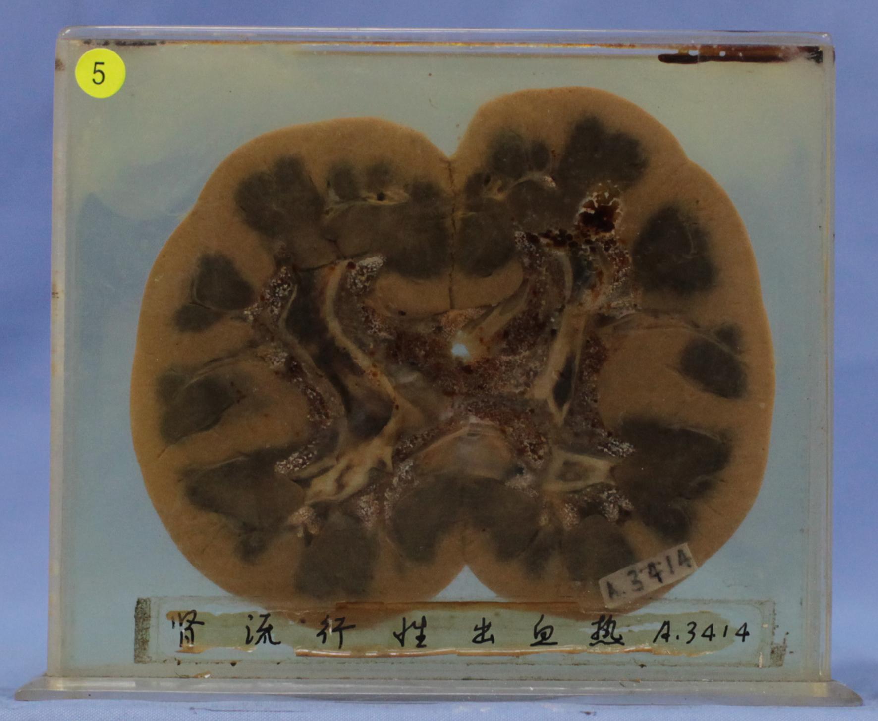 患者男性, 37岁。肾脏体积增大,表面可见充血。切面肿胀,边缘外翻,皮质苍白,髓质高度充血,呈暗紫红色,肾盂粘膜有片状出血。