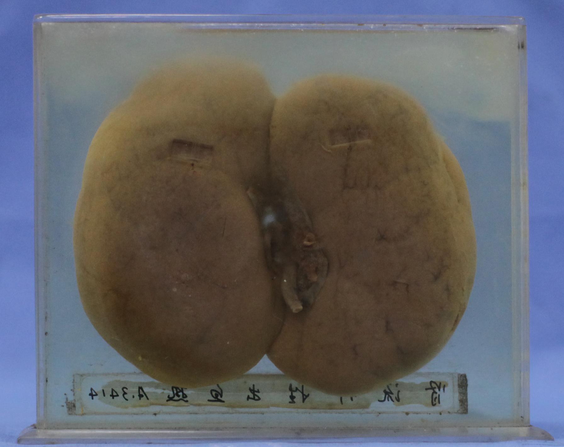 患者男性, 37岁。肾脏体积增大,表面可见充血。切面肿胀,边缘外翻,皮质苍白,髓质高度充血,呈暗紫红色,肾盂粘膜有片状出血。