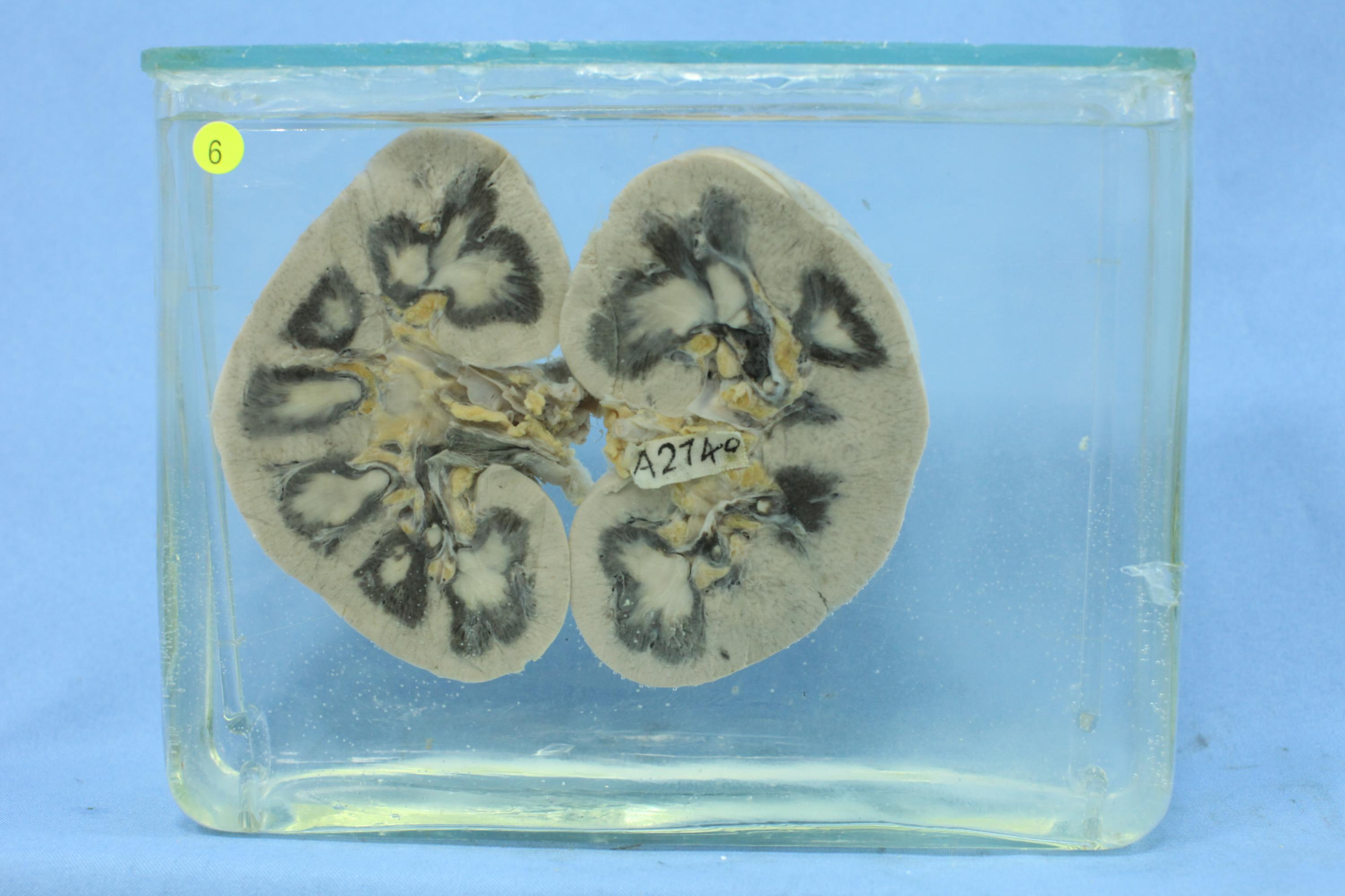 患者男性, 35岁。肾脏肿胀,切面见皮质增厚,皮髓交界处明显充血,而皮质及锥体处均显相对苍白。