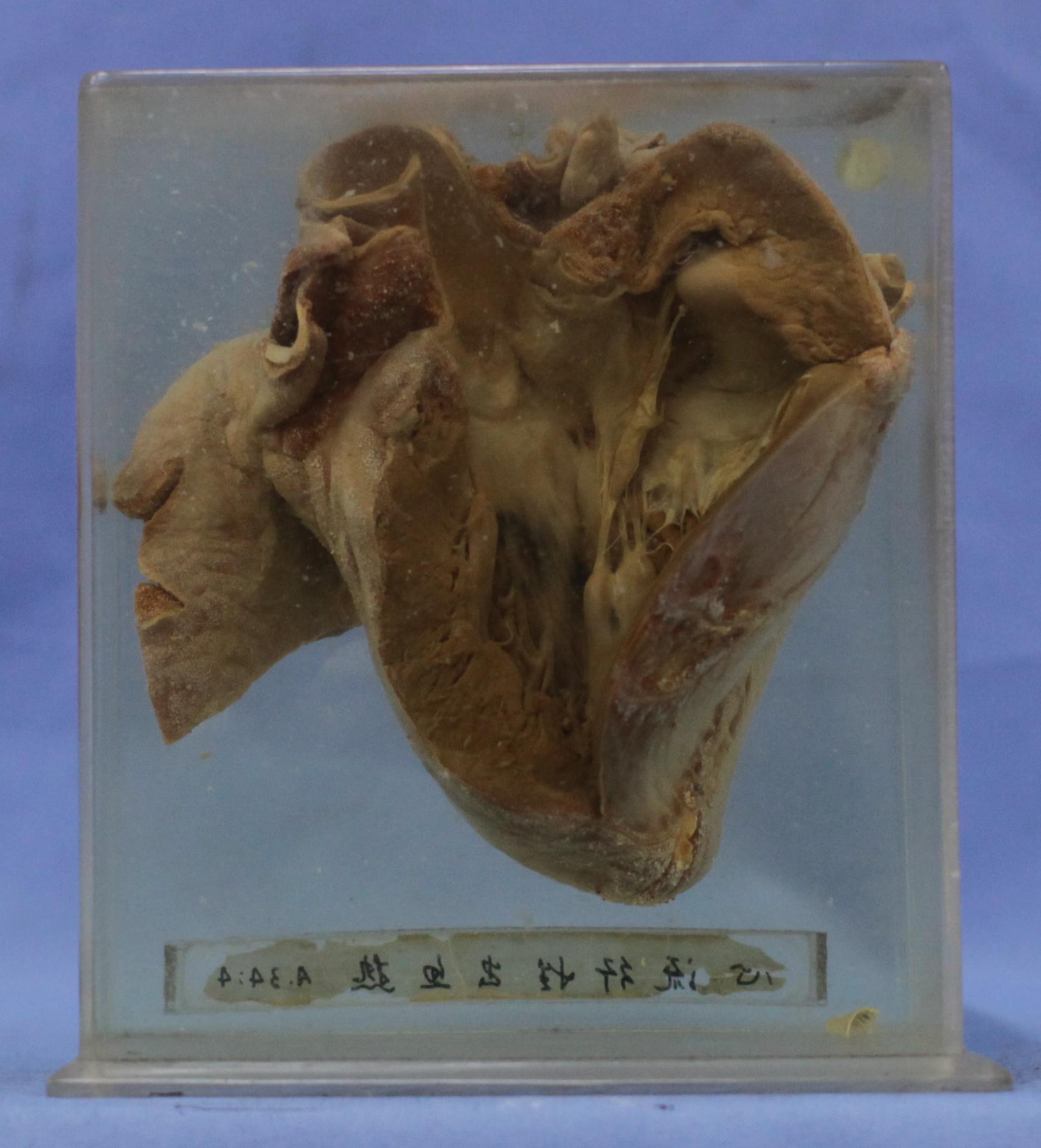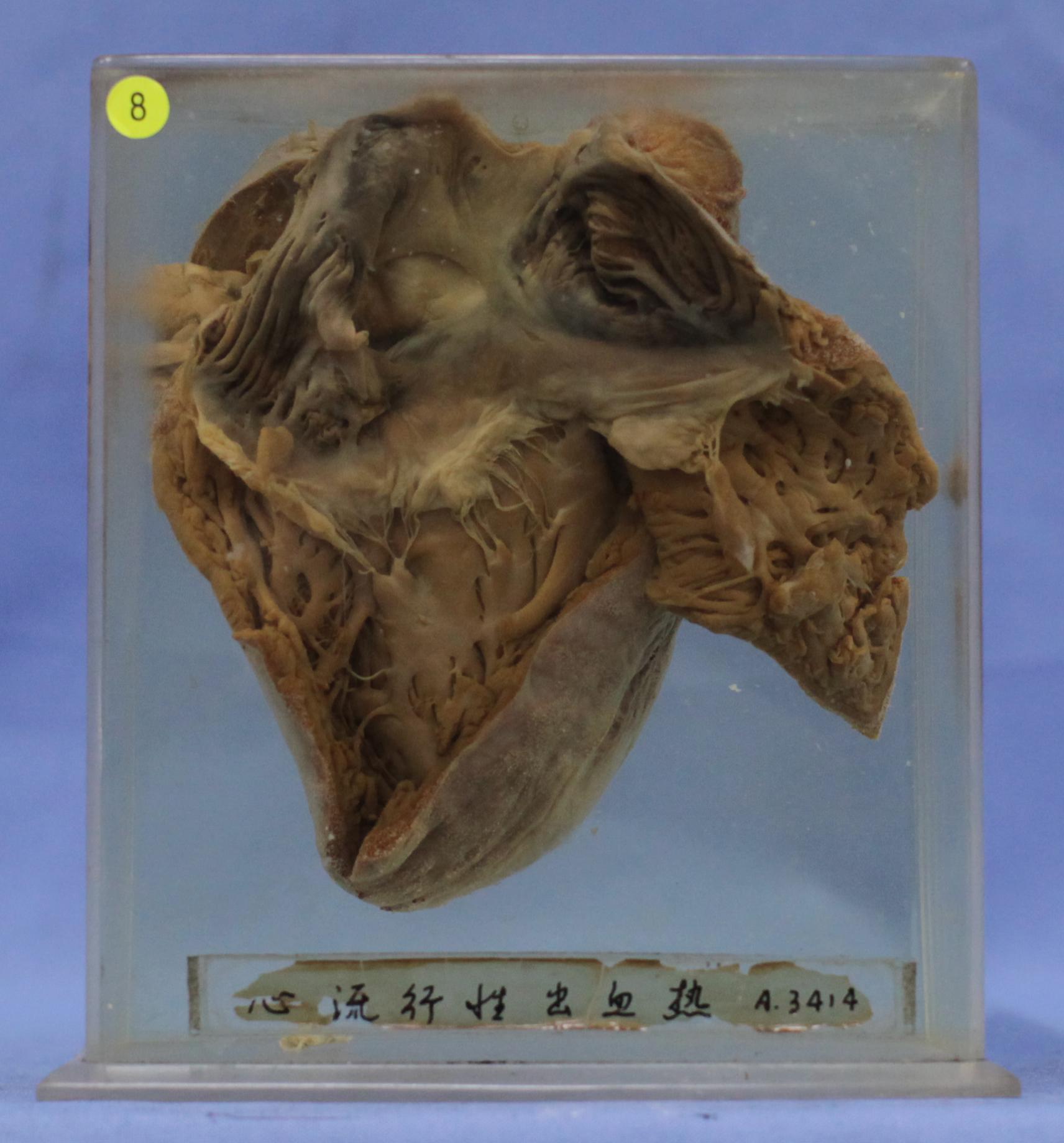 患者男性, 37岁,右心房有特征性内膜下大片状出血灶。