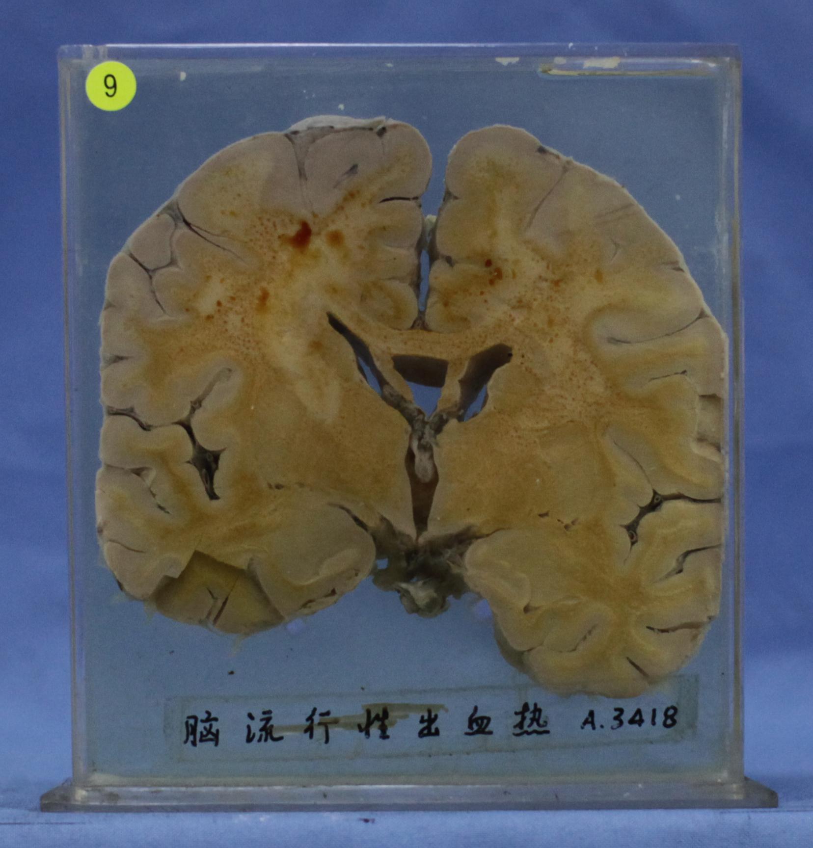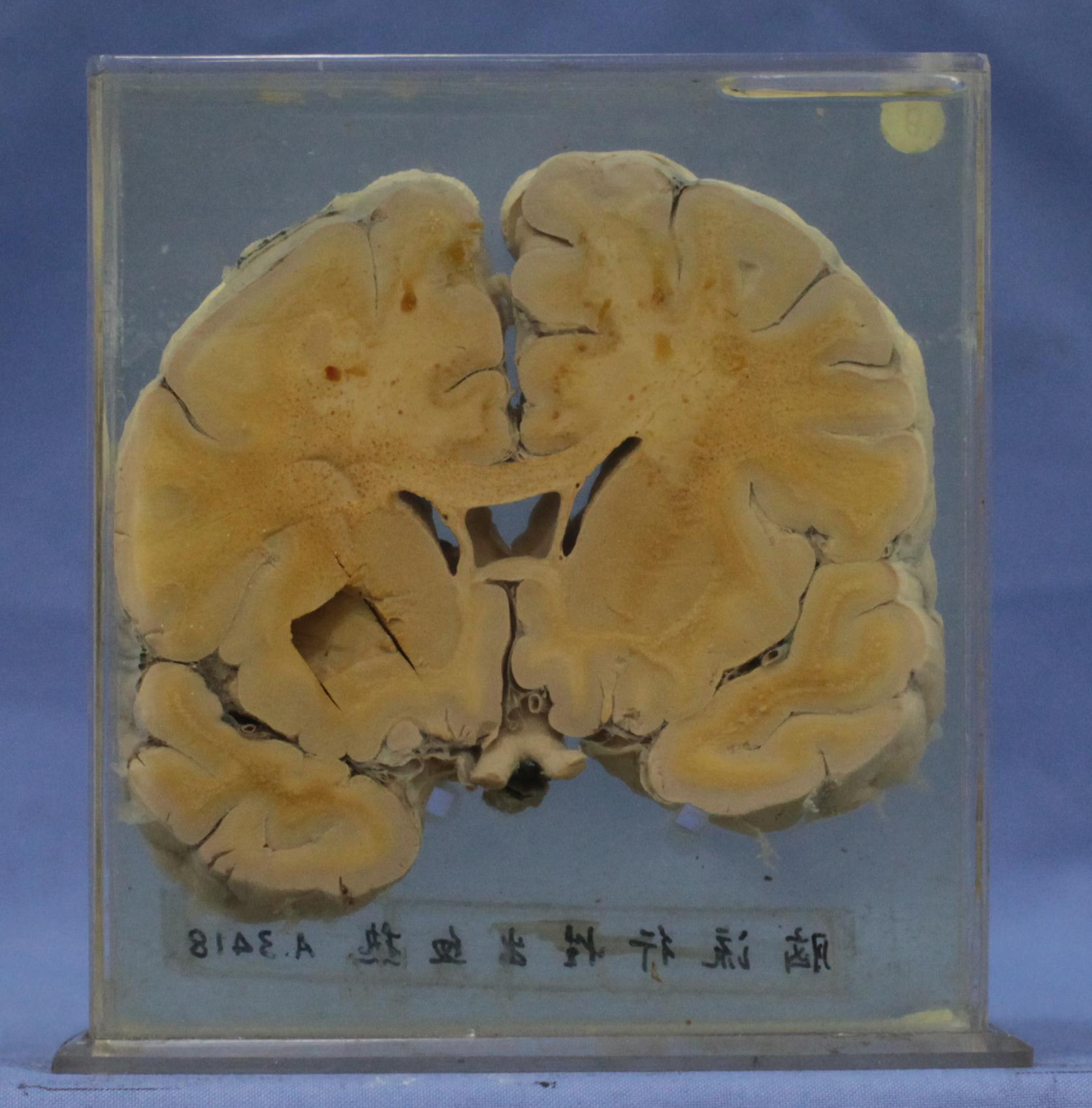 患者男性, 35岁, 大脑冠状切面,左大脑半球明显萎缩,左基底上方周围白质脱髓鞘,右侧胼胝体周围脱髓鞘病变较轻,脑膜血管扩张充血。