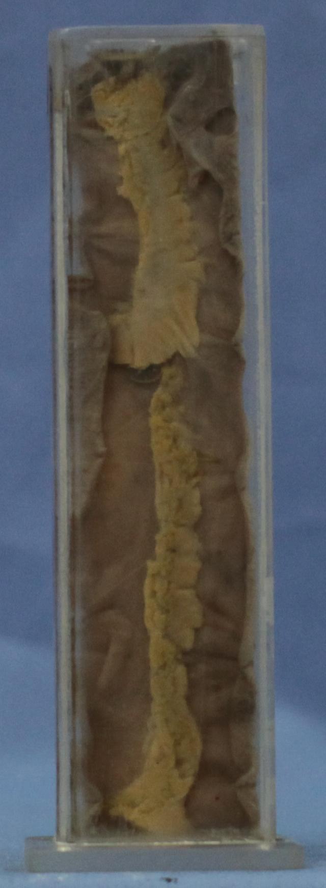 回肠一段,肠壁菲薄,萎缩状,粘膜面见肿大之集合淋巴小结及孤立淋巴滤泡,形成椭圆形或圆形隆起,其长轴平行于肠之长轴。肿胀的集合淋巴小结的表面凹凸不平,形如脑回,孤立淋巴滤泡则呈较小的圆形隆起。