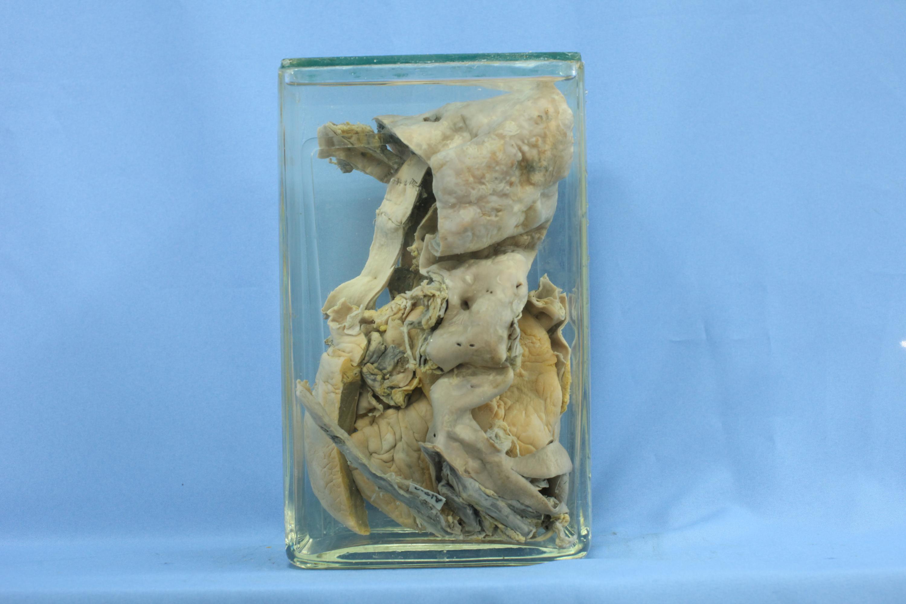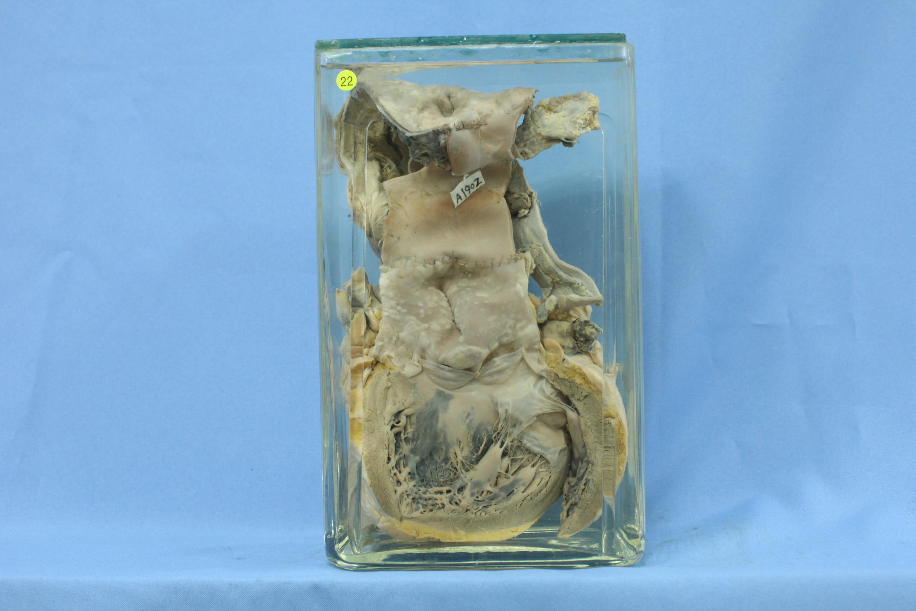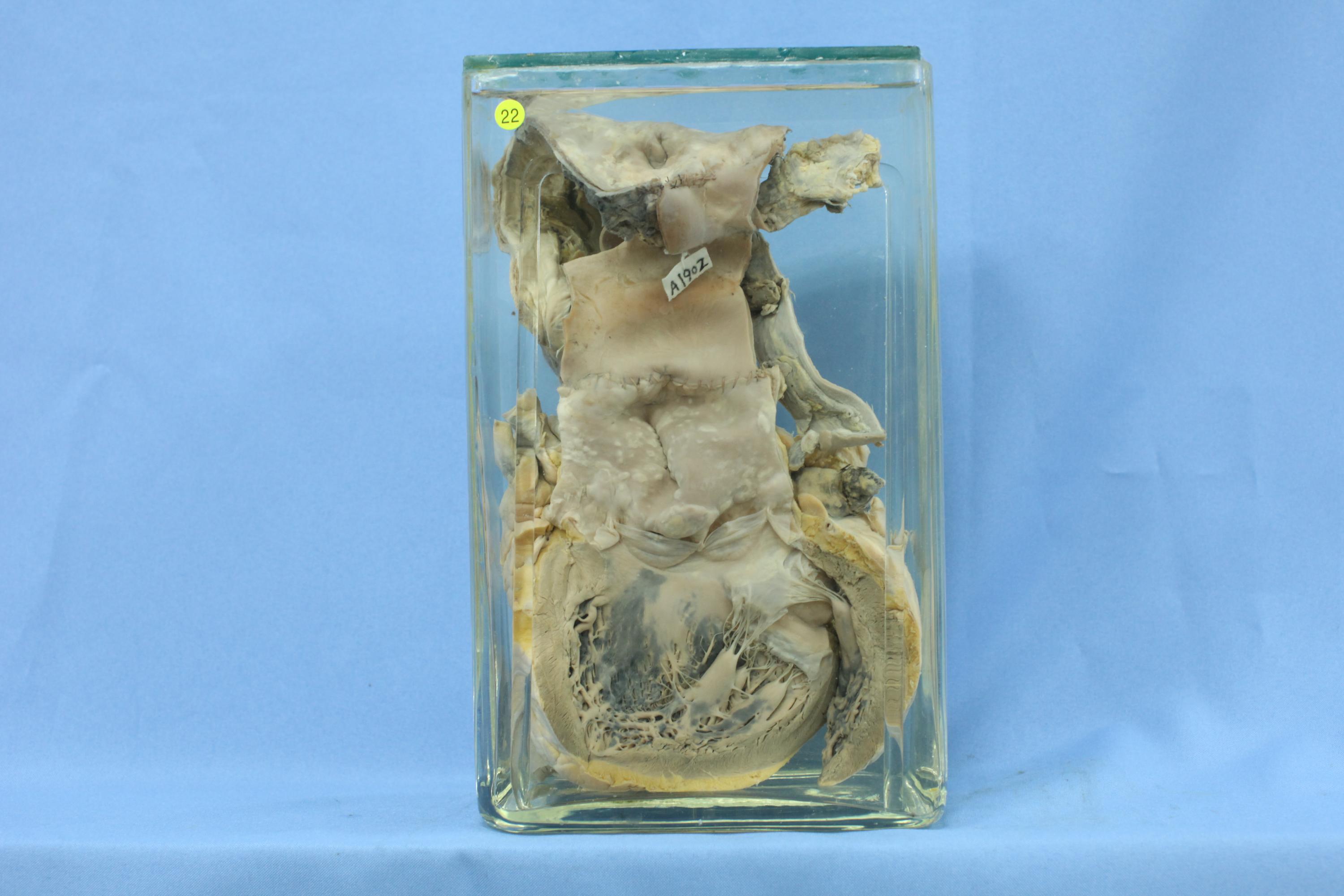 患者男性, 57岁,主动脉瓣移植,梅毒性主动脉炎。升主动脉内膜粗糙不平,呈树皮样,其皱纹粗细、长短及疏密不一。主动脉瓣瓣页略有分离且增厚。主动脉内膜同时伴有粥样硬化病变,包括脂质条纹、斑块、溃疡及钙化,病变以主动脉下段为重。此外,左心室明显肥厚扩张,心内膜下出血灶。