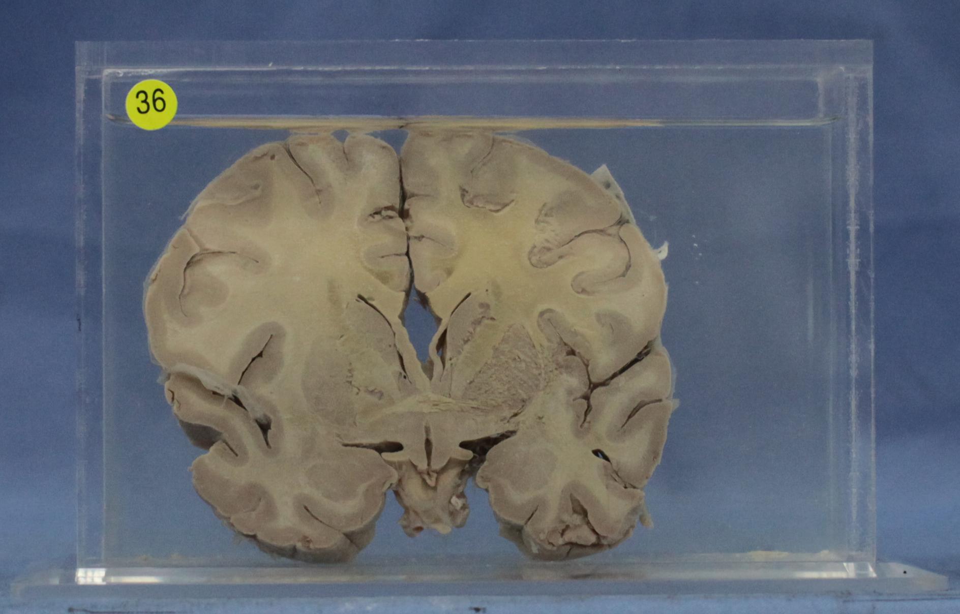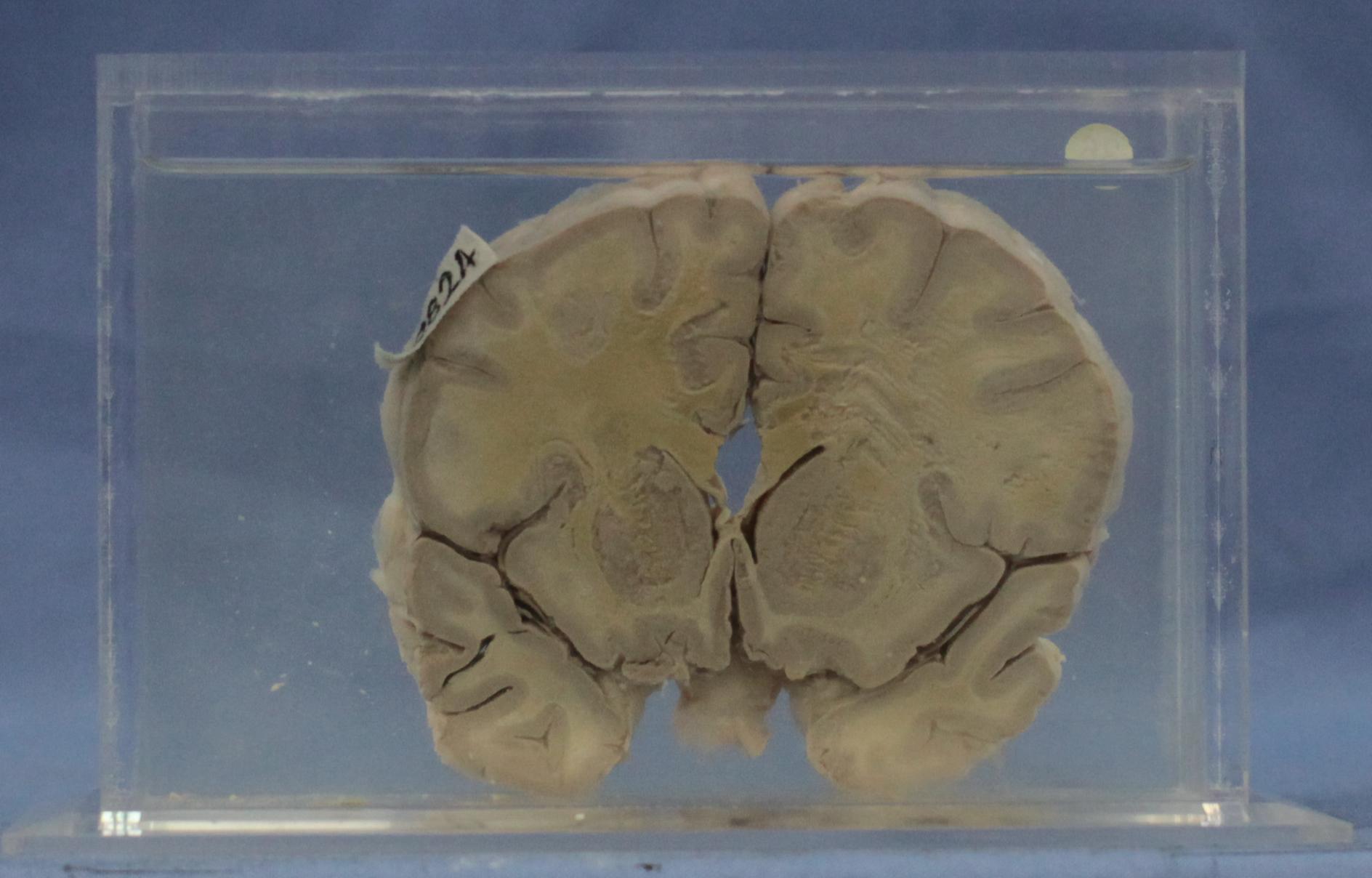 患者女性,12岁。脑的冠状切面,脑灰质(或基底核)及脑灰、白质交界处有许多白色略呈透明的点状软化灶,脑膜血管扩张充血。