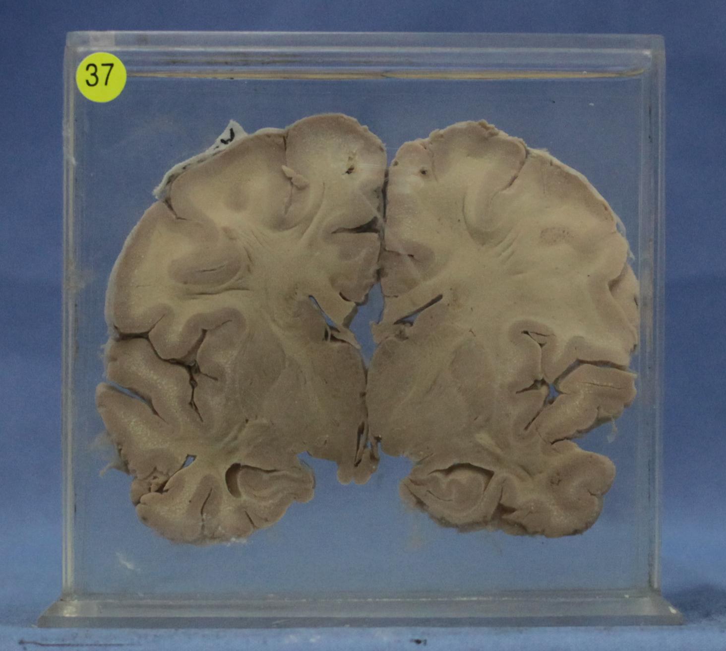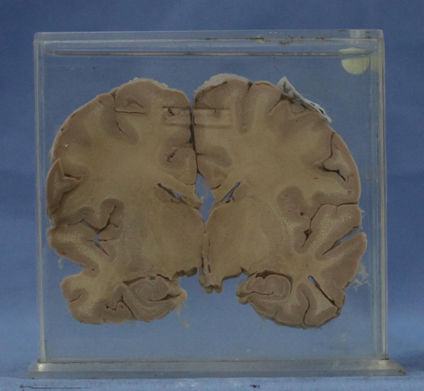 患者女性,12岁。脑组织软脑膜充血、水肿,脑回变宽,脑沟变浅。脑的冠状切面可见脑实质内有散在出血点和针尖大小的脑组织液化性坏死灶。