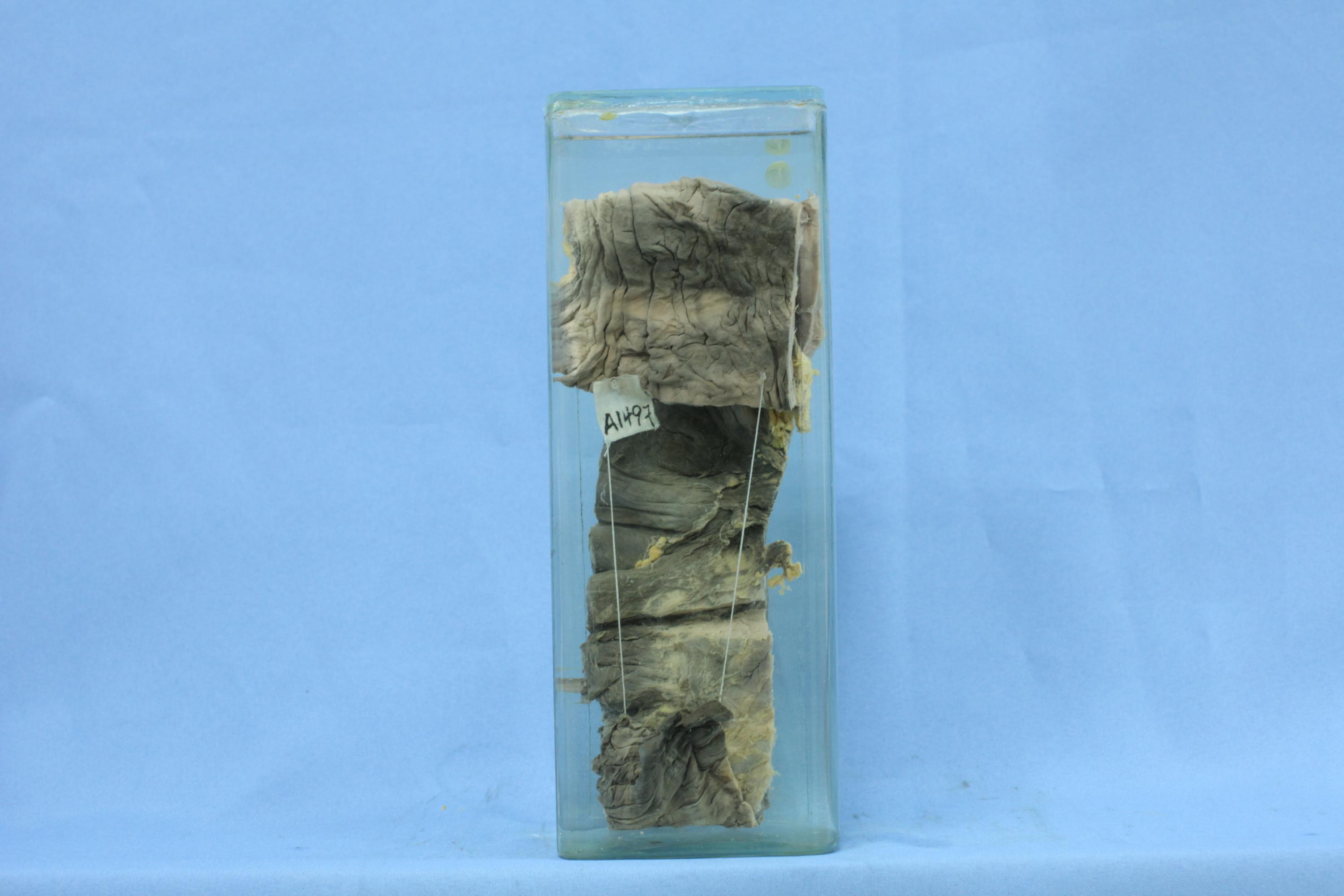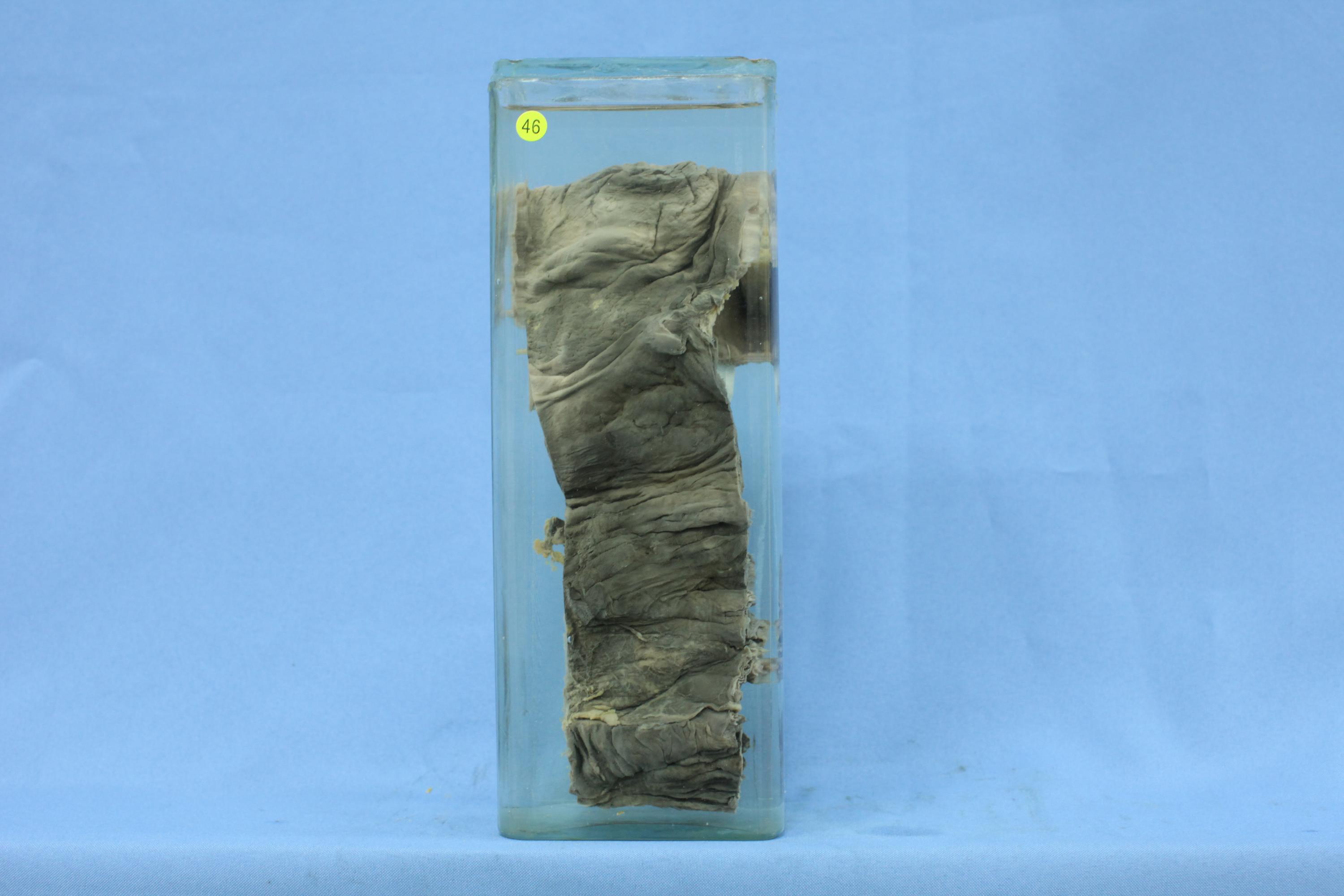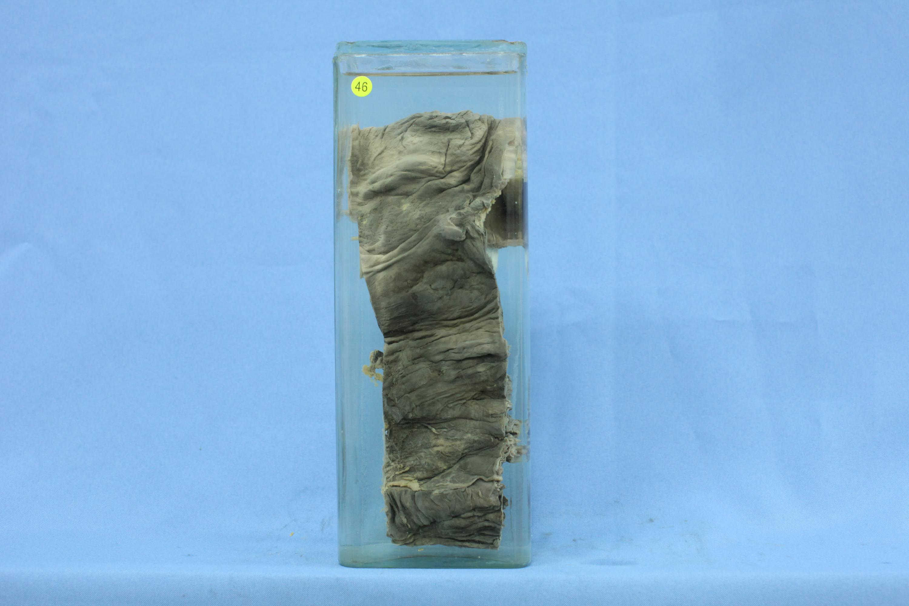小肠标本。病变处肠壁肿胀、增厚,呈暗红或黑褐色,浆膜面干燥而粗糙,有少量纤维蛋白渗出。粘膜皱襞肿胀、无光泽,部分区域粘膜表层已脱落,部分粘膜皱襞间有灰白色物覆盖。