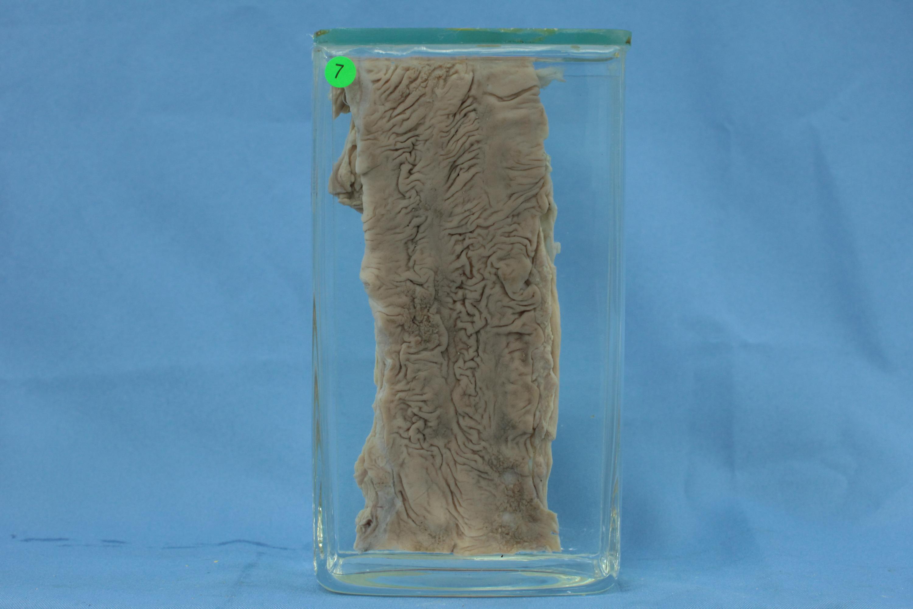 患者男性,11个月,结肠炎。结肠粘膜面有散在的不规则小溃疡。溃疡边缘不整齐,底部带黄色,部分粘膜表面呈细颗粒状隆起,灰褐色,状似砂粒。