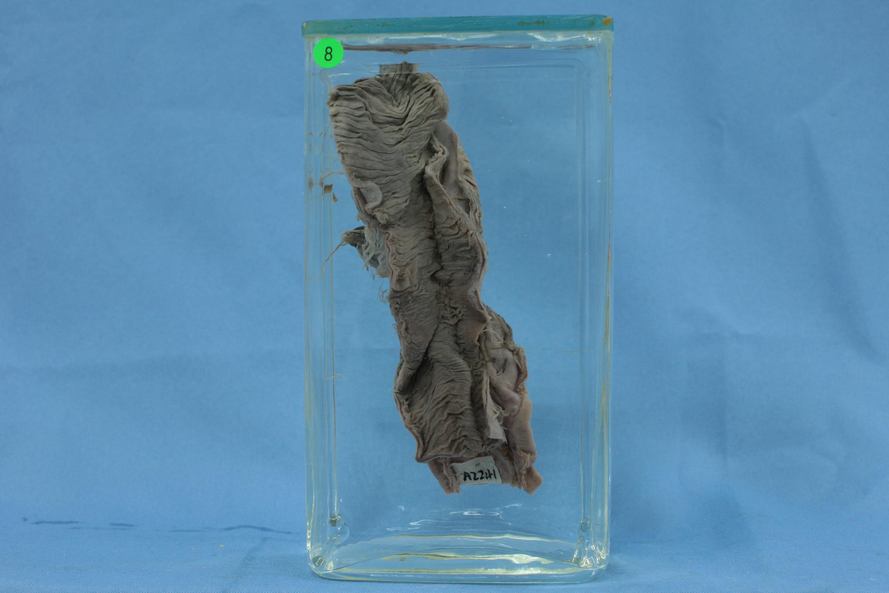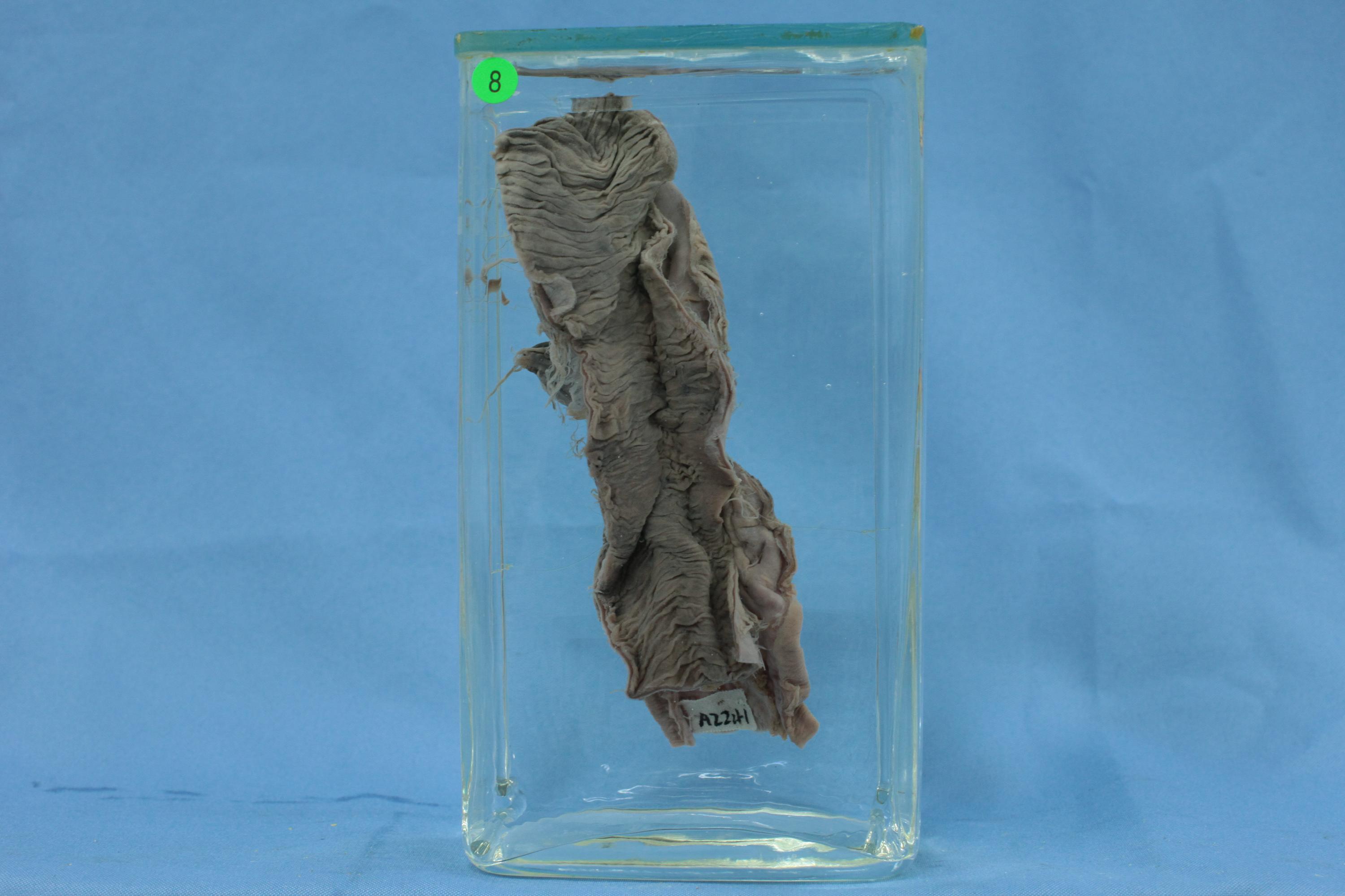 结肠组织,部分粘膜脱落形成溃疡,粘膜下层有大量虫卵沉积,有的虫卵内见紫蓝色小圆点为毛蚴的卵黄颗粒,此为成熟虫卵,其卵壳表面大多覆有一层放射状伊红色物质,周围有多量酸性粒细胞浸润,并有坏死,形成嗜酸性脓肿。少数虫卵周围有多核巨细胞、类上皮细胞和淋巴细胞浸润,形成假结核结节,有的已开始纤维化。其余部分肠粘膜下层血管弥漫性充血、水肿,并有散在酸性粒细胞浸润。