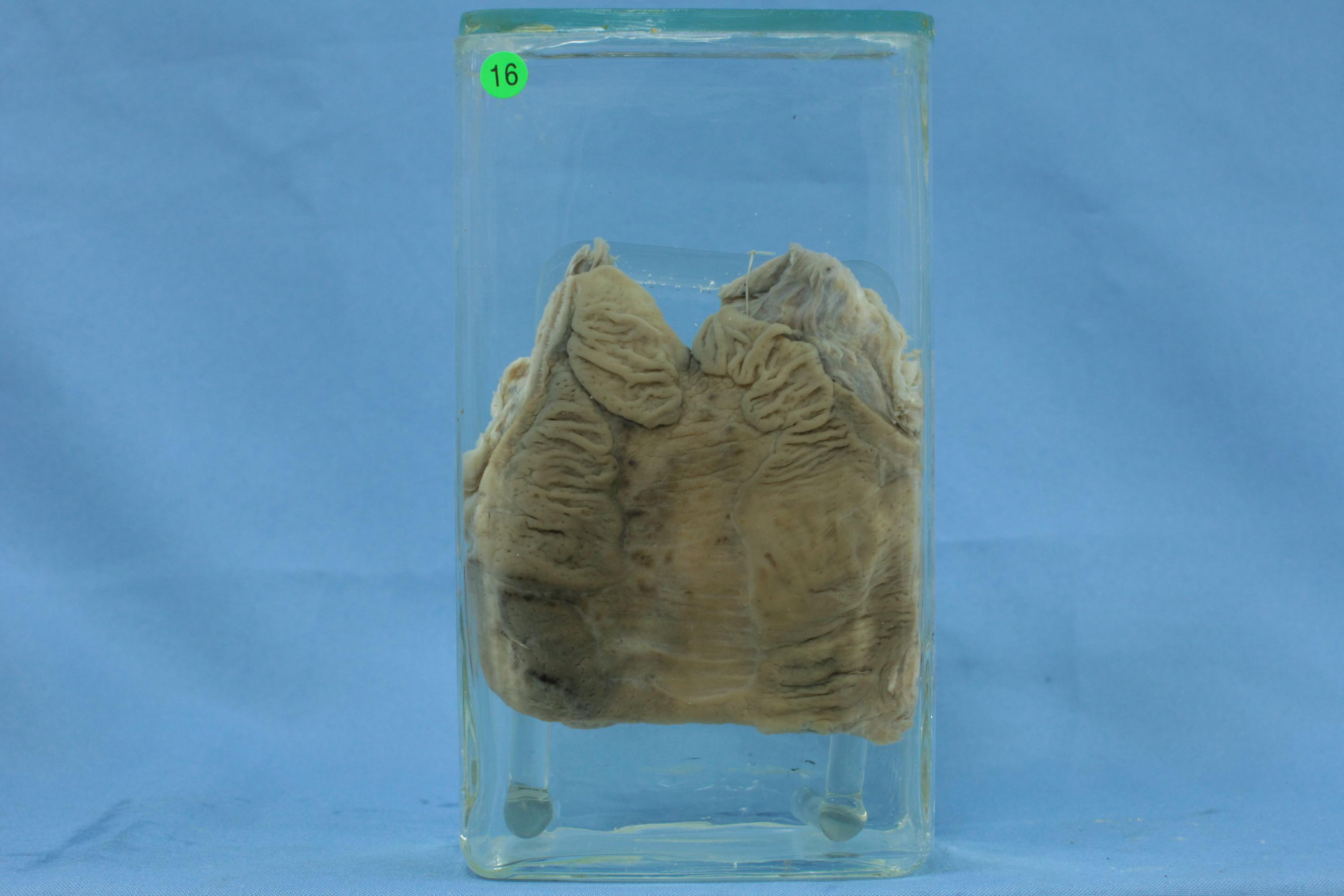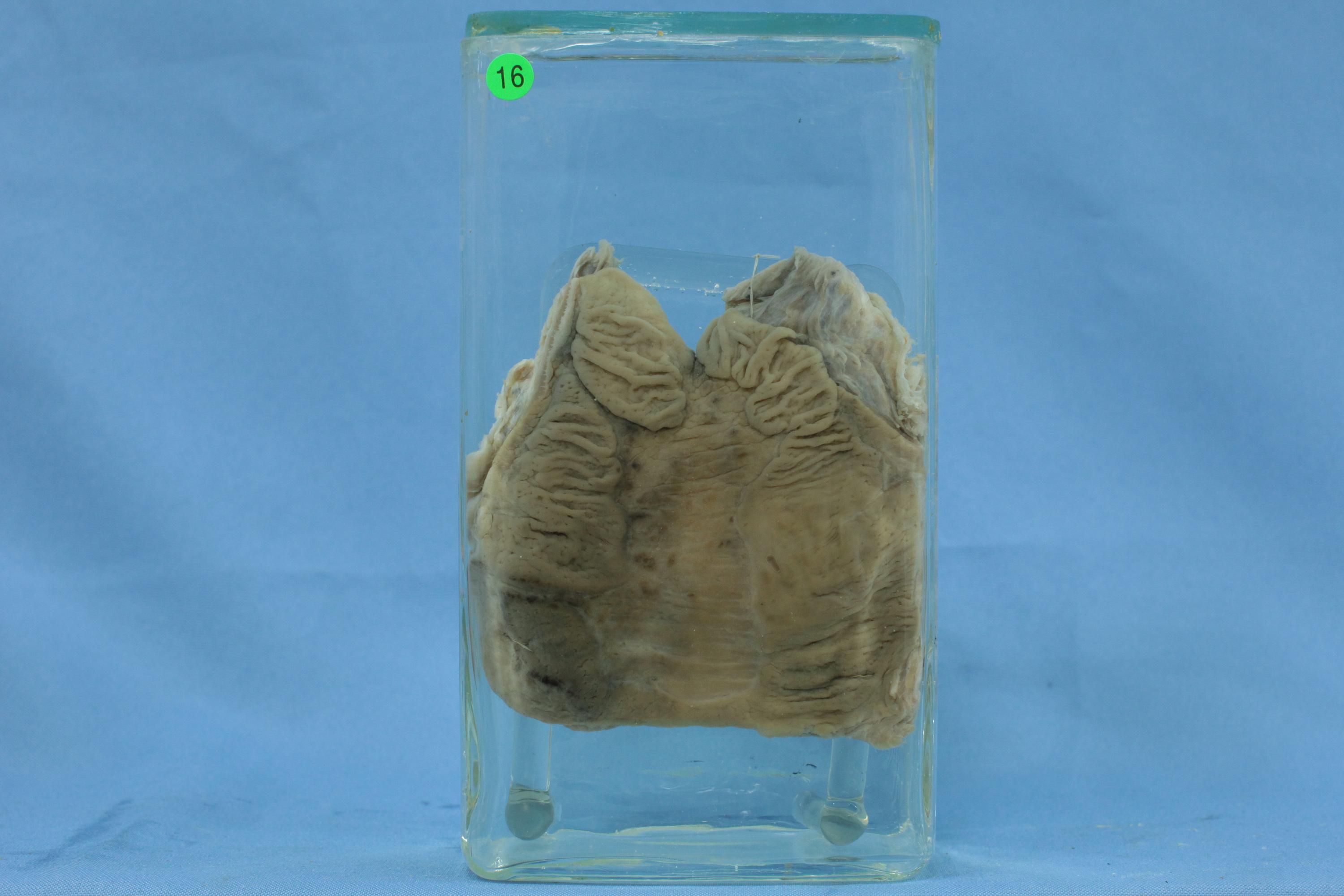 患者男性,35岁,日本血吸虫病+癌变。肠壁明显增厚,部分粘膜萎缩变平,部分区域表面隆起,其上伴有出血坏死。