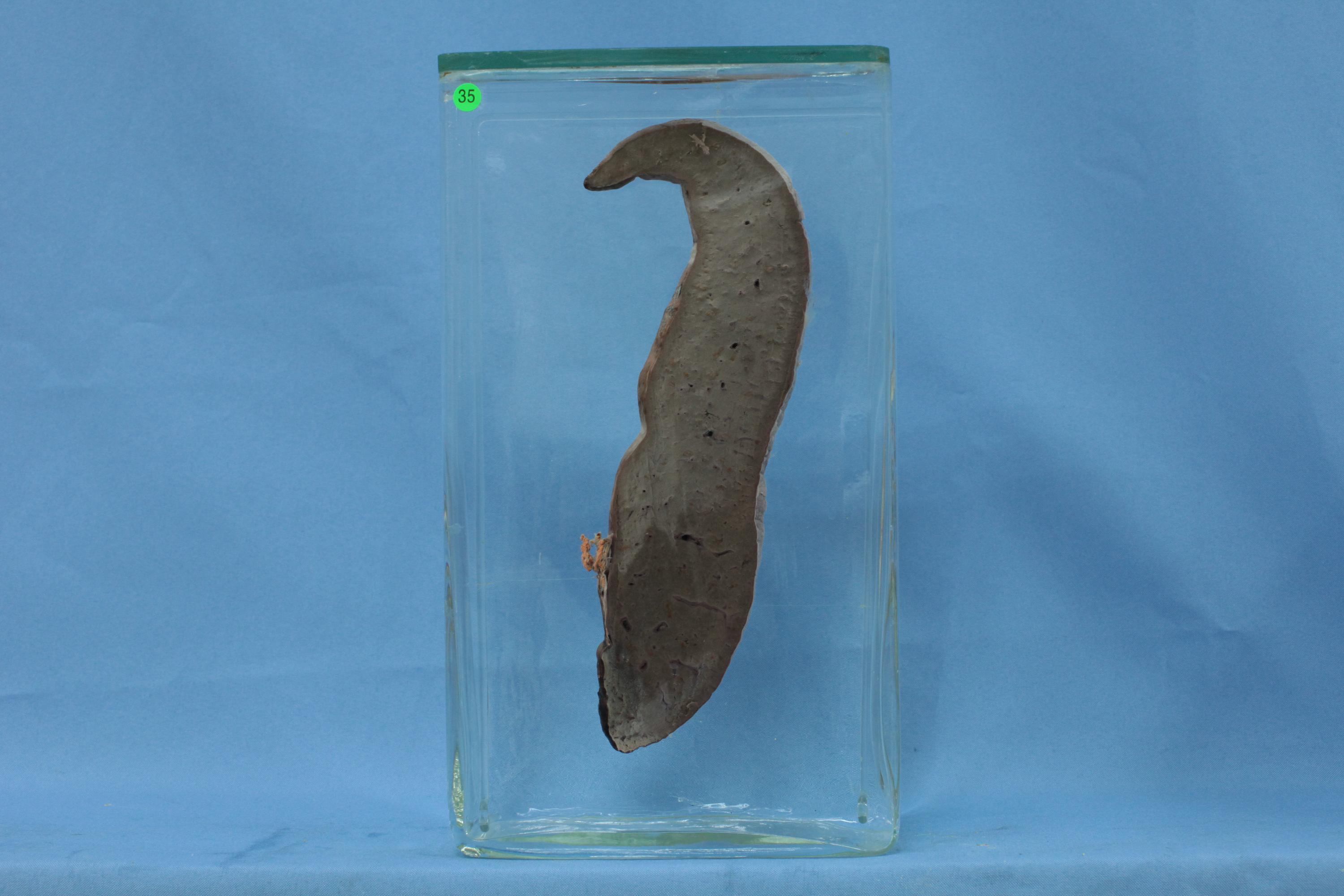 患者男性,67岁,感染性休克,脾脏体积明显增大,包膜增厚似糖衣。切面呈紫褐色,小梁明显。有散在铁锈色斑点(含铁血黄素结节)。