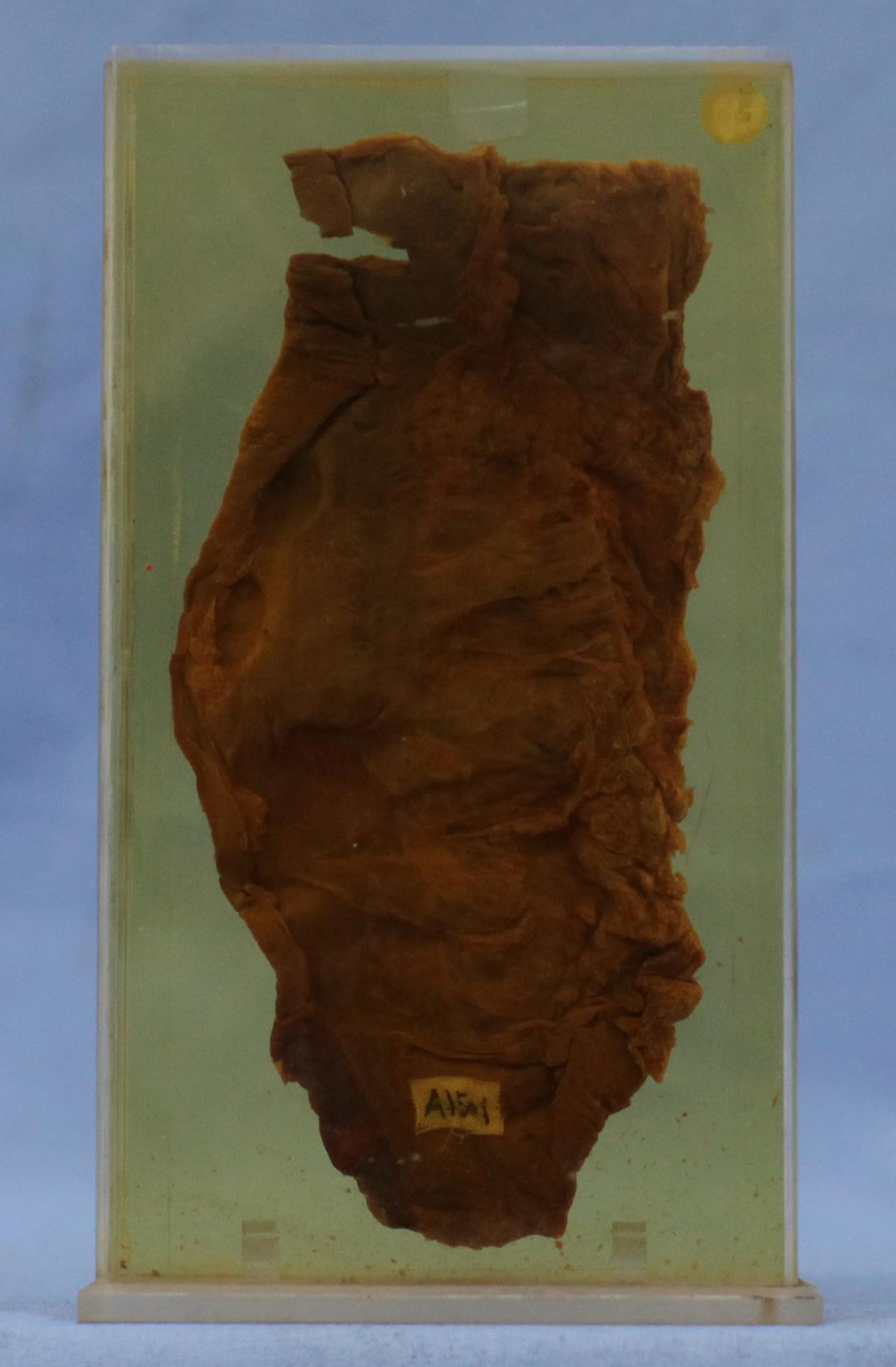 患者男性,27岁,肠伤寒穿孔。结肠一段,粘膜面可见多个散在的圆形或椭圆形溃疡,溃疡表面有灰黄色坏死物,其周围粘膜充血。切面见溃疡口窄底宽,呈潜行性,底及边缘不整齐并附有絮状坏死物质。溃疡之间的粘膜仍属正常。