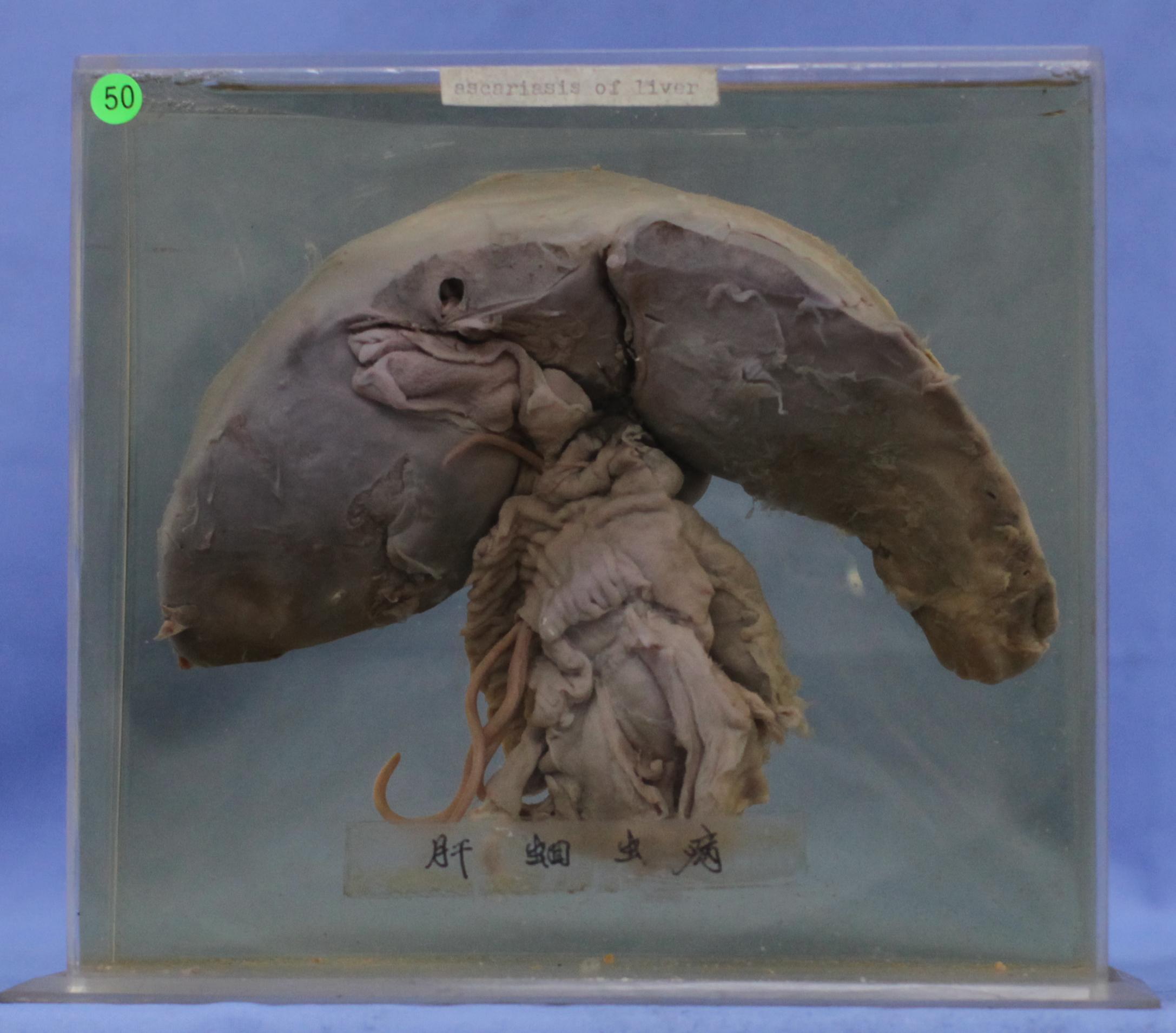 患者男性,7岁,蛔虫经Vater壶腹穿入胆囊及肝脏并引起脓肿及腹膜炎。肝脏标本,见蛔虫充塞于胆总管、肝管和胆囊管。