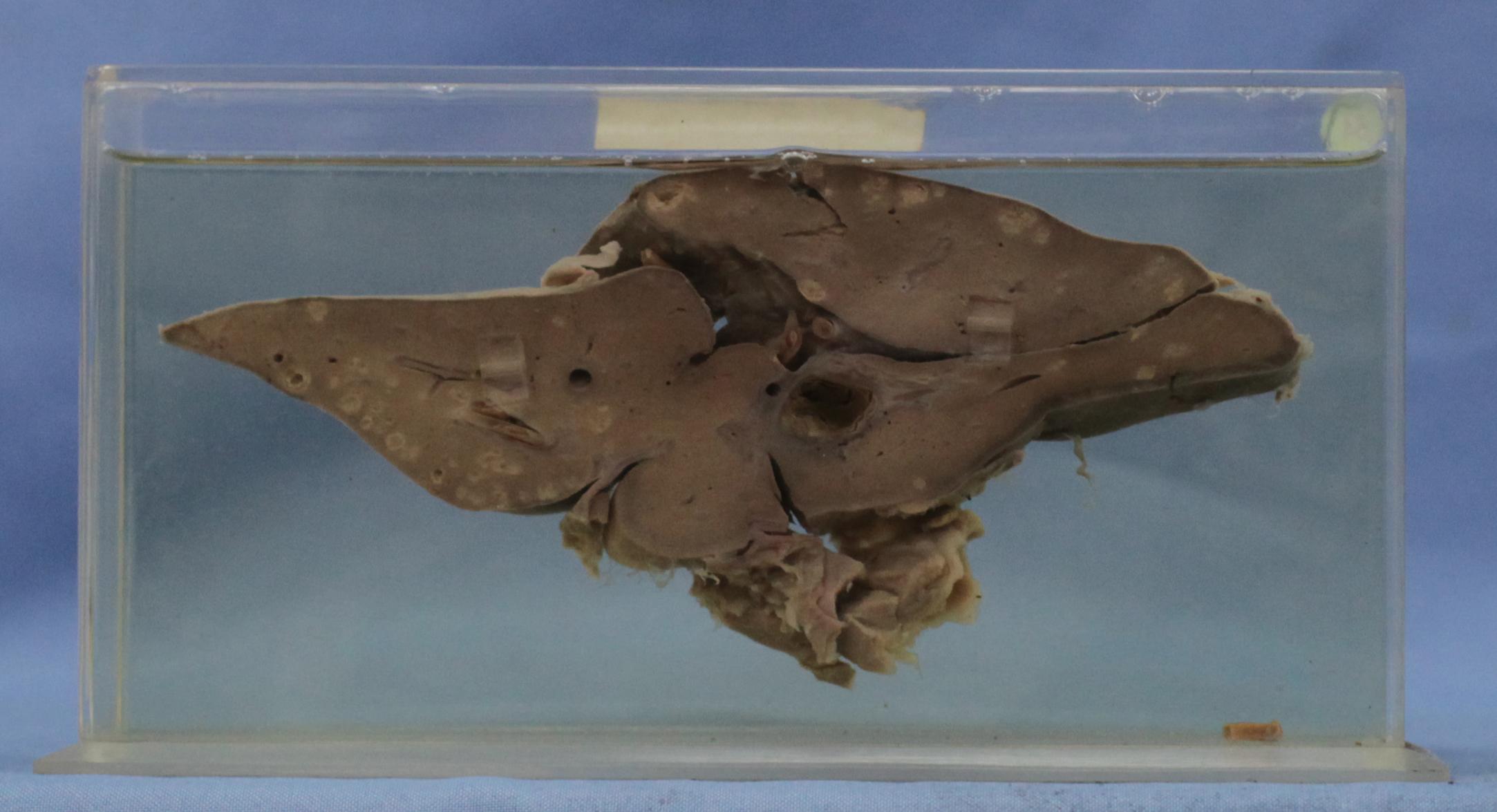 患者男性,87岁。肝脏切面见胆管分支内嵌塞着蛔虫虫体。