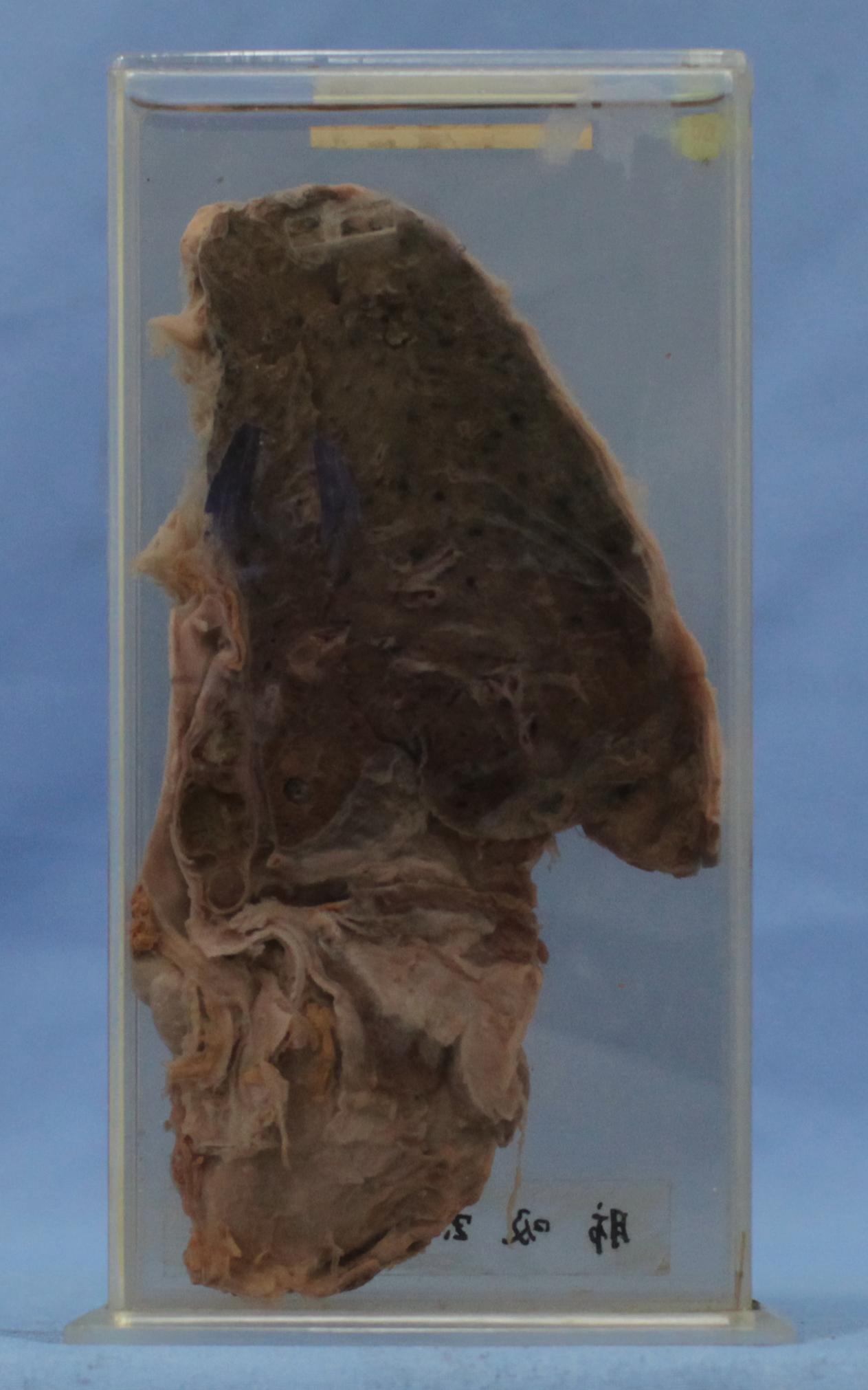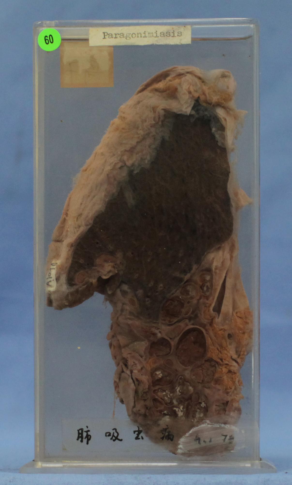 患者男性,26岁,肺吸虫病(脊髓型,脑型,全身型)。虫体移行穿破肺组织引起出血和组织坏死形成脓肿。脓肿周围纤维组织增生形成纤维囊壁,内含褐色果酱状粘稠液体。囊肿与囊肿之间可见“隧道”或“窟穴”