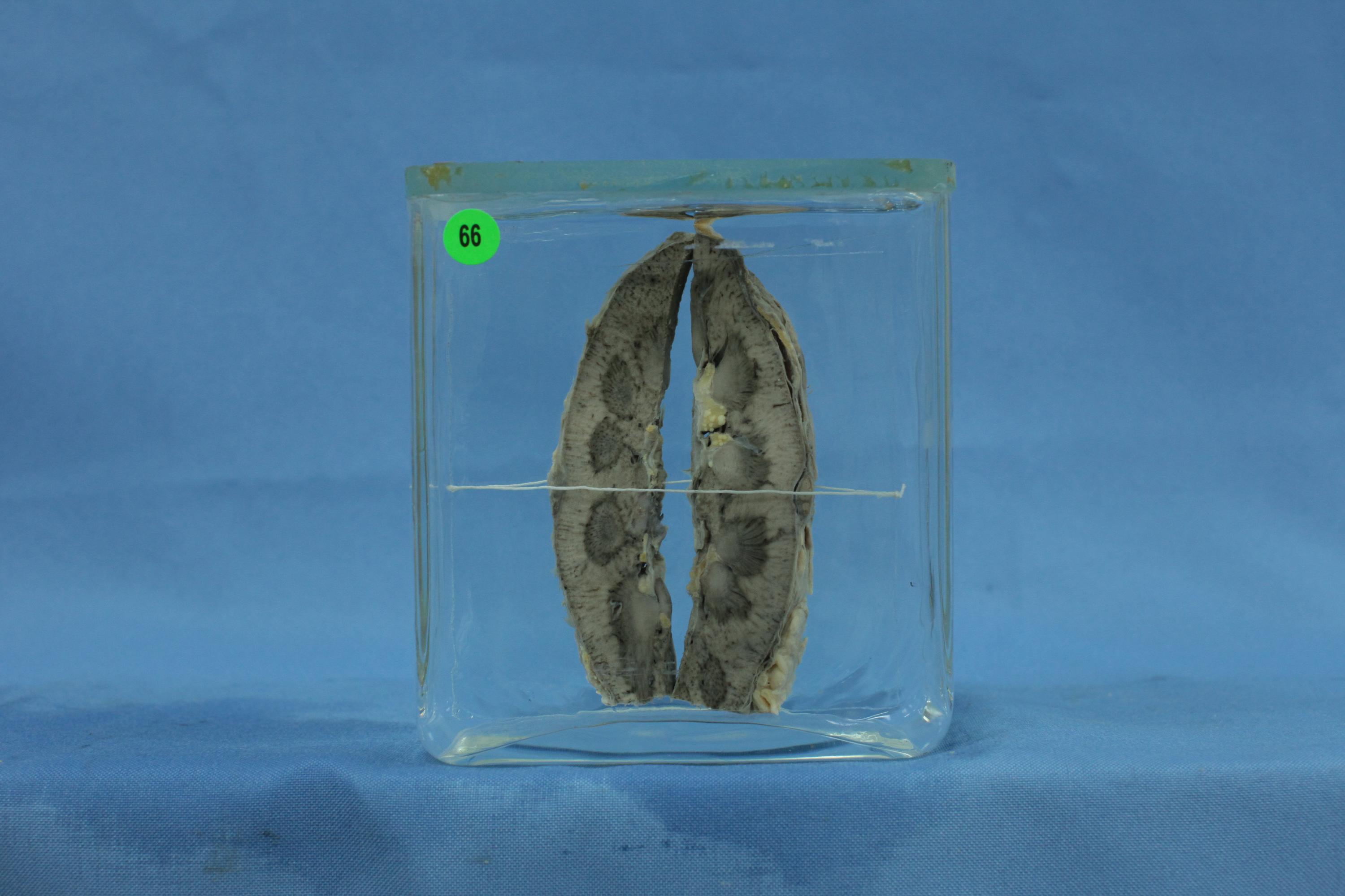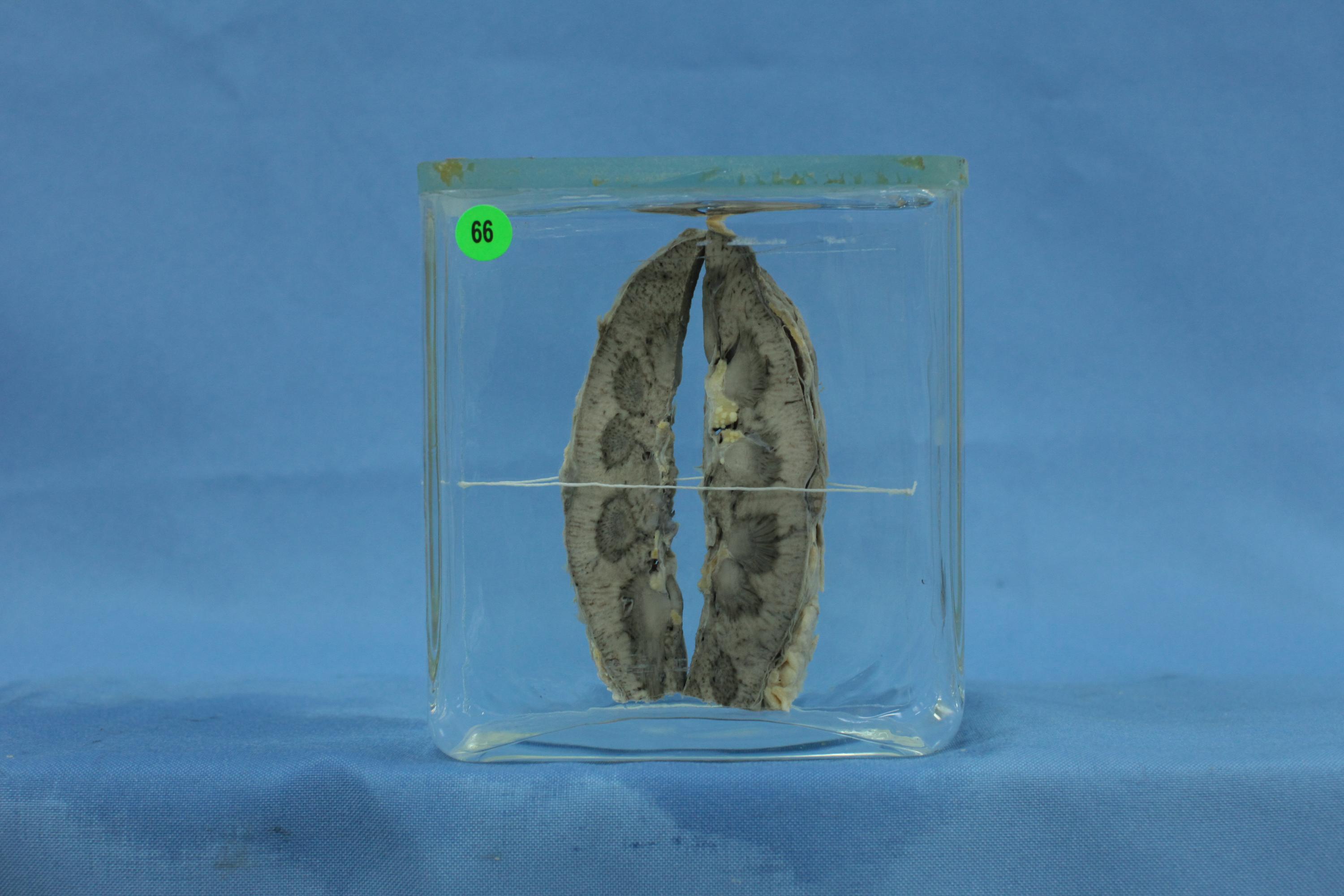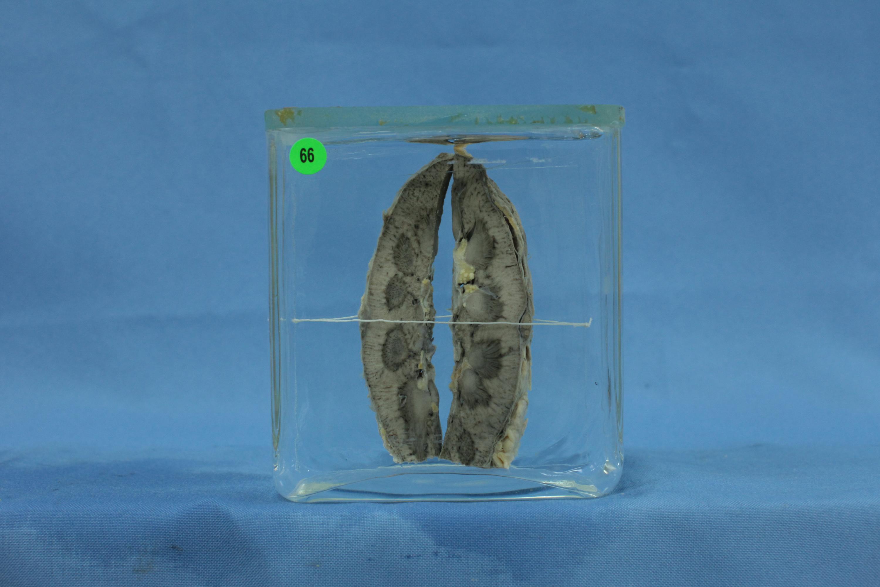 患者男性,32岁。肾周脂肪组织内可见白色的斑点数个。
