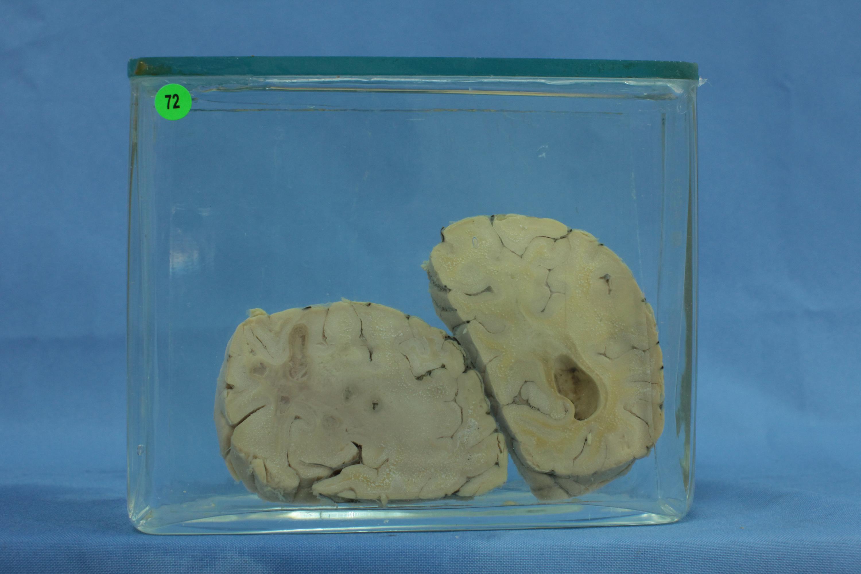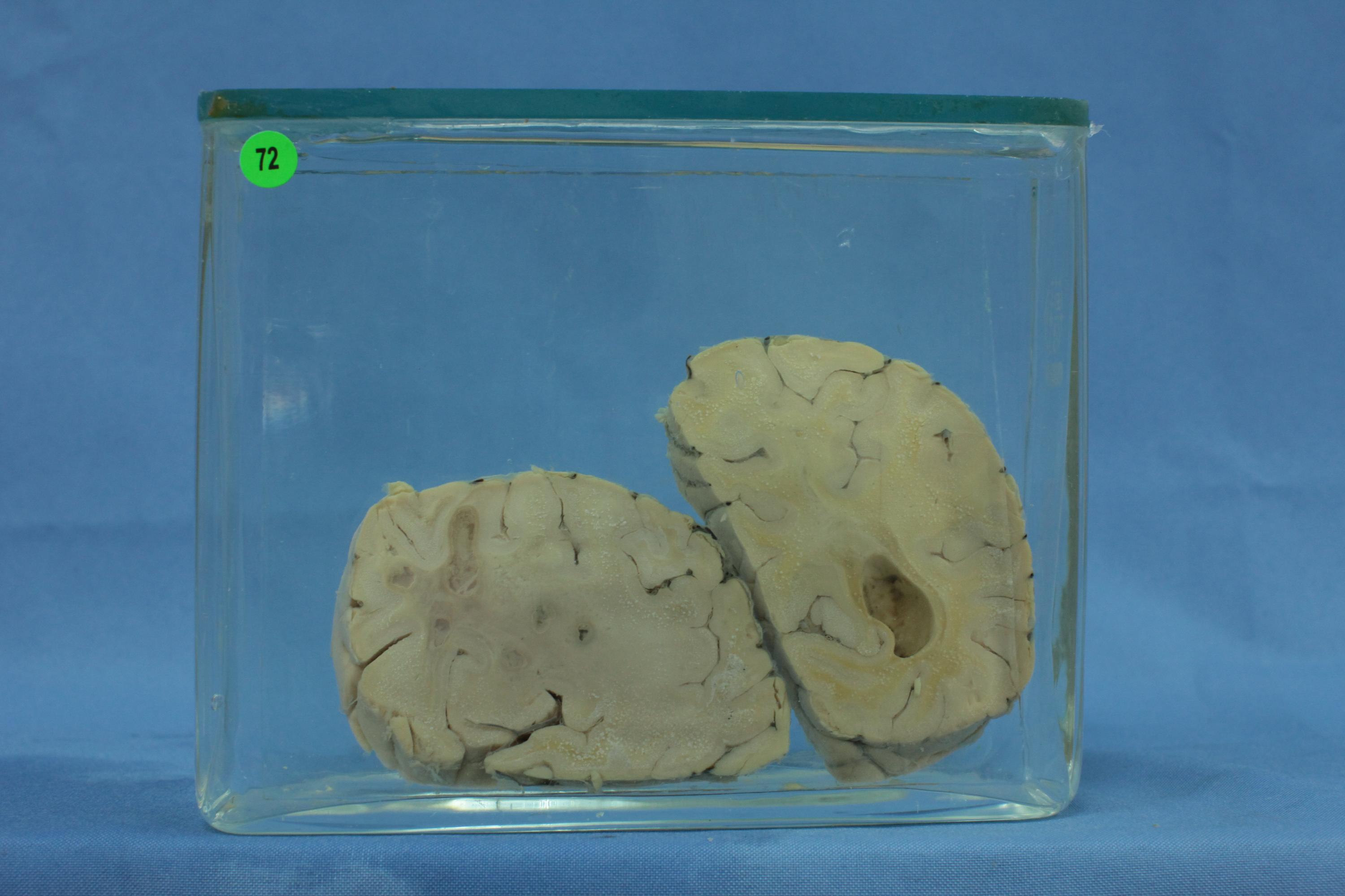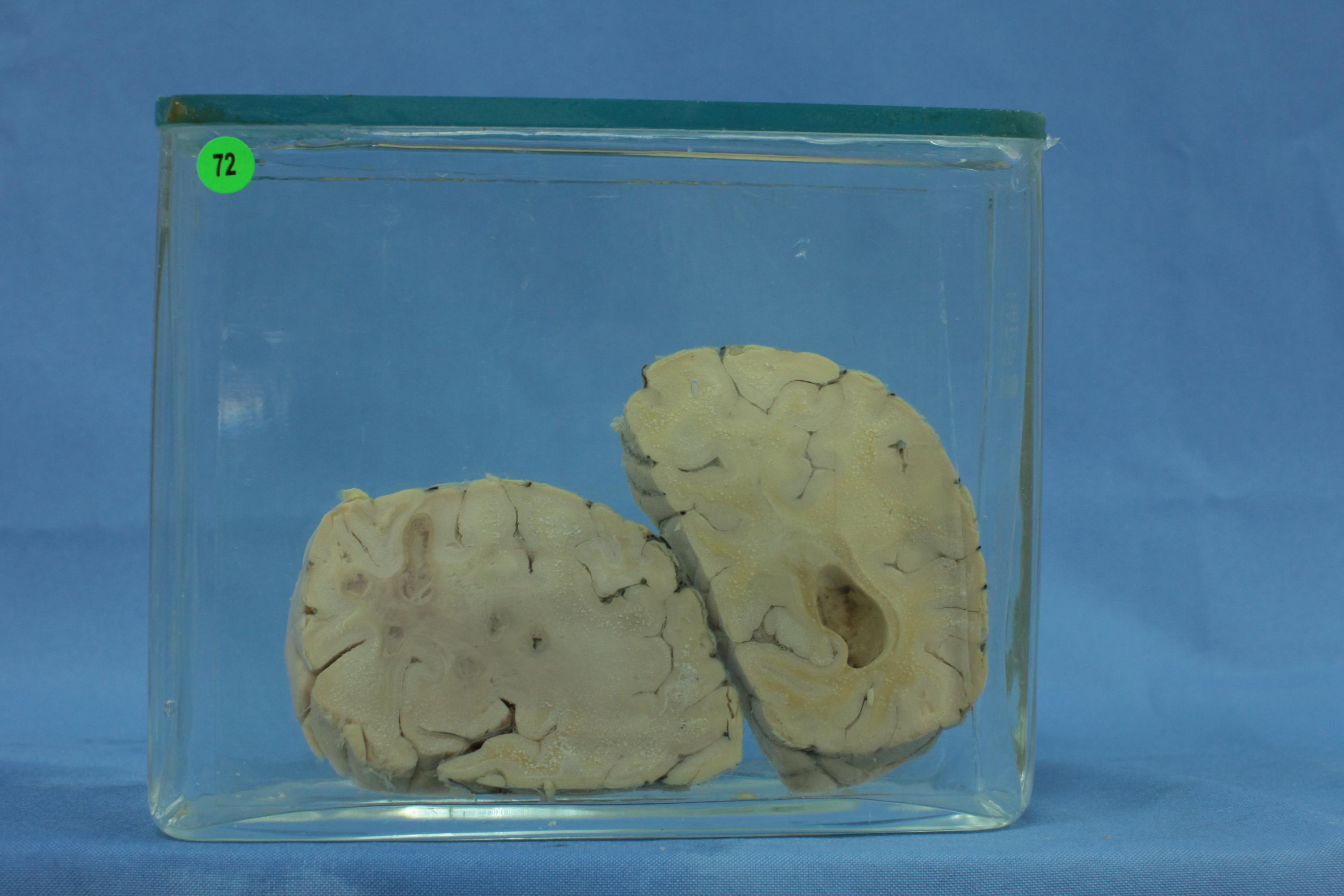 患者男性,23岁,肺吸虫病。大脑冠状切面,脑实质内留有虫体穿行及暂时居留而形成互相沟通新旧不一的隧道及脓肿。