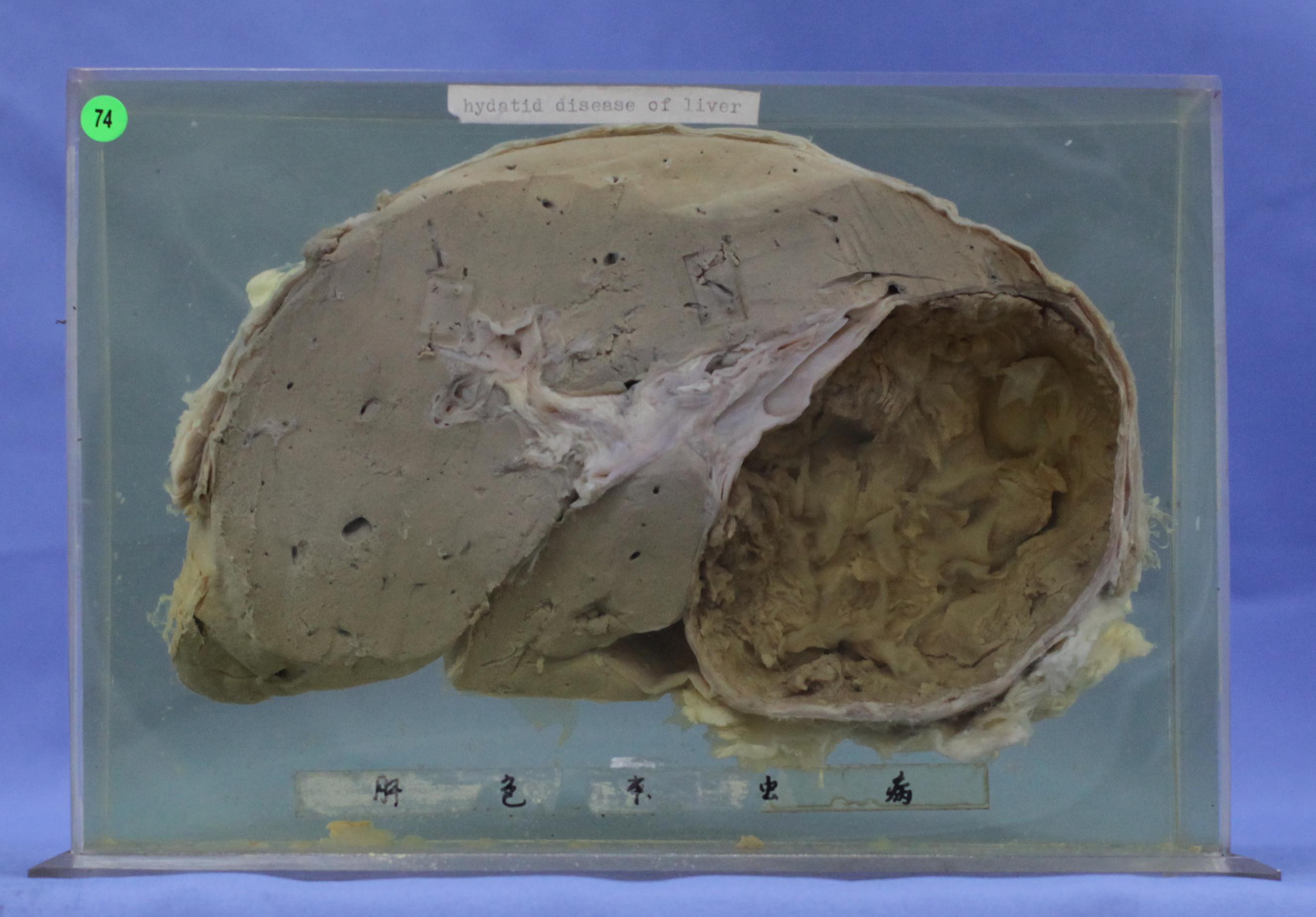 患者男性,74岁。肝囊肿位于右叶,肝脏弥漫性肿大。囊壁乳白色,似粉皮状,脆弱易破裂。