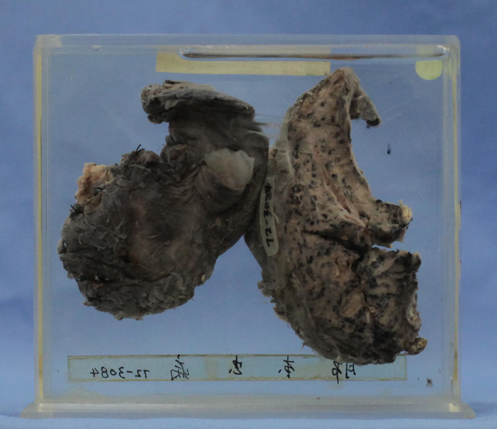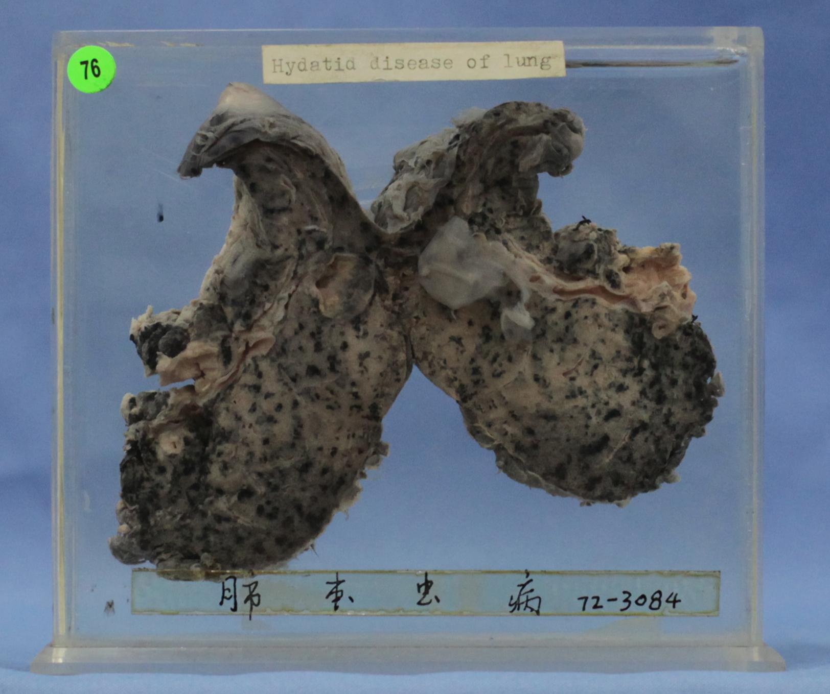 患者男性,52岁,肺组织内一个卵圆形的囊肿,内含清亮液体,囊壁组织粉皮状。