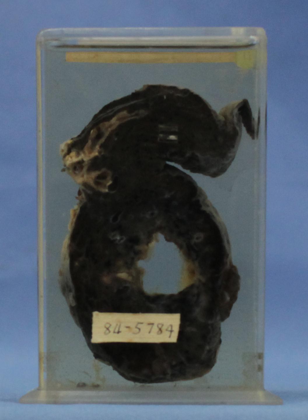 患者男性,67岁,肺组织内有单个囊性病变,囊壁光滑,厚约2-3mm,状似粉皮。