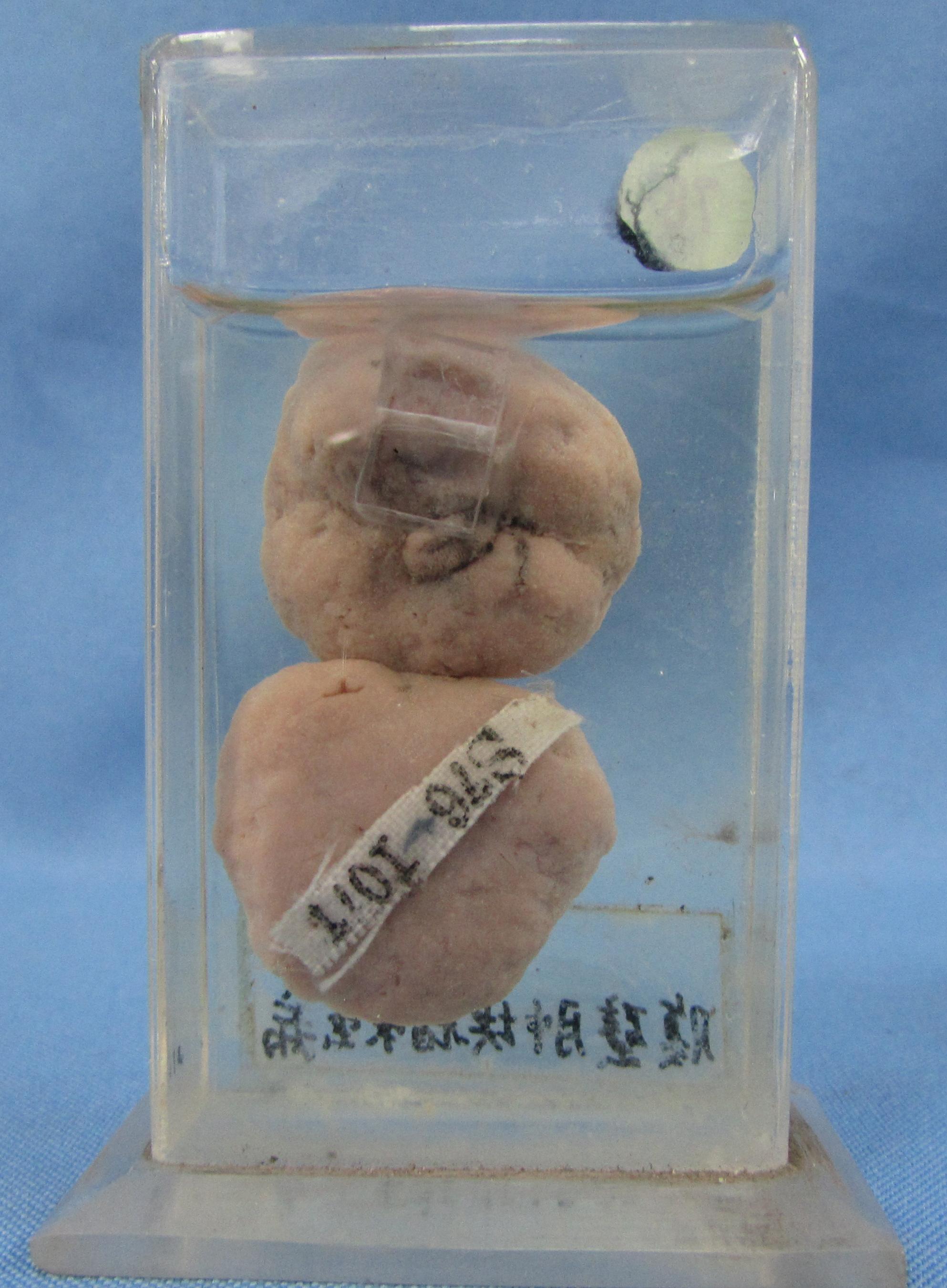 腹壁肌肉组织一块,切面见肌肉组织间镶嵌有众多小囊,囊壁呈灰白色半透明状,有的囊肿被剥离而留下一个空穴。