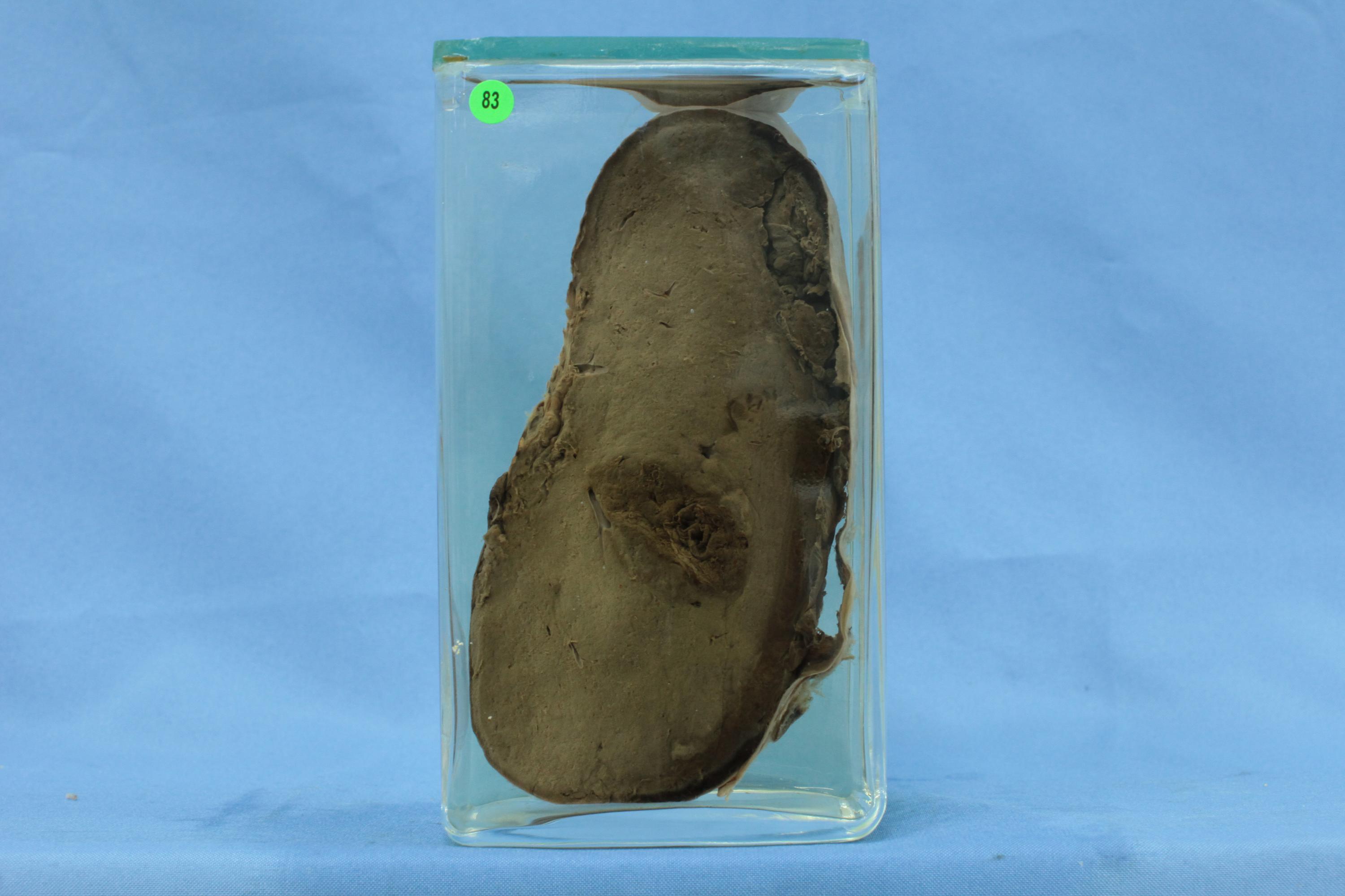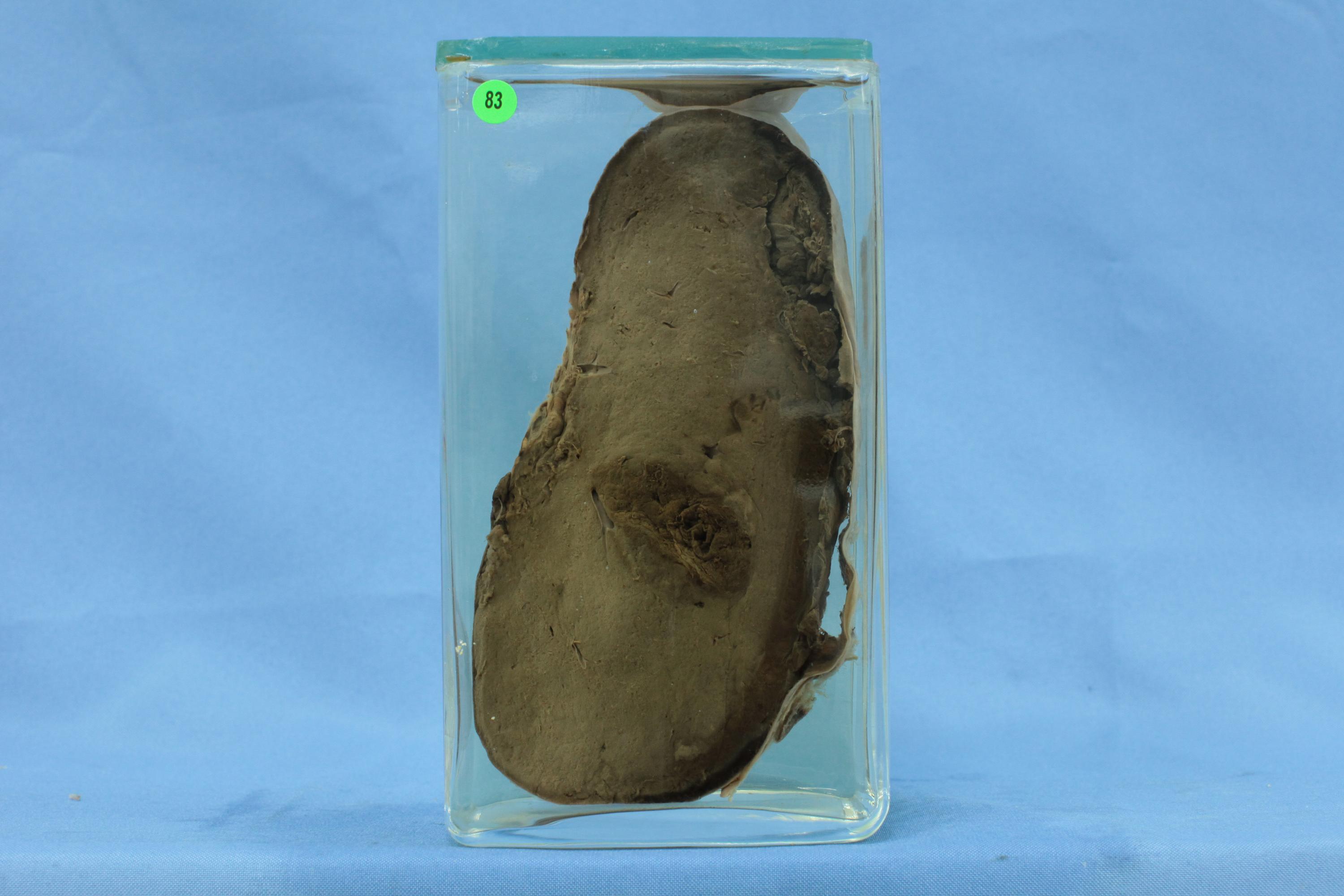 脾肿大,质地硬,由于大量疟色素沉积,表面与切面呈青灰色。