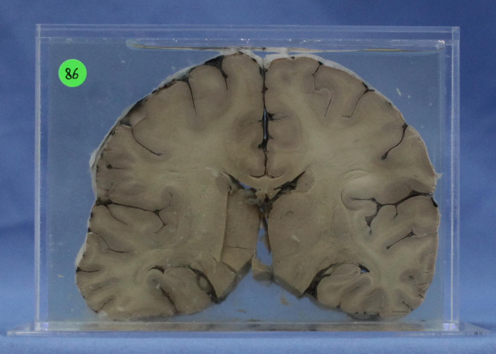 脑水肿,脑回变宽变扁,蛛网膜充血。脑切面白质中见多个针尖大小的软化灶。