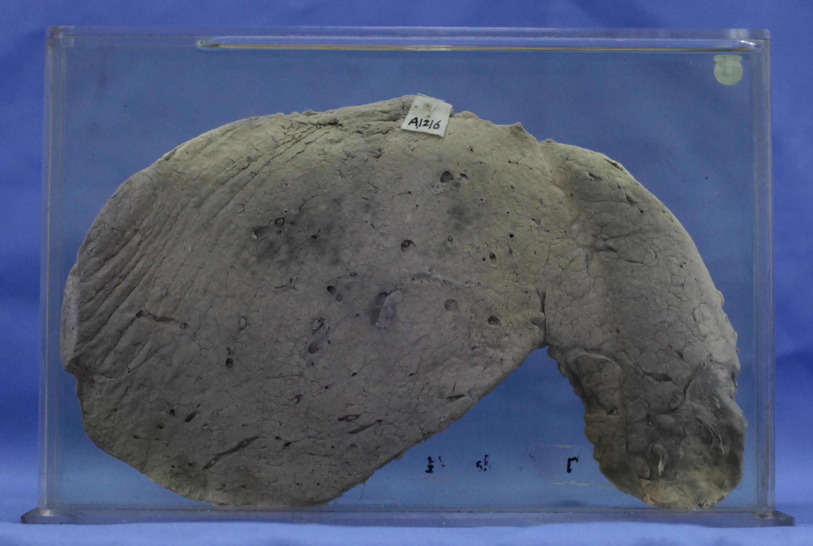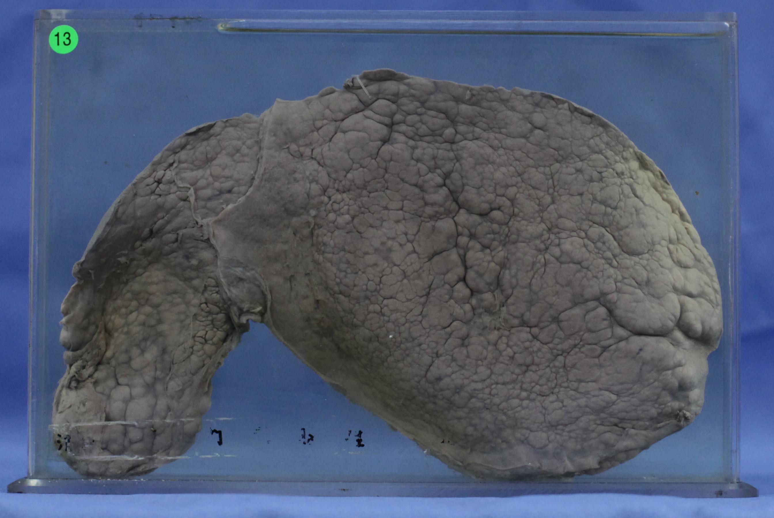 男,41岁。肝脏体积明显缩小,质地变硬,表面高低不平呈结节状。表面及切面均见大量弥漫分布灰黄色结节,结节大小不一,结节周围纤维间隔包绕。(混合结节型肝硬化)