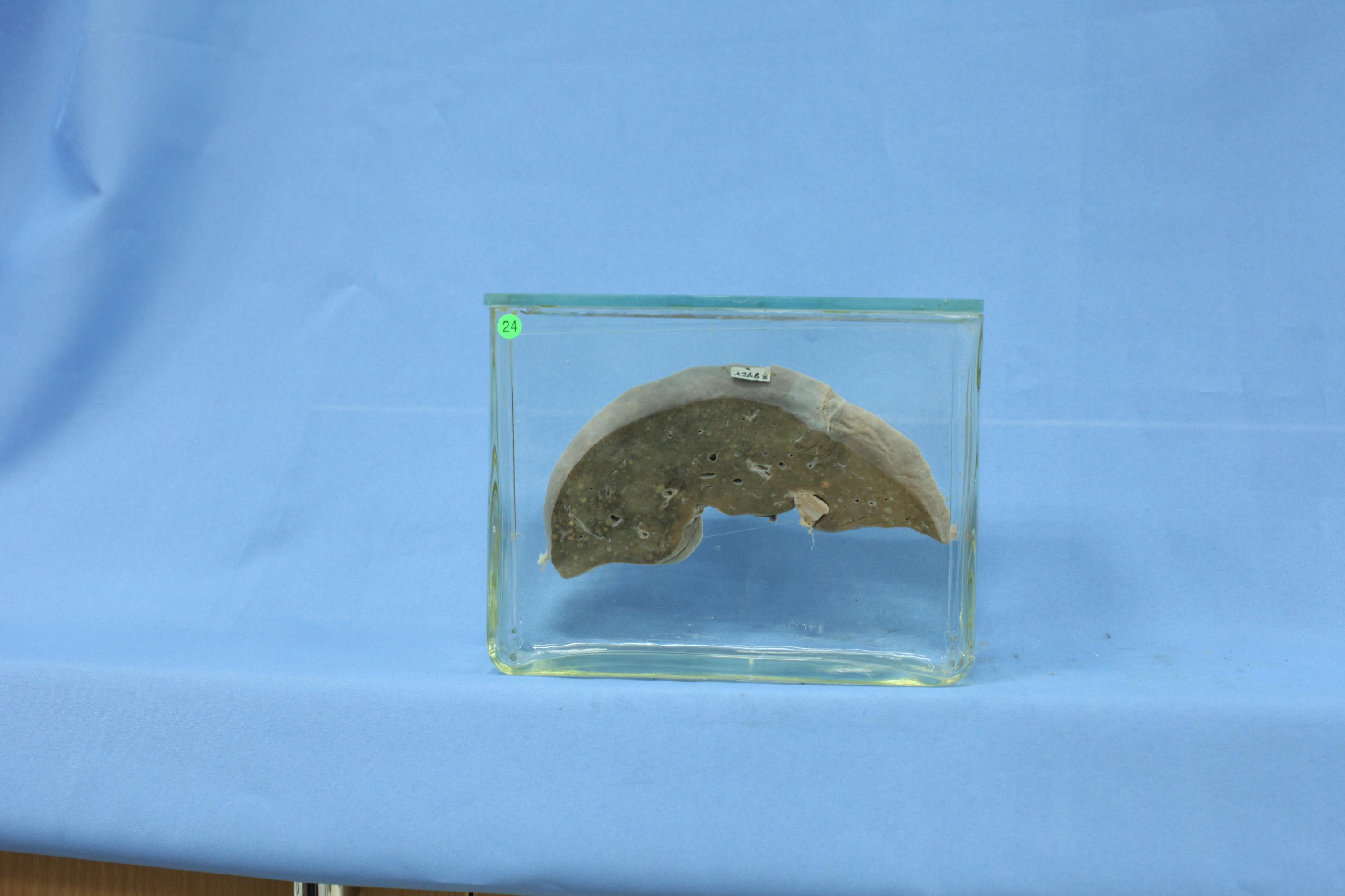 女,24岁。因“上腹持续性疼痛10天,反复呕吐1天”入院。检查发现黄疸,肝未扪及,肝功能差,腹胀显著,有压痛、反跳痛。激素等治疗无效,腹痛持续。剖腹探查术取出腹水2000ml,术后血压下降,死亡。肝脏体积明显缩小,重量减轻,部分肝包膜皱缩。切面暗红色,小叶结构模糊,其上可见较多直径13毫米黄色结节(再生结节)。