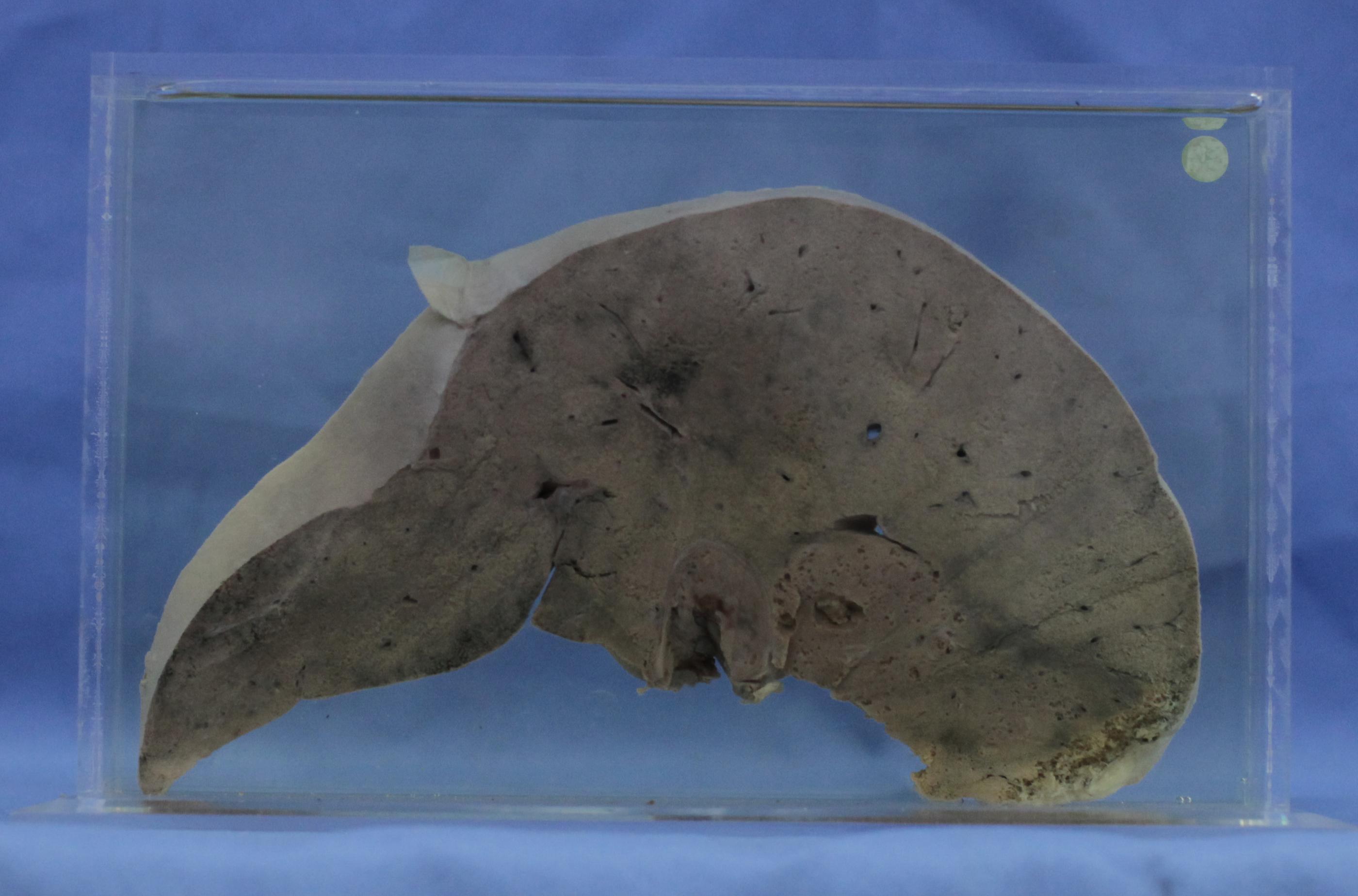 男,62岁。肝脏饱满,暗褐红色,切面肝实质疏松,易脱落。近肝门处有一直径3厘米灰黄区域,部分组织脱落,呈筛孔状,周边有未完全形成的纤维包膜。