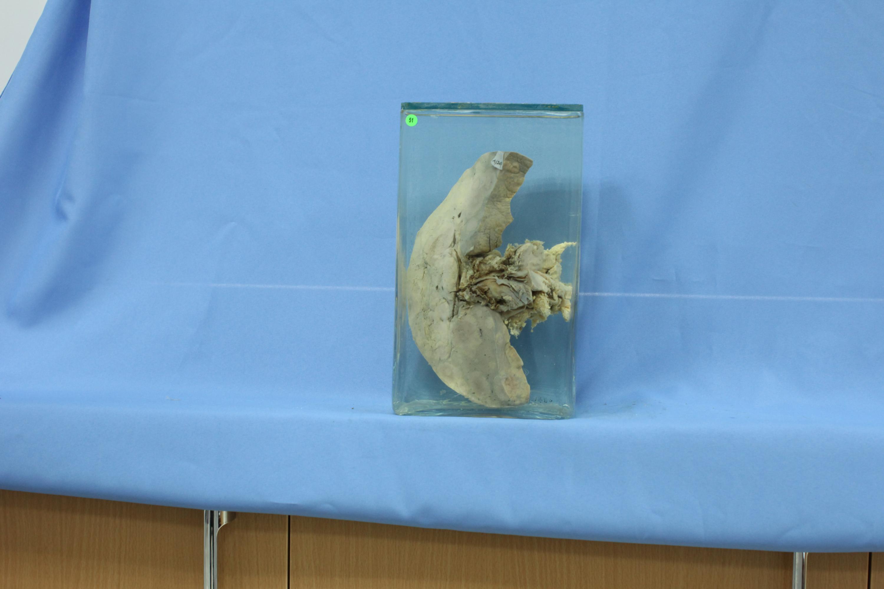 男,66岁。上腹部疼痛4个月,持续性进食后疼痛增剧,向背部放射,近2月来消瘦较厉害,近半月不能起床,每晚有低热、出冷汗。解剖诊断“胰腺腺癌,主要在体部及尾部;转移至淋巴结,包括局部、肝门、主动脉旁、纵隔和支气管淋巴结;转移至肝、大网膜、横隔、两侧胸膜和肺”。肝组织内有大量灰白色圆形肿块,大部分分布在包膜下,部分在肝脏中间;与周围肝组织分界较清,但无纤维包膜形成。下方一个包膜下肿块,从包膜面看中央凹陷,形成“脐凹”。肝门旁有部分胰腺组织,内见灰白色肿块。