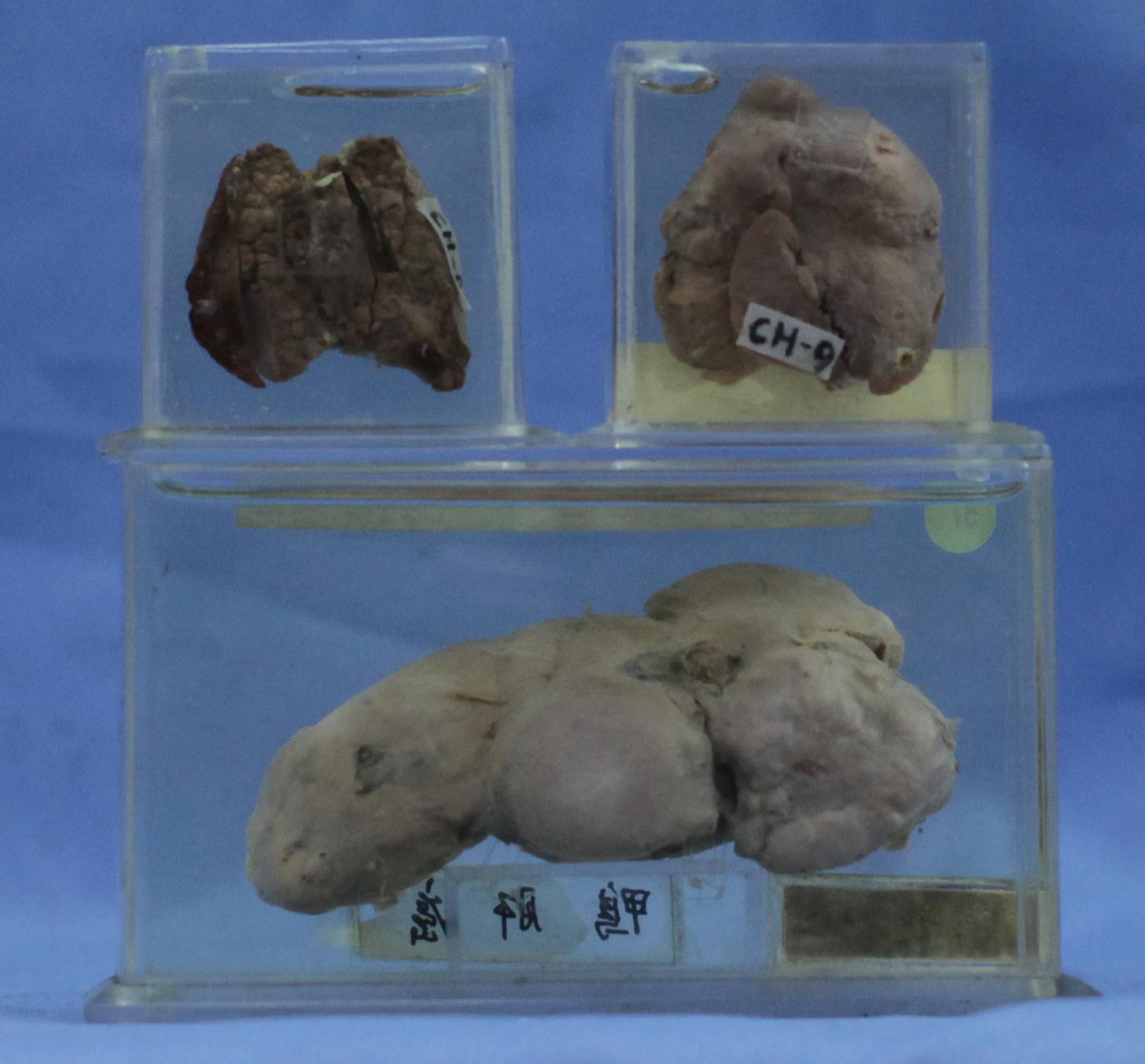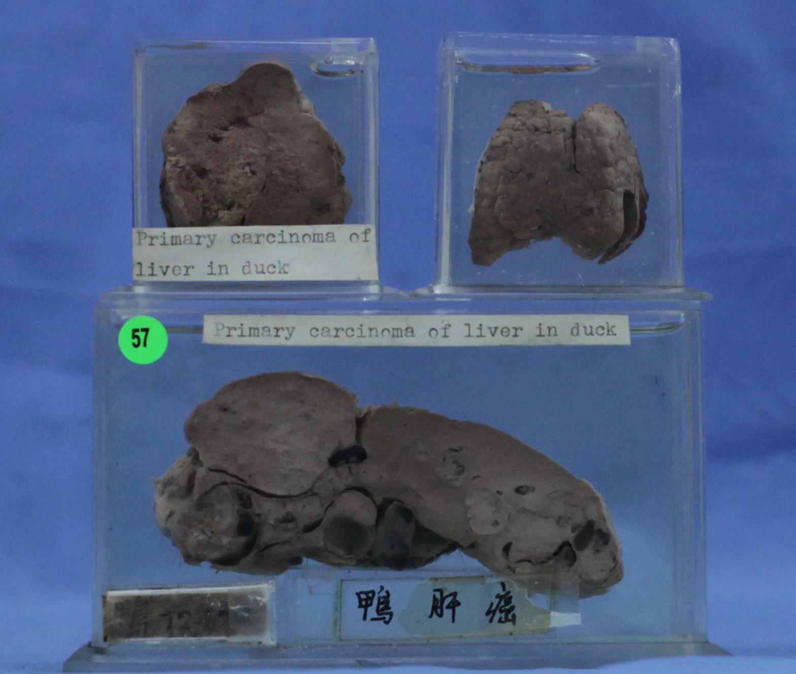 20世纪70年代,江苏启东家养鸭子。肝表面凹凸不平,切面多个灰白病灶,直径0.33厘米,界较清,病灶中央灰黑色(出血坏死)。