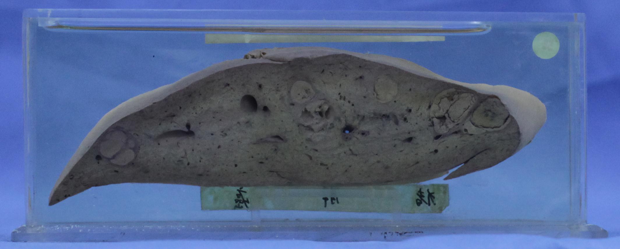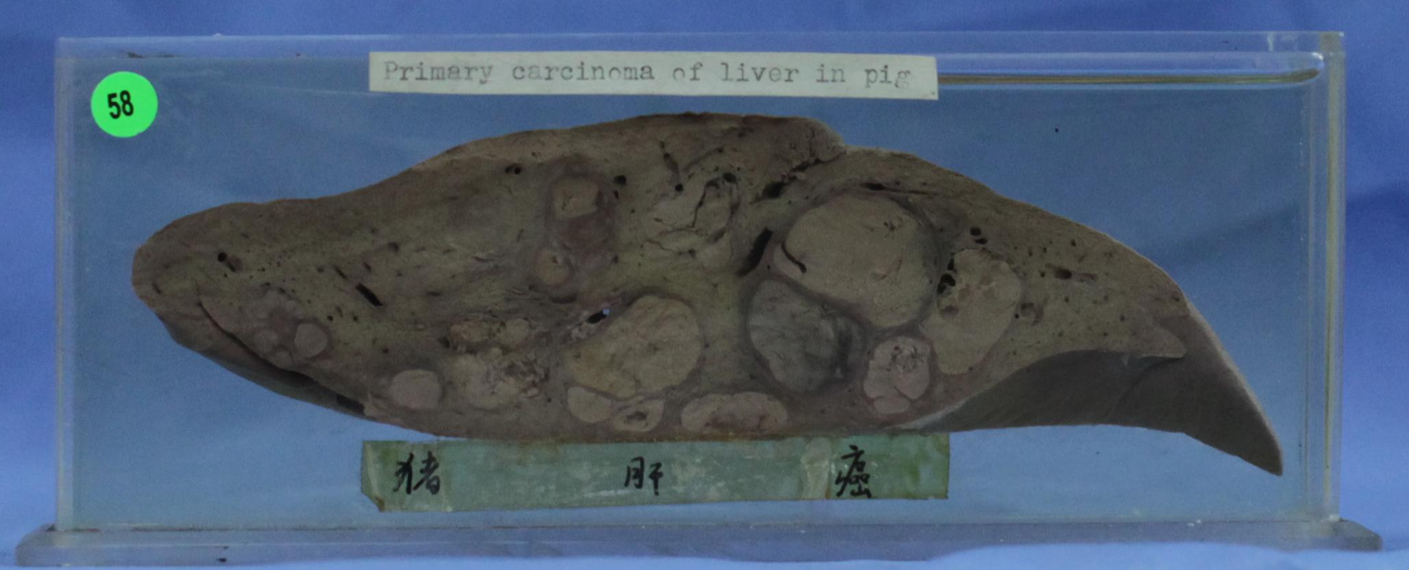 20世纪70年代,江苏启东家养猪。肝切面大量灰黄色圆形病灶,组织疏松,局部有出血呈灰黑色。病灶与周围肝组织界限较清楚,有纤维包膜形成。