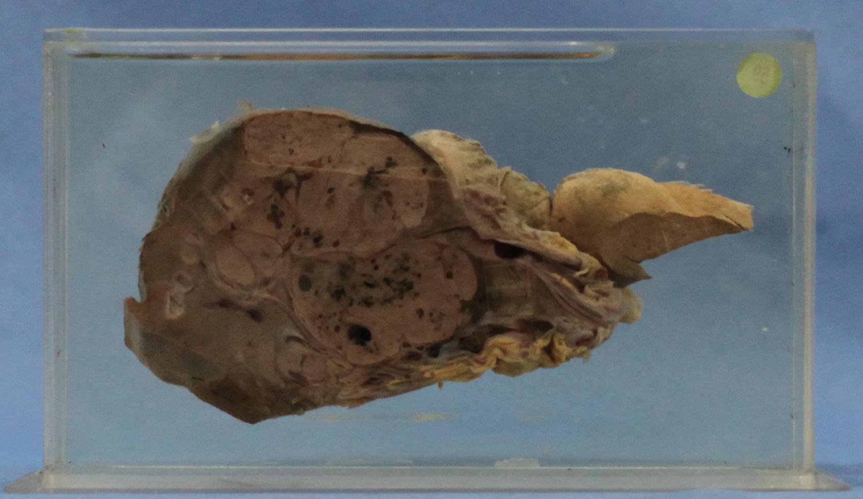 20世纪70年代,江苏启东家养狗(主人因肝细胞肝癌死亡)。肝右叶有一直径7.5厘米灰白色肿块,与周围组织界限清楚,无包膜,肿块内有坏死、脱落,局部有出血呈灰黑色。肝左叶有一圆形直径 1.7厘米性质相同的肿块。