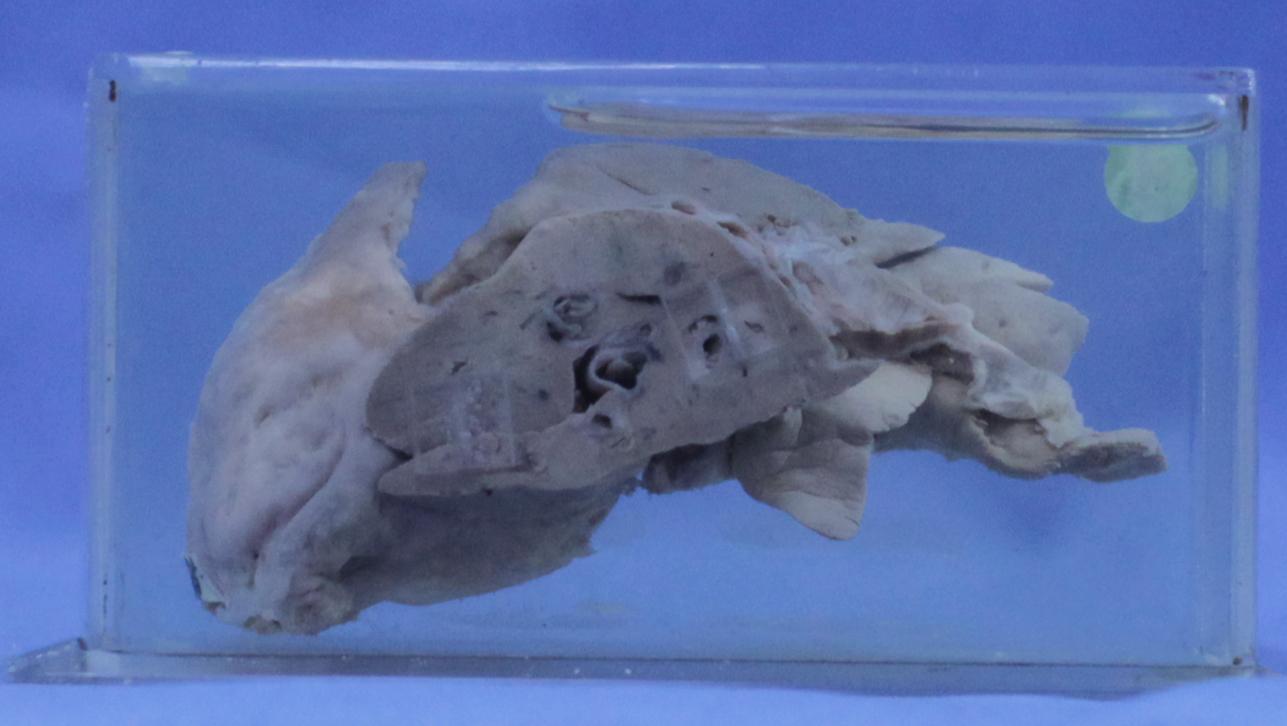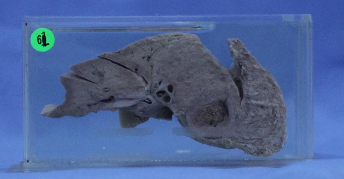 20世纪70年代,江苏启东家养猫。肝切面标本下部有一直径 1.5厘米灰黄区,组织疏松,有脱落。另整个右叶肝组织都疏松,易脱落,其间夹杂不规则纤维间隔。