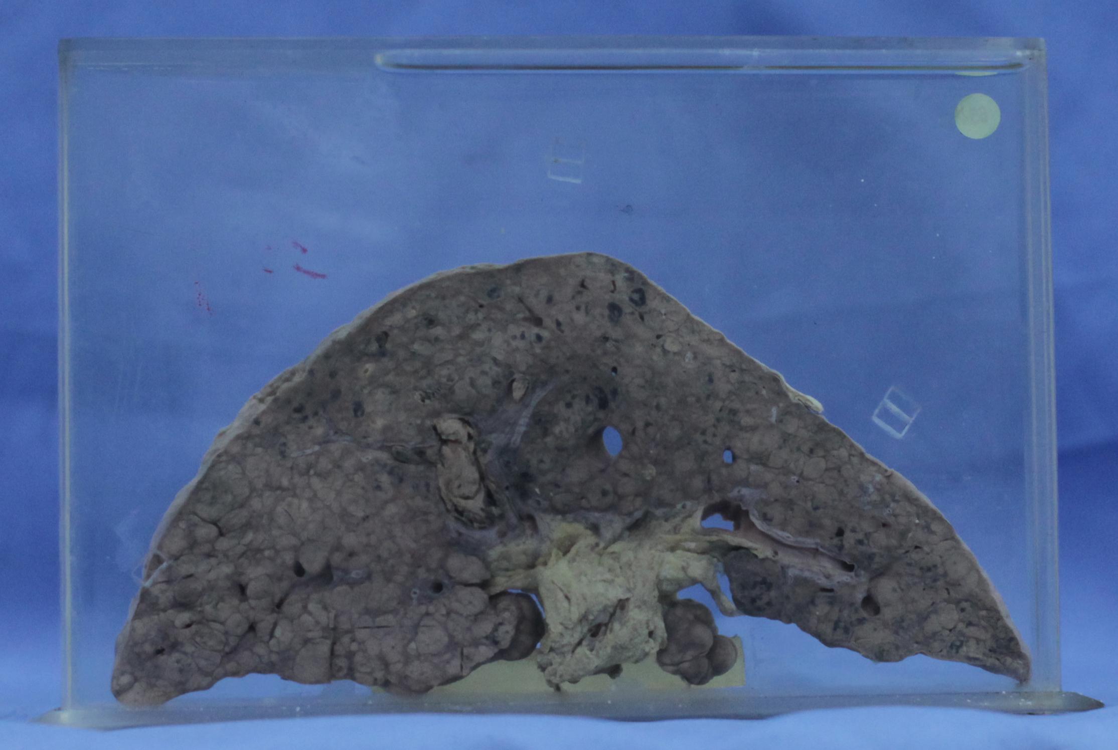 肝脏硬化背景上(质地坚实、平坦的肝硬化结节,周围包绕纤维组织),标本的上部和左侧见弥漫分布的灰白灰黑小结节,质地疏松,易脱落。肝门静脉内见灰黑癌栓形成。