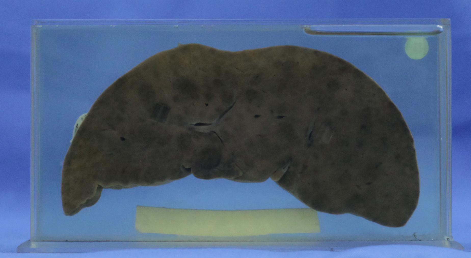 肝脏内见弥漫分布圆形病灶,直径0.31厘米,灰黑色,与周围肝组织界限不清楚。