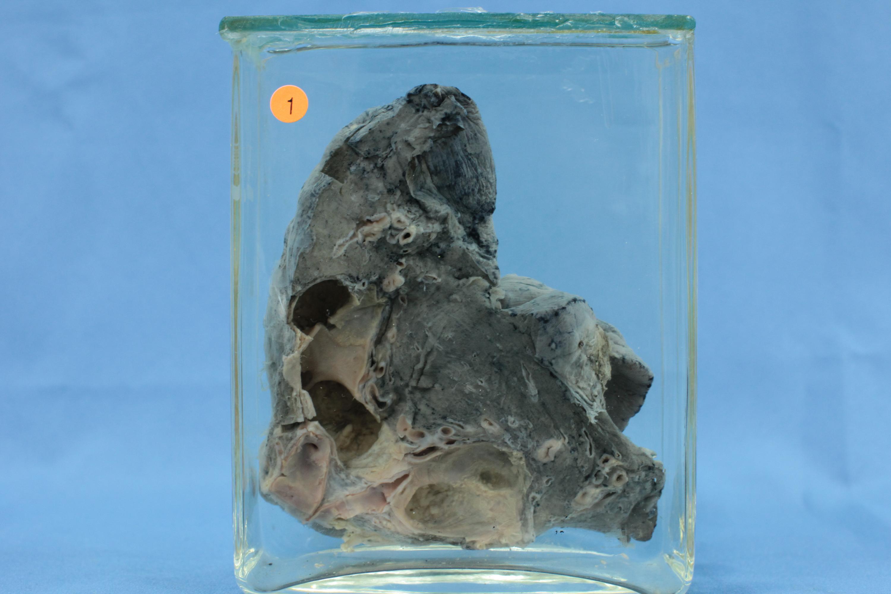 叶内型有半数病例在20岁以后才确诊。主要发生在下肺,临床可以没有症状,或表现为肺部反复感染、咳嗽、胸痛等。X线示致密块影,可有囊性变。本例肉眼示肺下叶后基底段近胸膜有多个囊状结构,囊壁纤维化,囊内渗出液已流出(镜下示囊性扩张的细支气管)。标本的左下方可见单独的动脉。