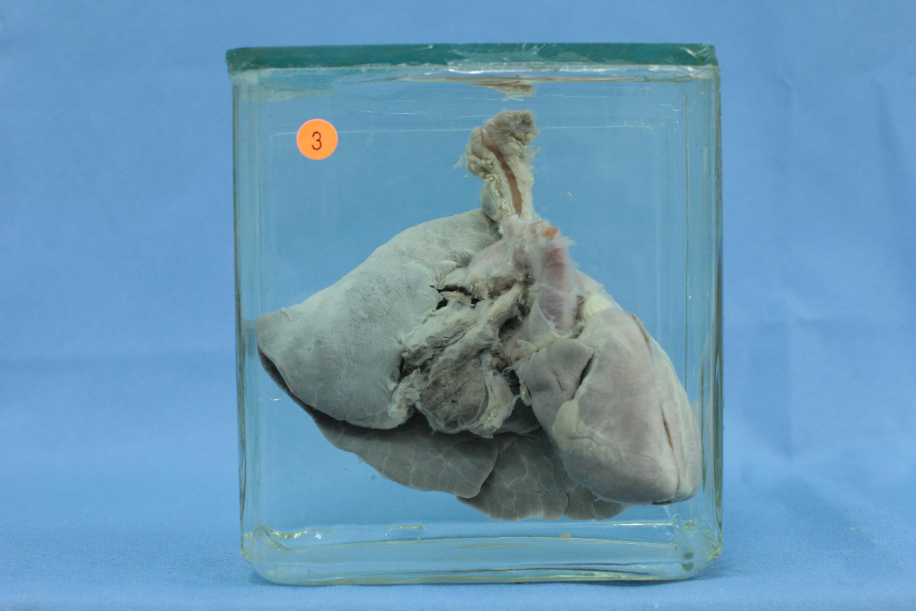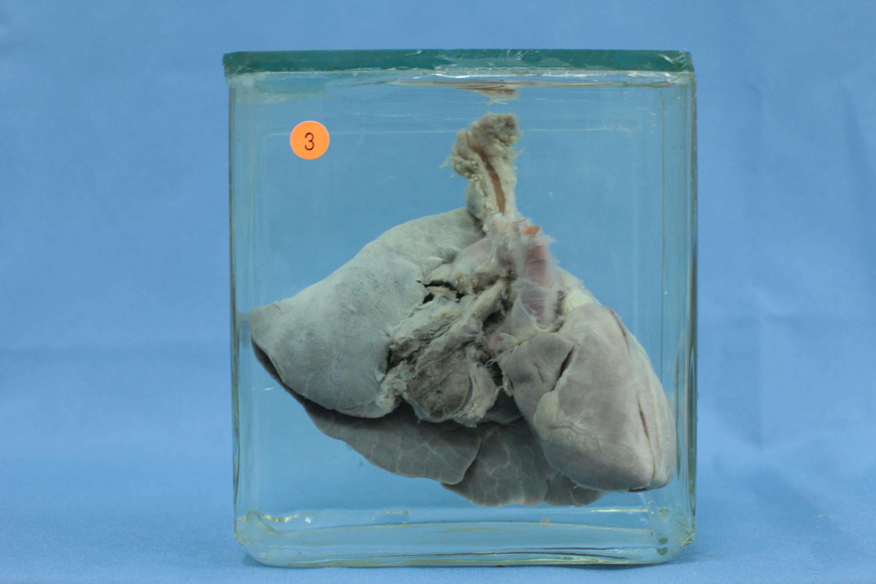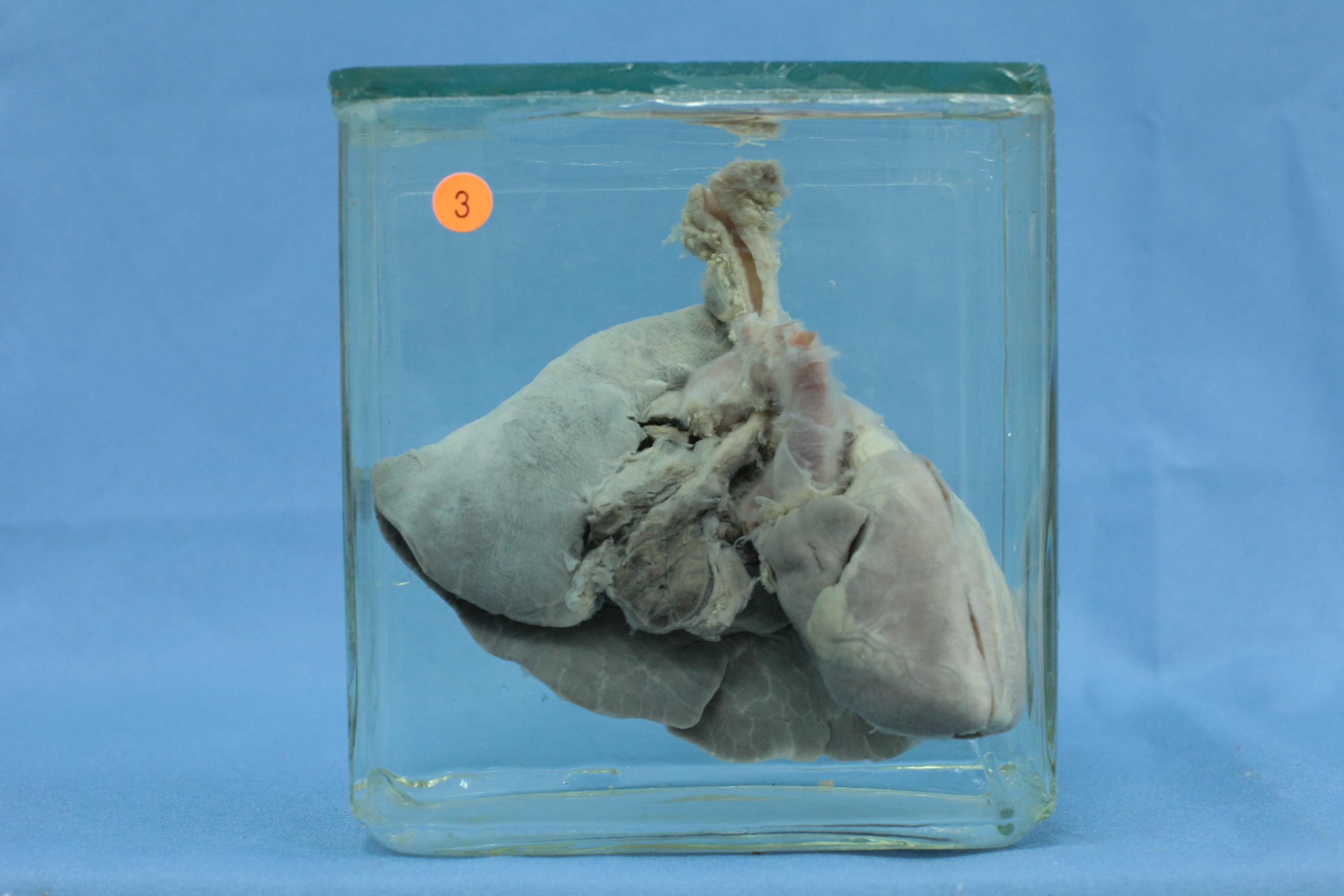 在右肺支气管末端见一直径2cm的肺组织团块,切面呈膨胀不全的肺组织结构。右肺体积膨大,胸膜平滑,肺动脉在动脉导管分支后,主干直接进入右肺,左肺动脉缺如。