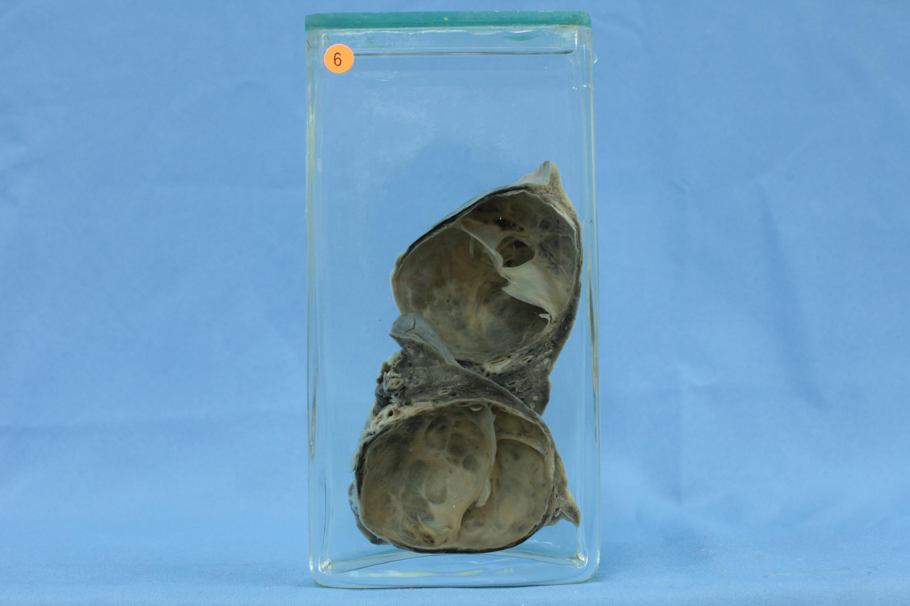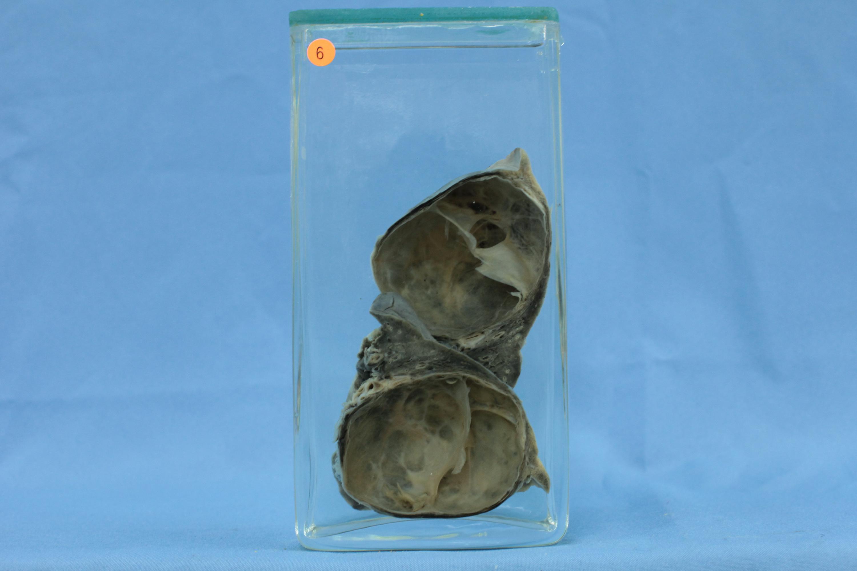 本例为单囊,中间有不完全性分隔,内含清亮液体。囊外见肺组织。镜下囊壁内衬纤毛柱状上皮或假复层柱状上皮,囊壁为纤维结缔组织,可含腺体、软骨、平滑肌等结构。