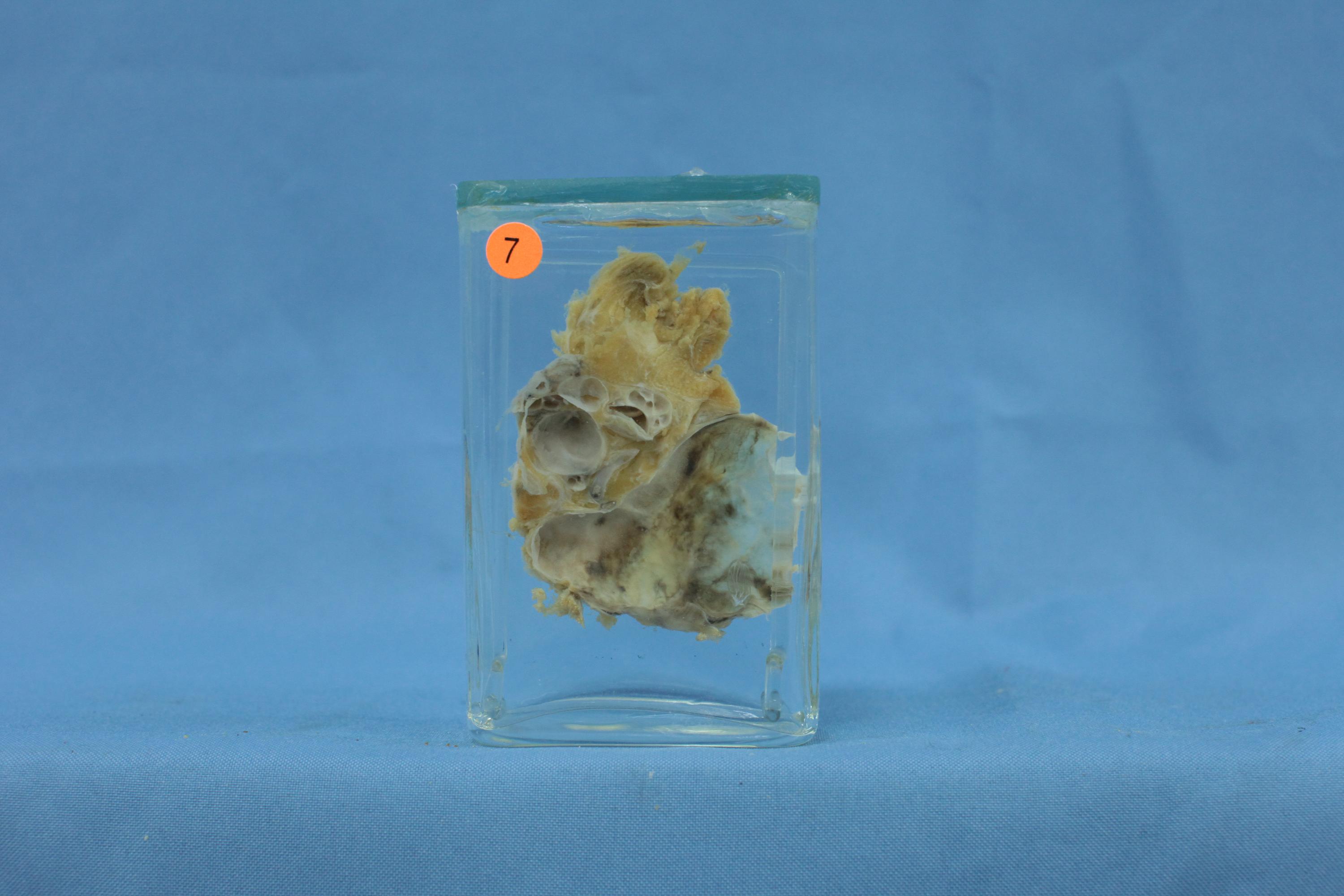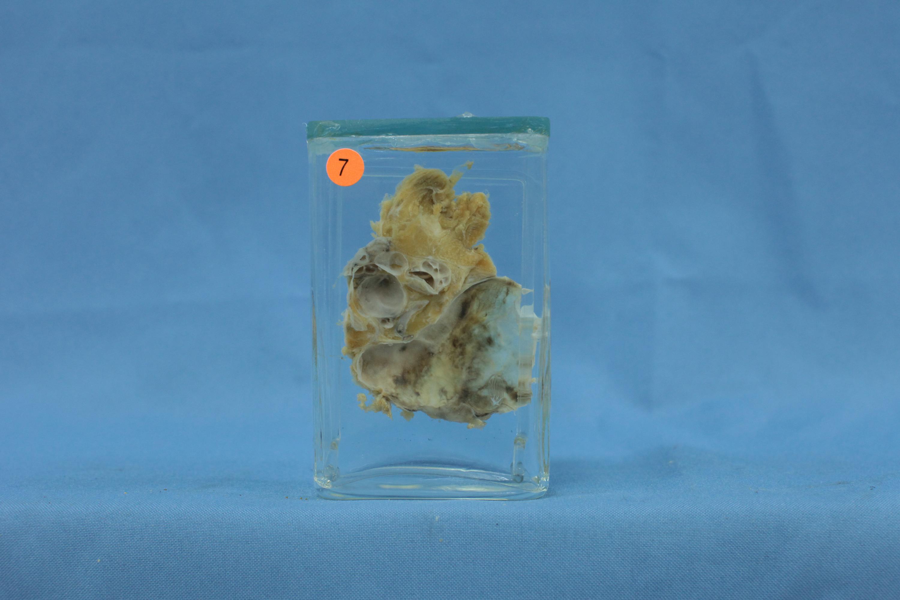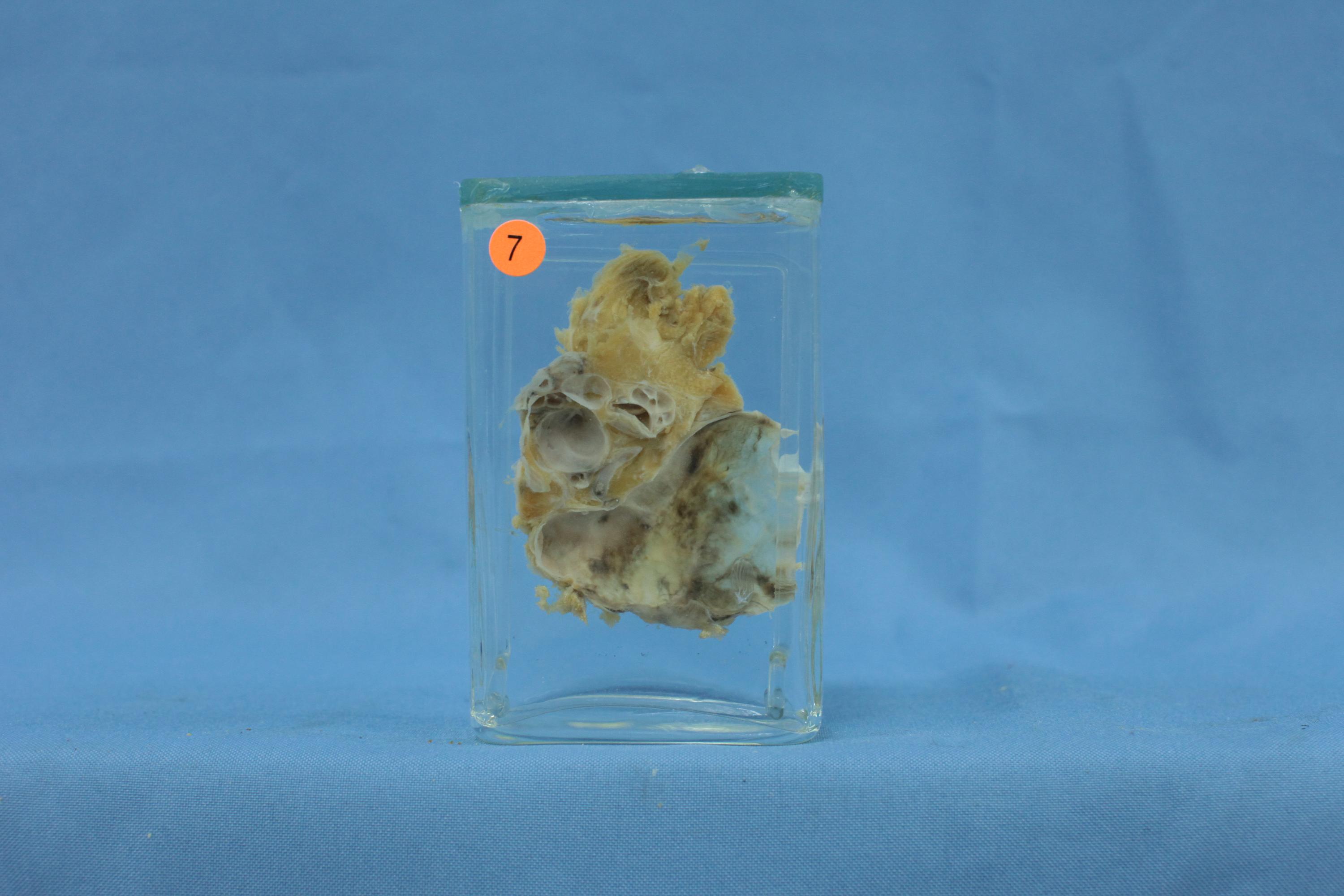 本例多发性囊性肿块见于后纵隔,7×5×2.5cm,切面见多个大小不一的囊腔,其内壁平滑,腔内为清亮液体。