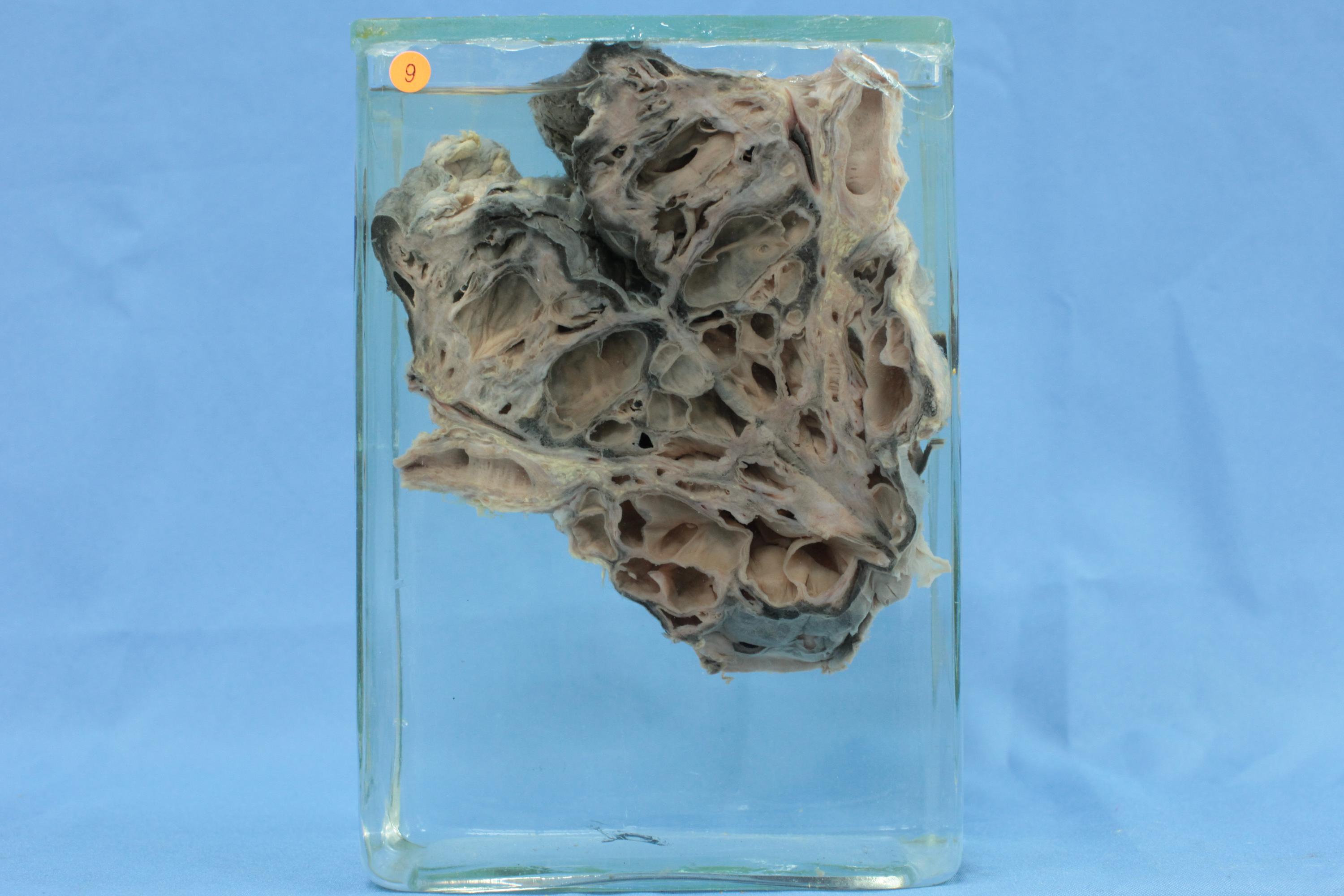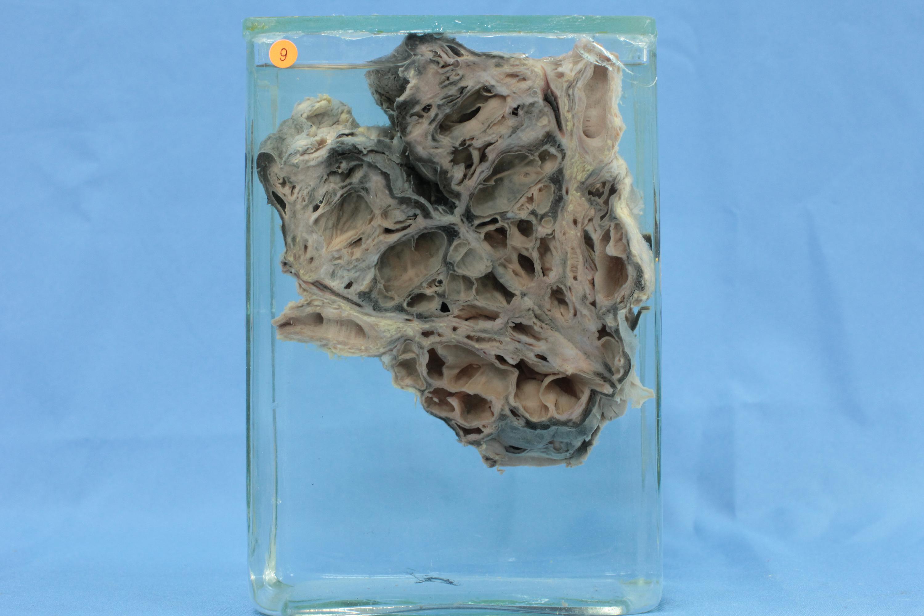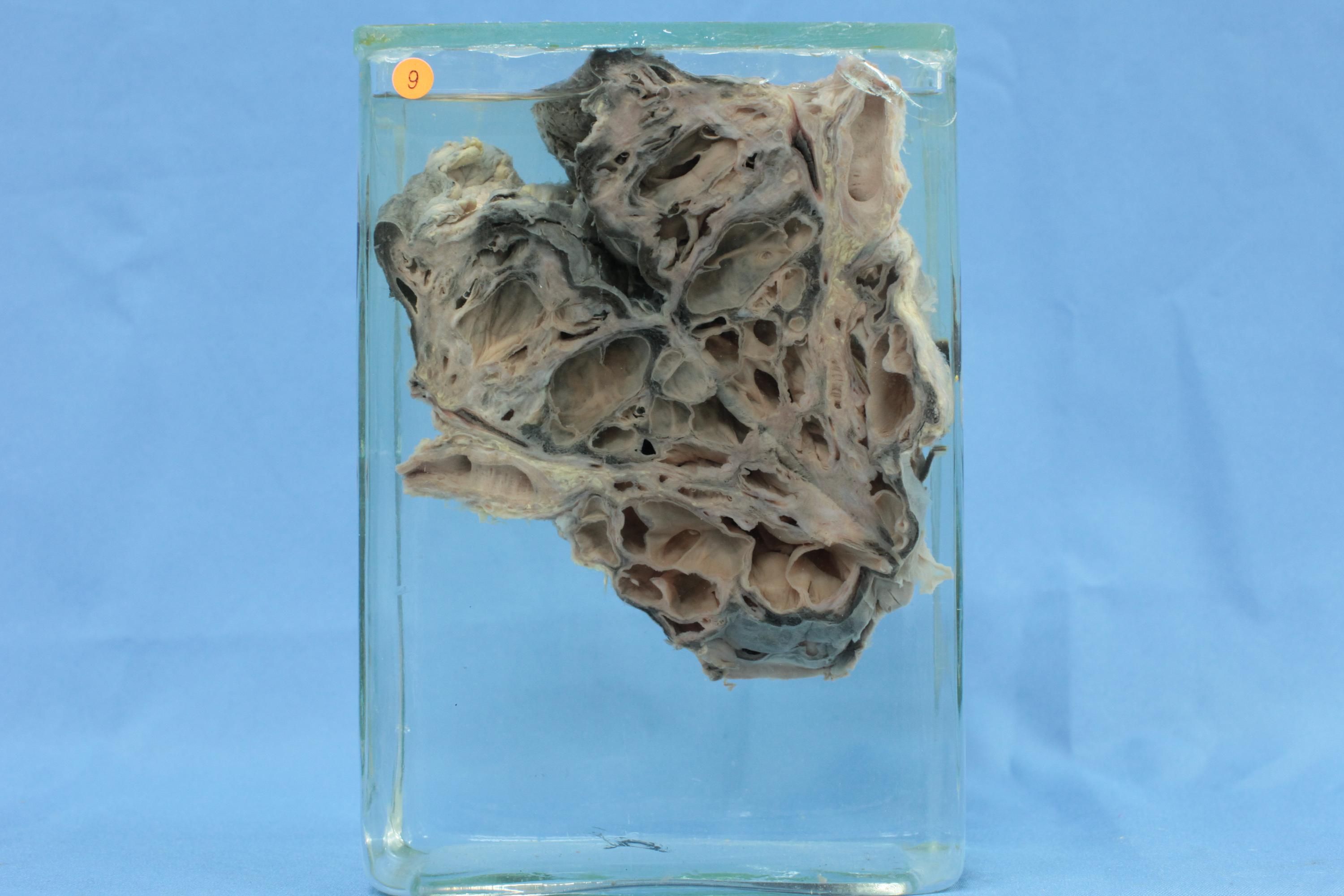本例为第2型,左肺切面显示大量扩张的囊泡,直径大多小于2cm,肺实质受压萎缩。镜下囊壁被覆纤毛立方或柱状上皮细胞,囊间可有少量肺泡管结构和横纹肌组织。