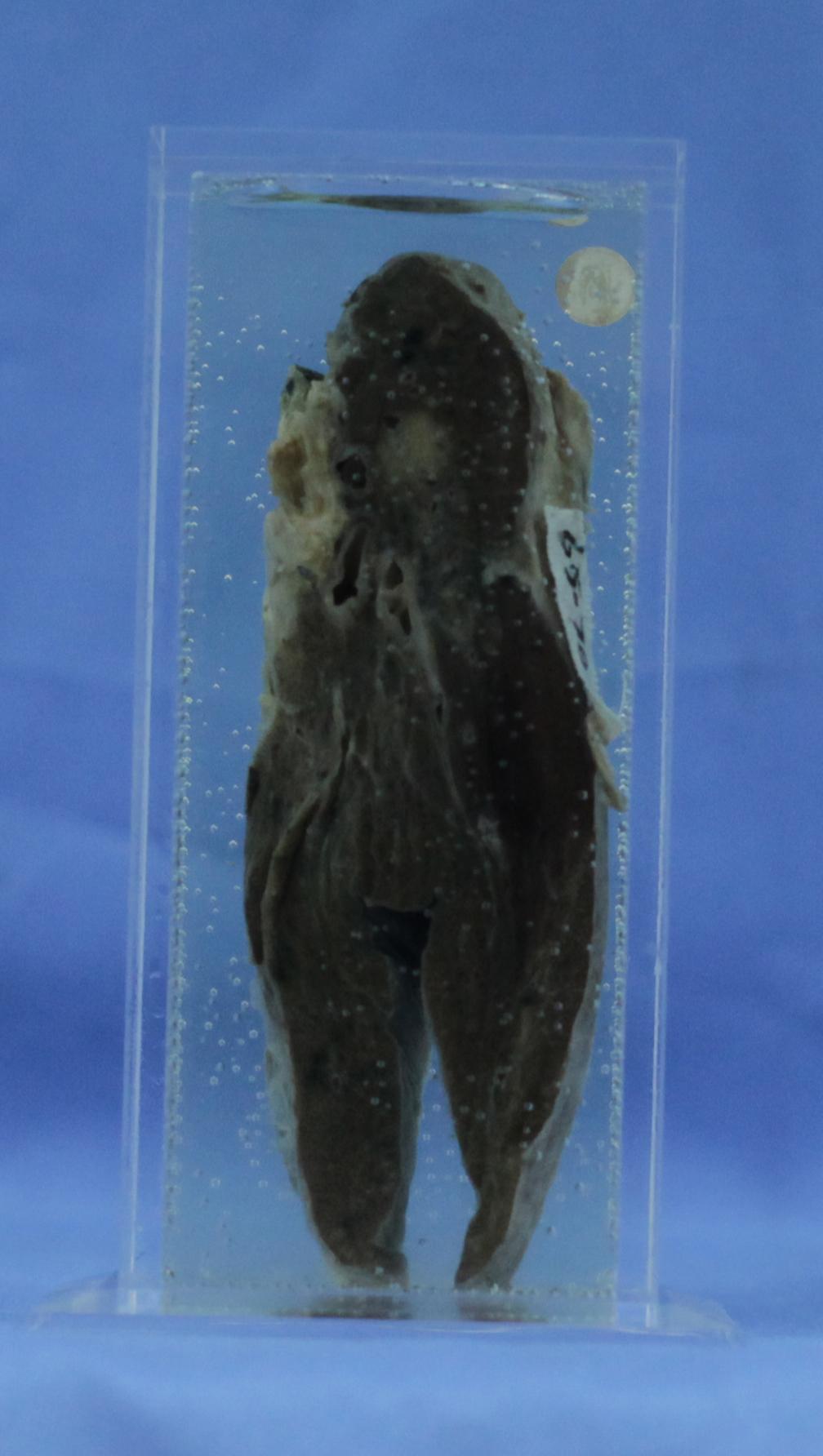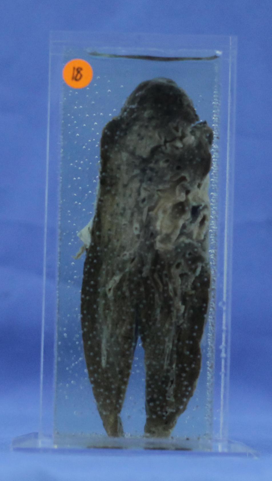 本例见于大叶性肺炎后,标本显示胸膜无明显病变;切面下叶外侧见局灶性乳白色实化区,有一定的金属折光性,似瘦肉状,故又称肺肉质变。其病灶边缘不规则,界限不清,相邻肺实质轻度充血。