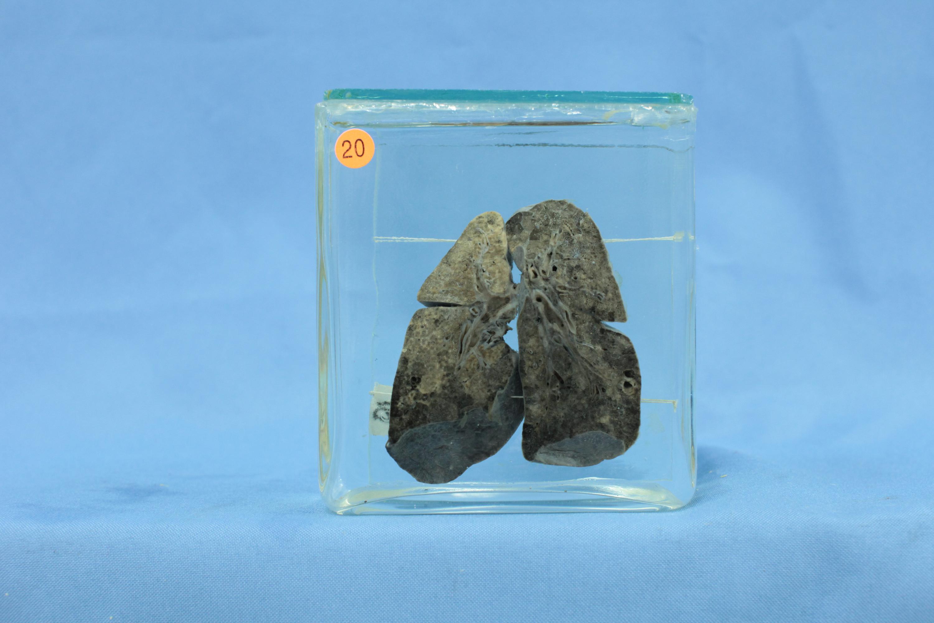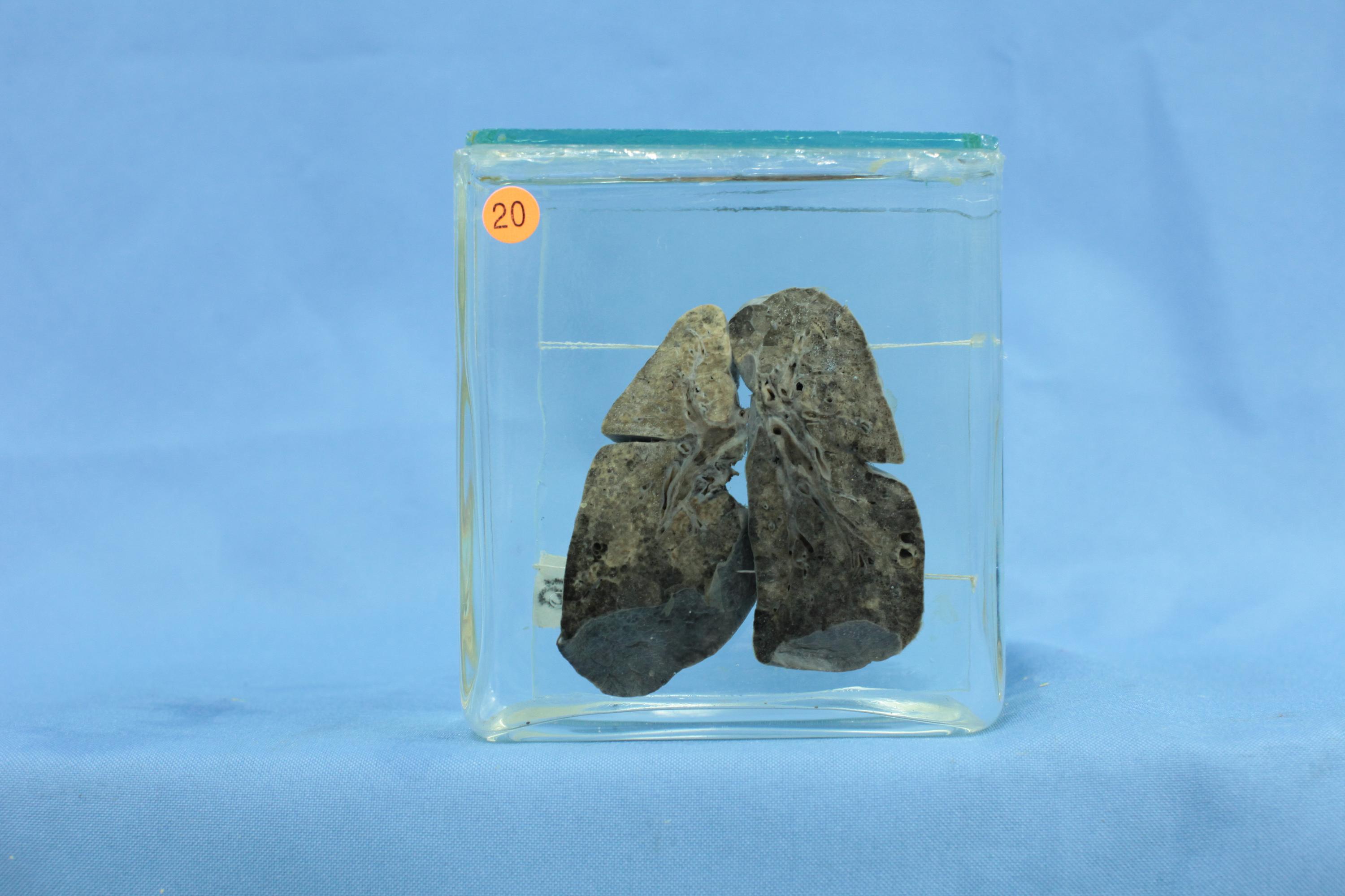 本例标本显示肺组织切面呈明显暗红色(淤血),两肺各叶均见散在品字形分布的小实化灶,呈灰白色,边界不清,部分区有互相融合趋势。