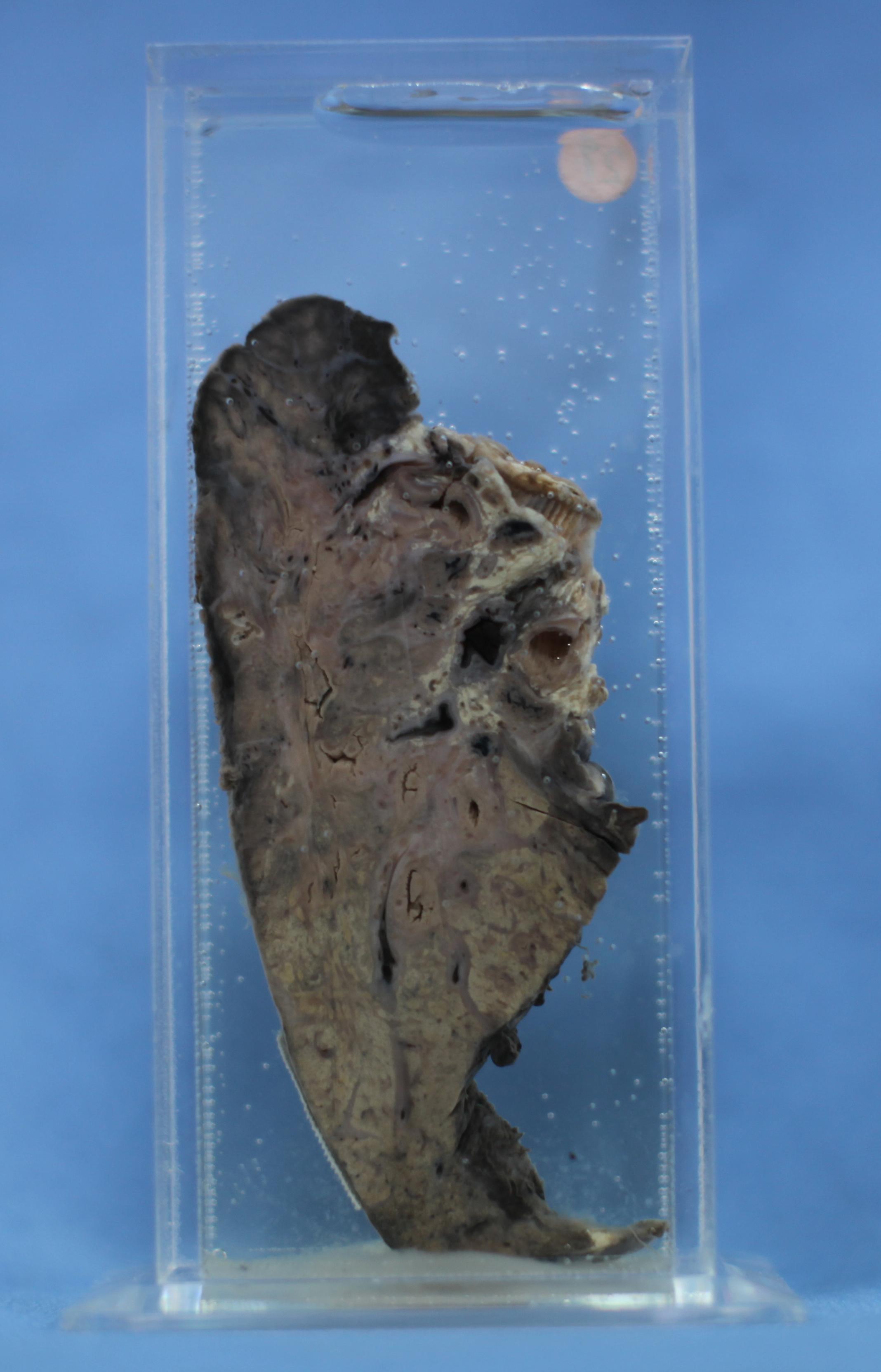 下肺胸膜面见纤维蛋白性渗出和粘连。切面肺组织广泛实化和纤维组织增生,尤以下肺和上肺基底部为著。在上述实化区可见数个囊腔形成,其中充有脓性分泌物。