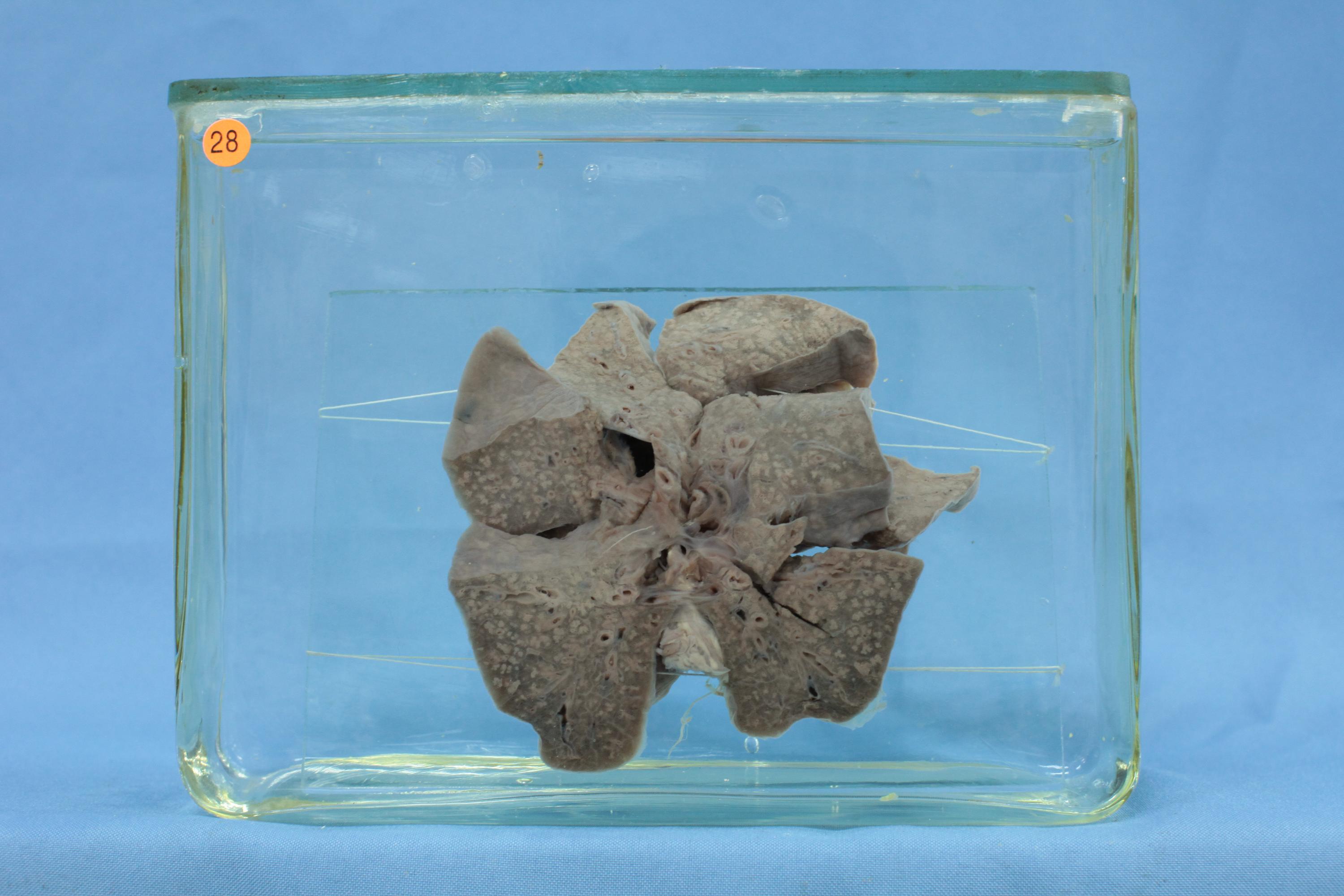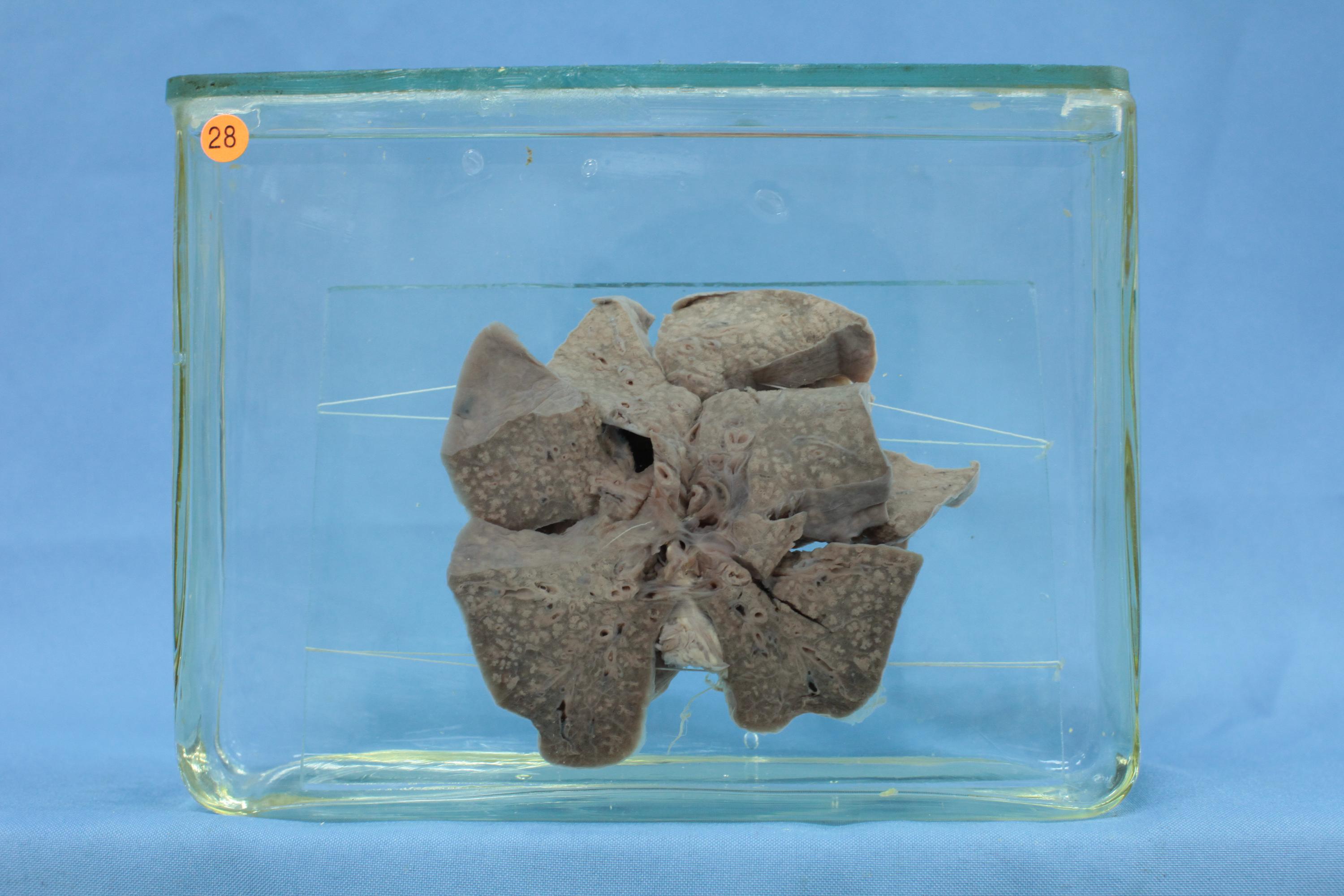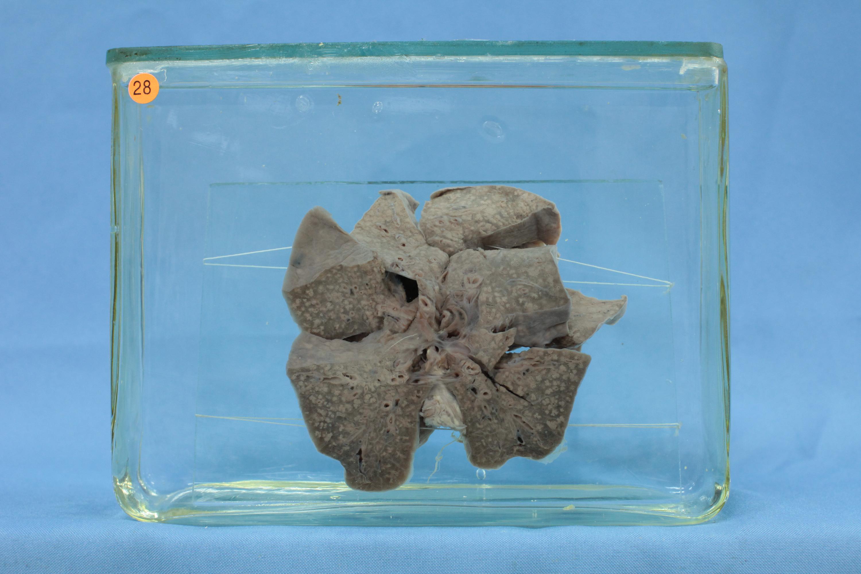 两肺稍饱满,胸膜及肺组织切面均见大量均匀分布的灰白、灰黄色粟粒状病灶。